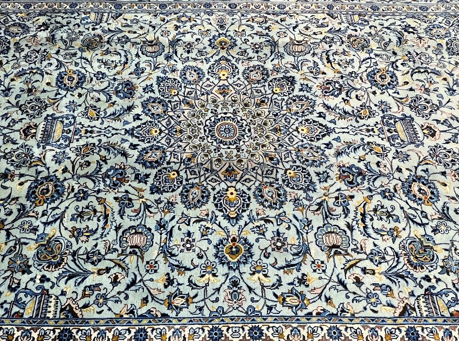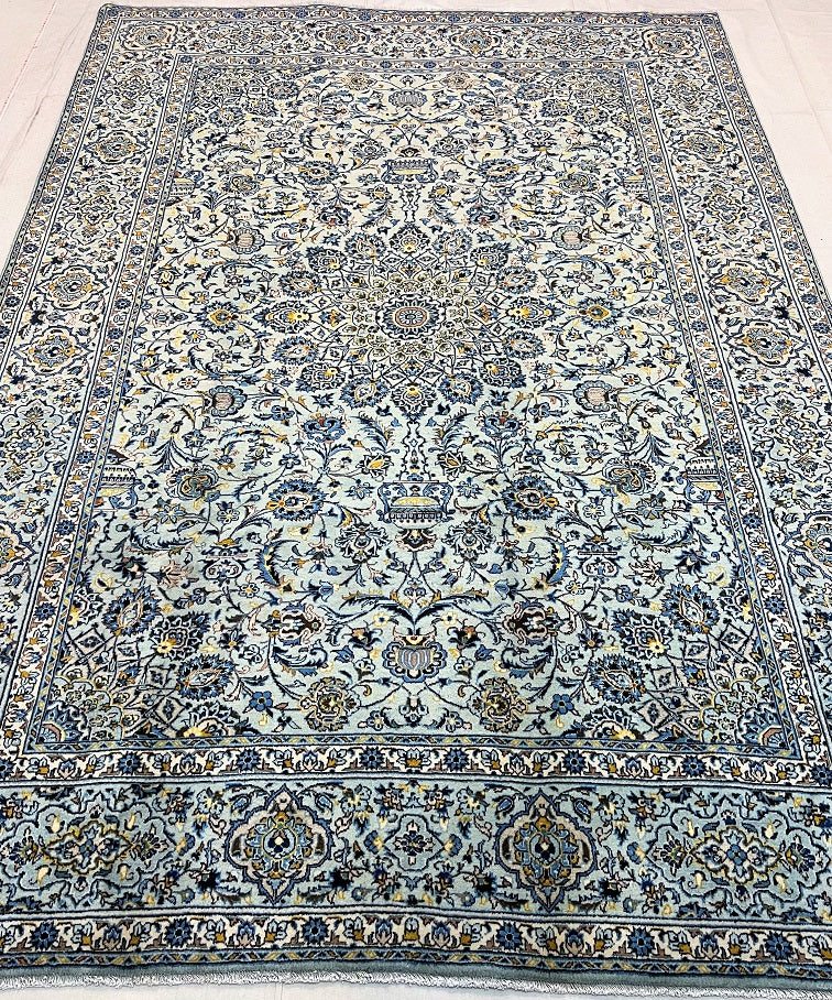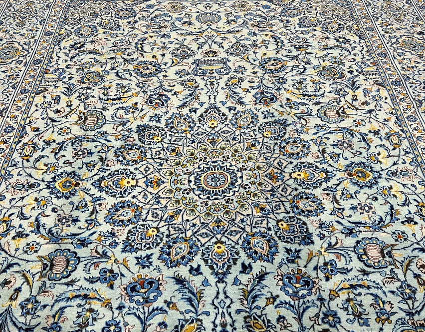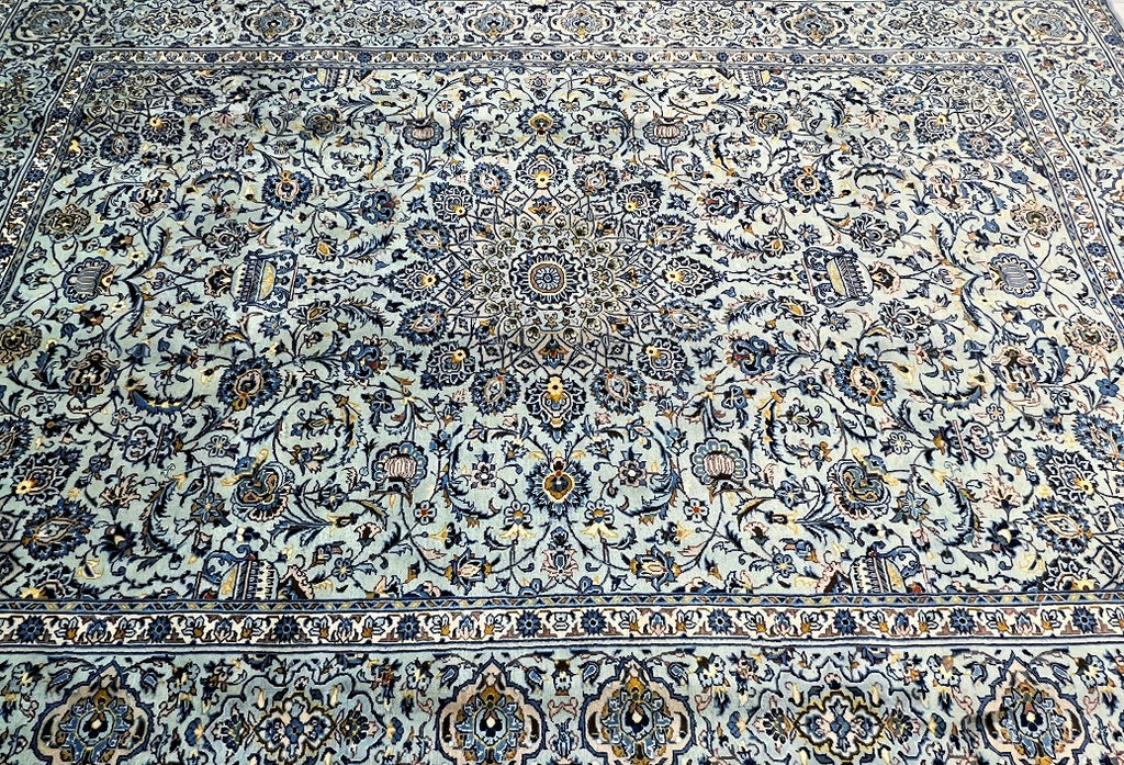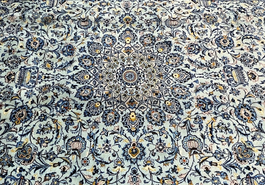 Large Room Size Pistachio Tone Handmade Authentic Persian Kashan Rug. Above All It Is Hard To Get This Quality Original Handmade Rug In This Colour. It Is Also Pure Lamb’s Wool Pile on Cotton Base. Pistachio Green, Blue, Beige And Touch Of Yellow Tone Dyed Using Traditional Methods.