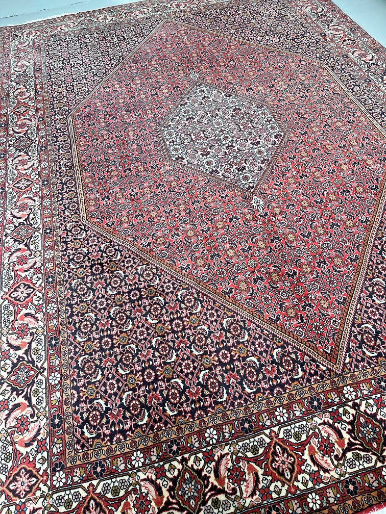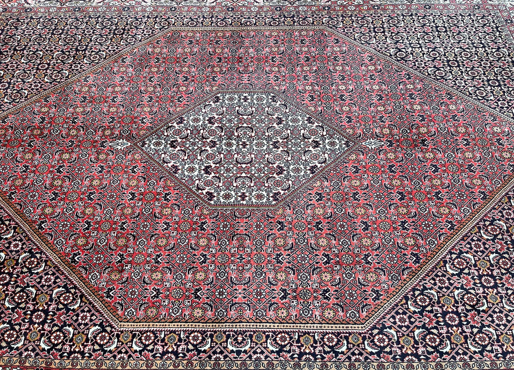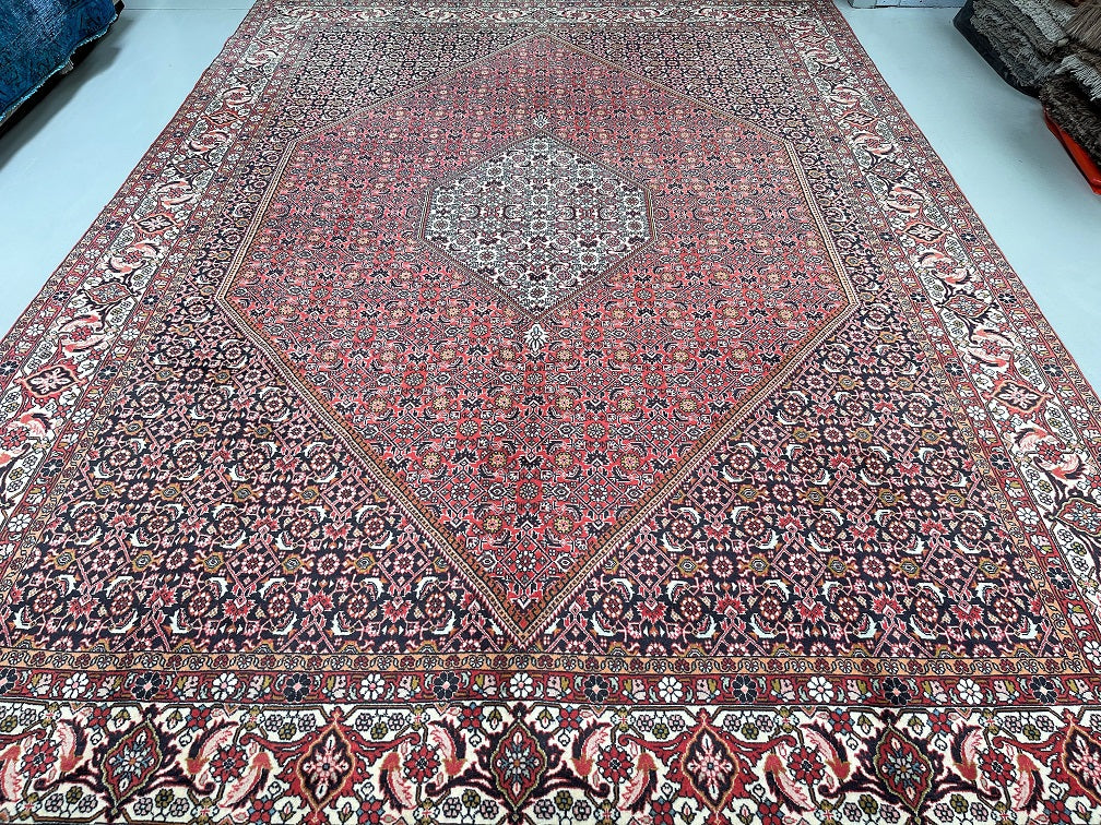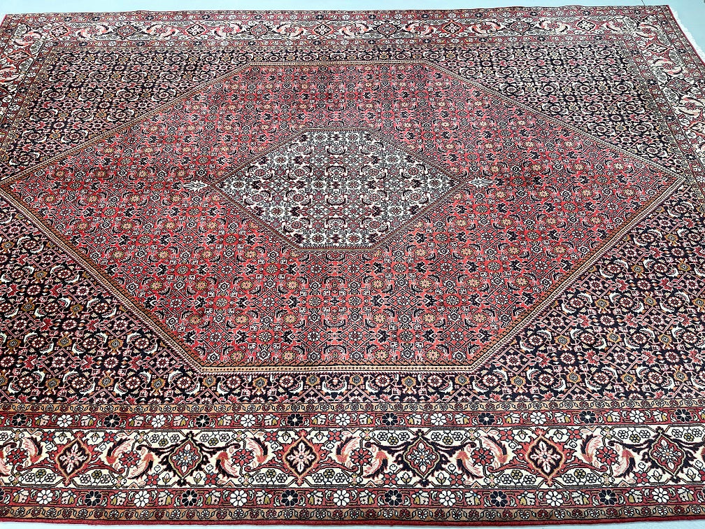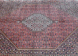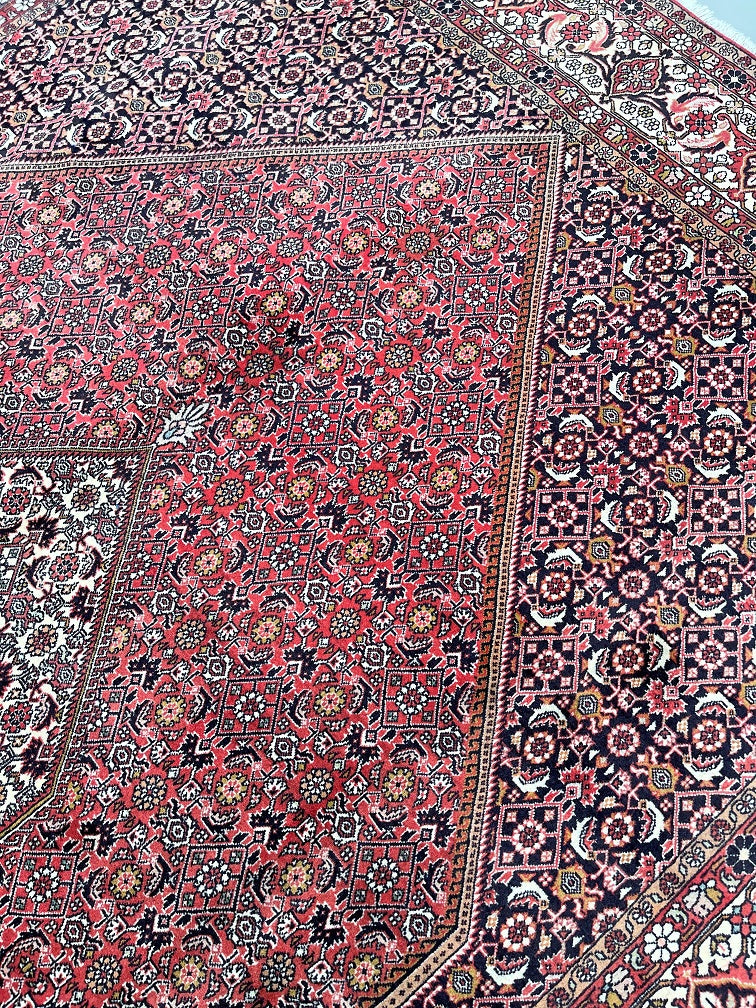 Top Quality Large Room Size Authentic Handmade Persian Bijar Rug. Above All Rugs From This Region Renowned to Be The Iron Carpet Of Persian Rugs. It Is Also Hard To Find This Quality Handmade In Larger Sizes. It Has a Pure Lamb’s Wool Pile on Fine Cotton. Stunning Red, Beige, Black, Blue, Orange And Pink Tone Dyed Using Traditional Methods.