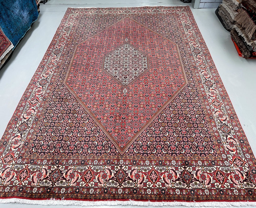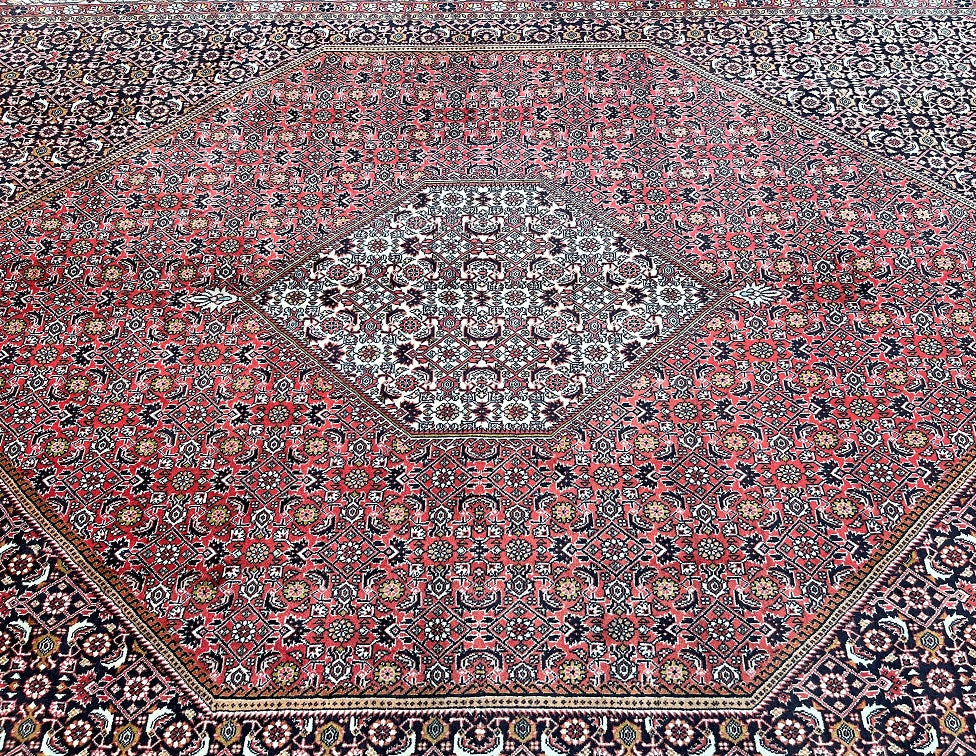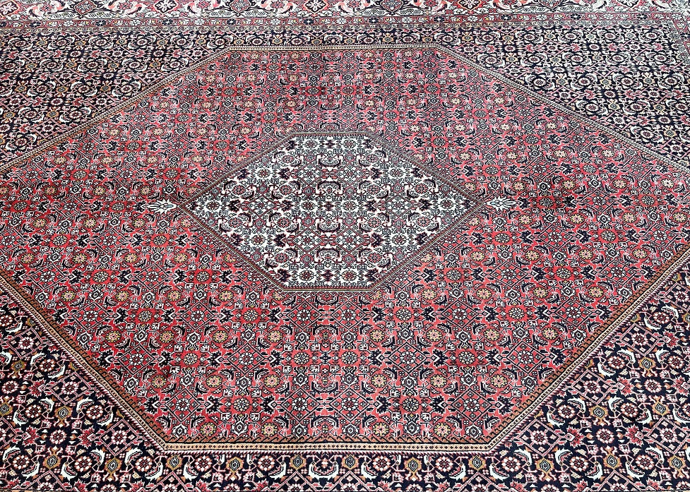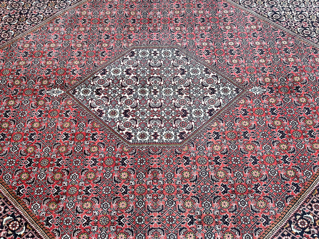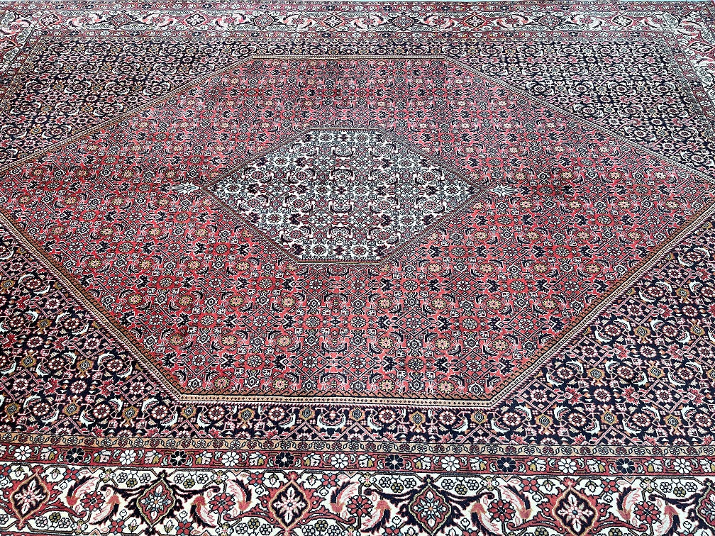 Top Quality Large Room Size Authentic Handmade Persian Bijar Rug. Above All Rugs From This Region Renowned to Be The Iron Carpet Of Persian Rugs. It Is Also Hard To Find This Quality Handmade In Larger Sizes. It Has a Pure Lamb’s Wool Pile on Fine Cotton. Stunning Red, Beige, Black, Blue, Orange And Pink Tone Dyed Using Traditional Methods.