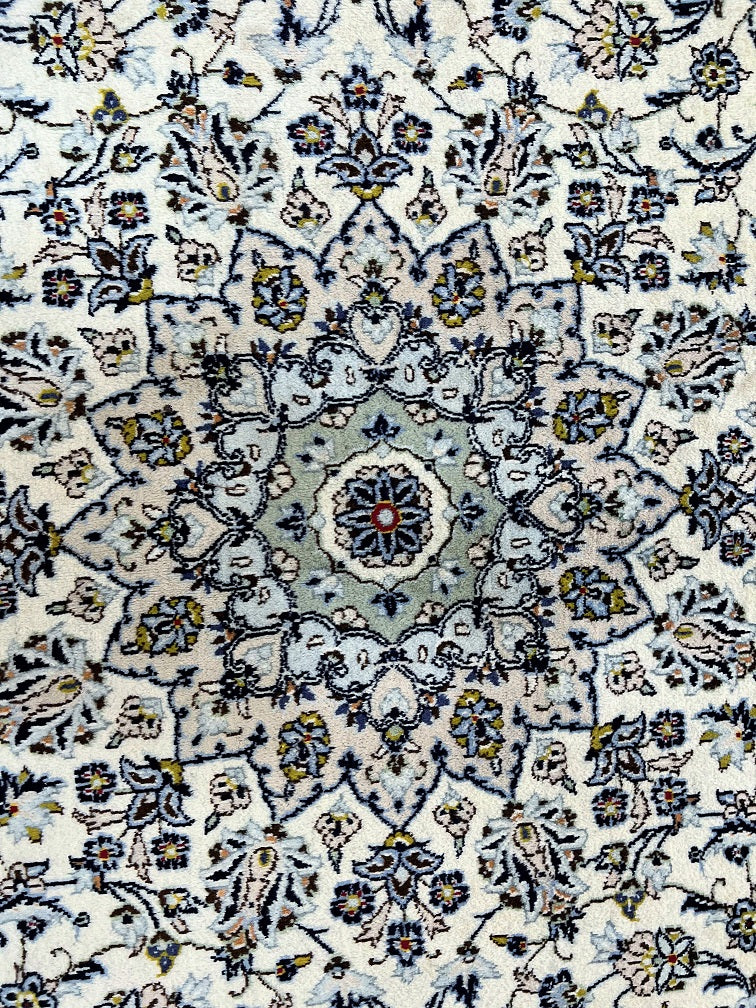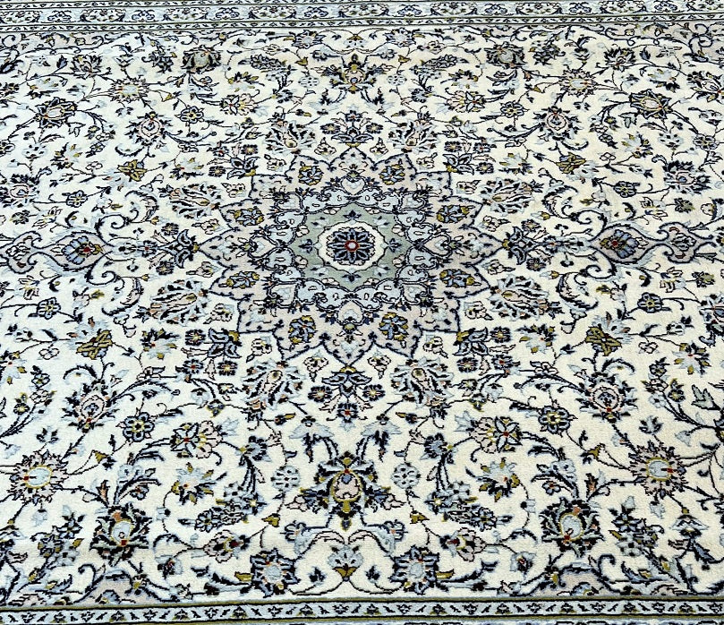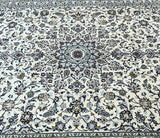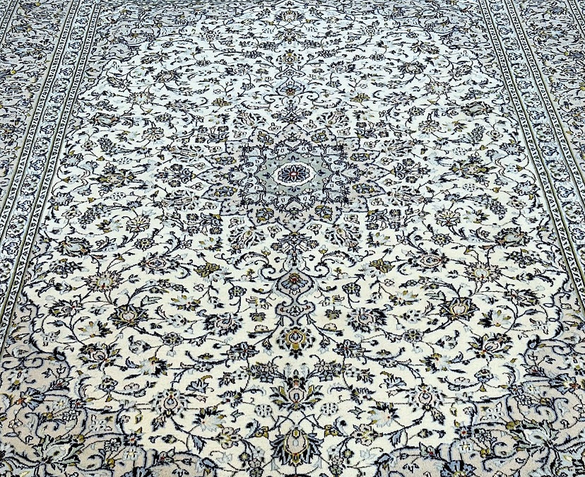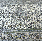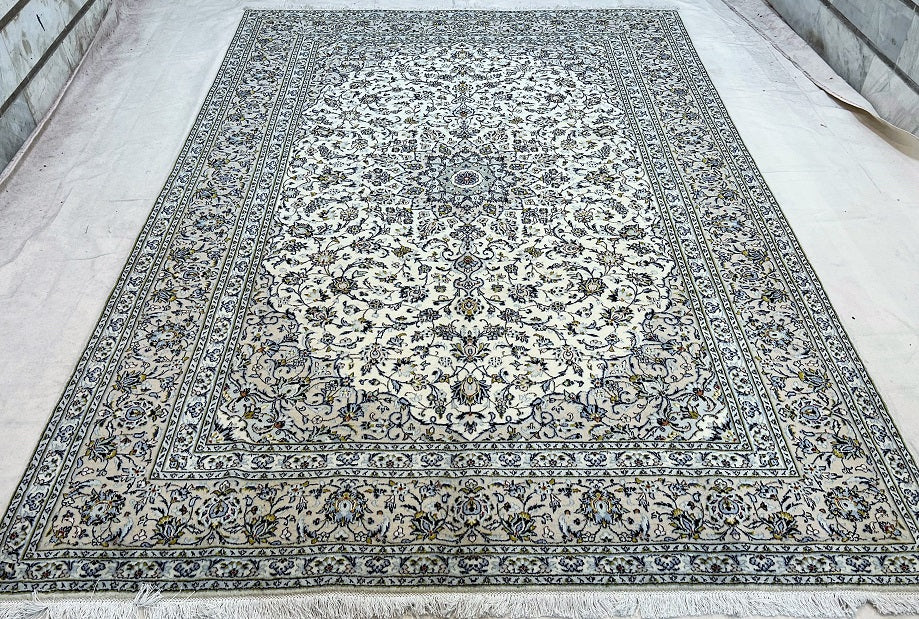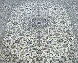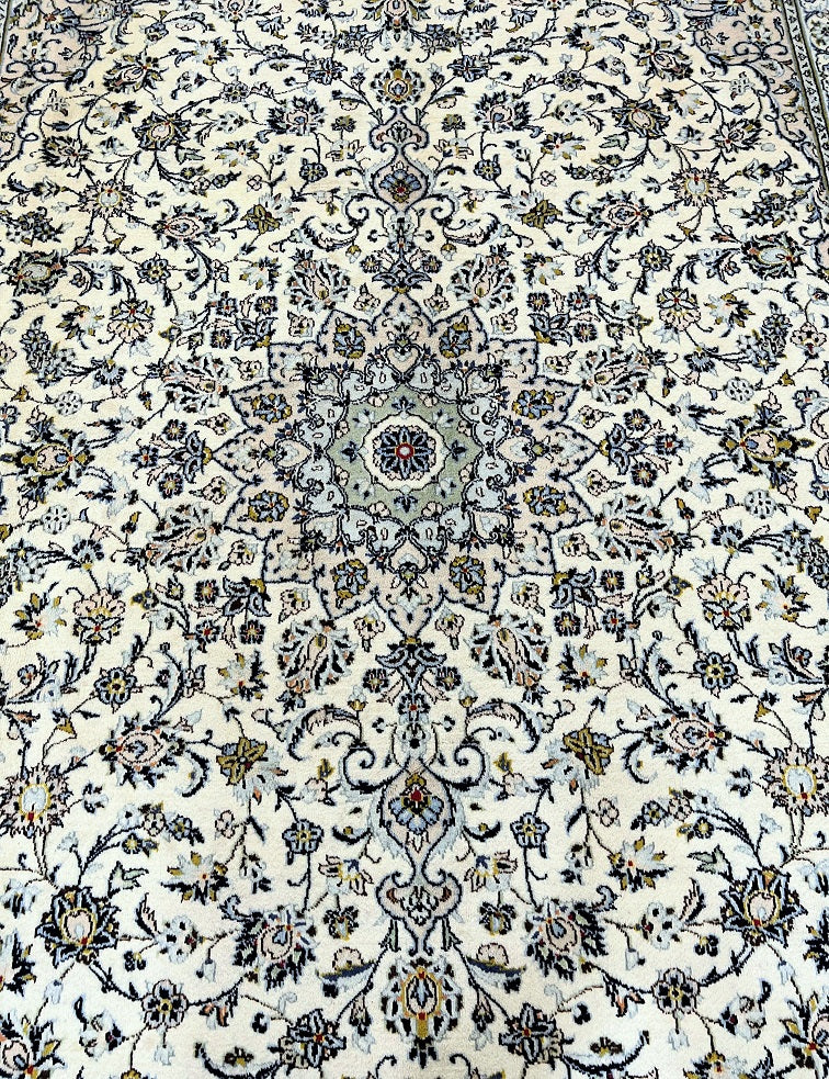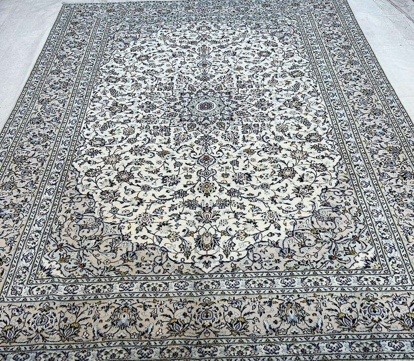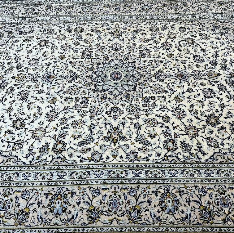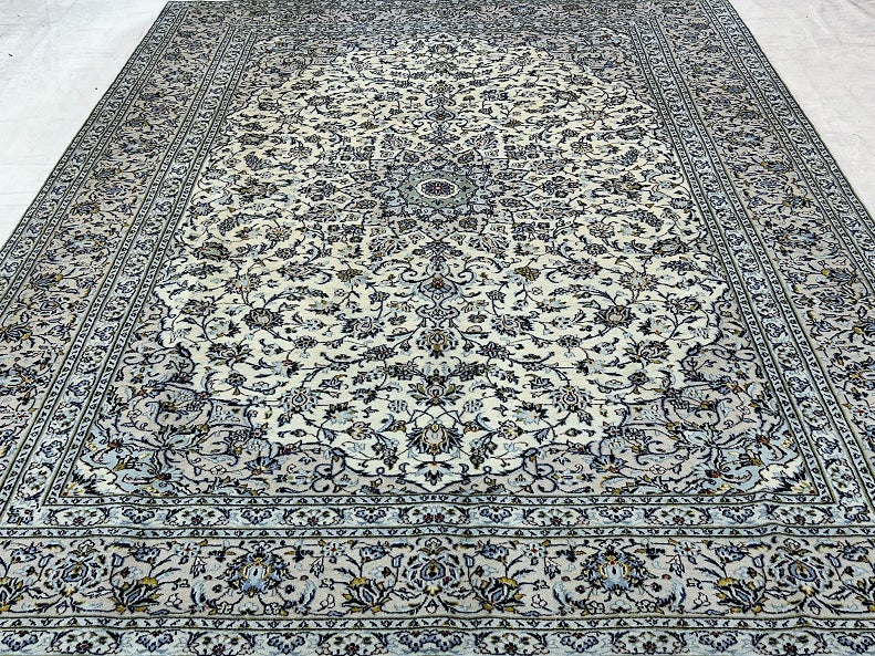 Large Room Size Authentic Handmade Persian Kashan Carpet. Above All It Is Hard To Get This Quality Handmade Rug In This Size And Color. It Also Has A Pure Lamb’s Pile On Cotton Base. Beige, Blue And Green Tone Dyed Using Traditional Methods.