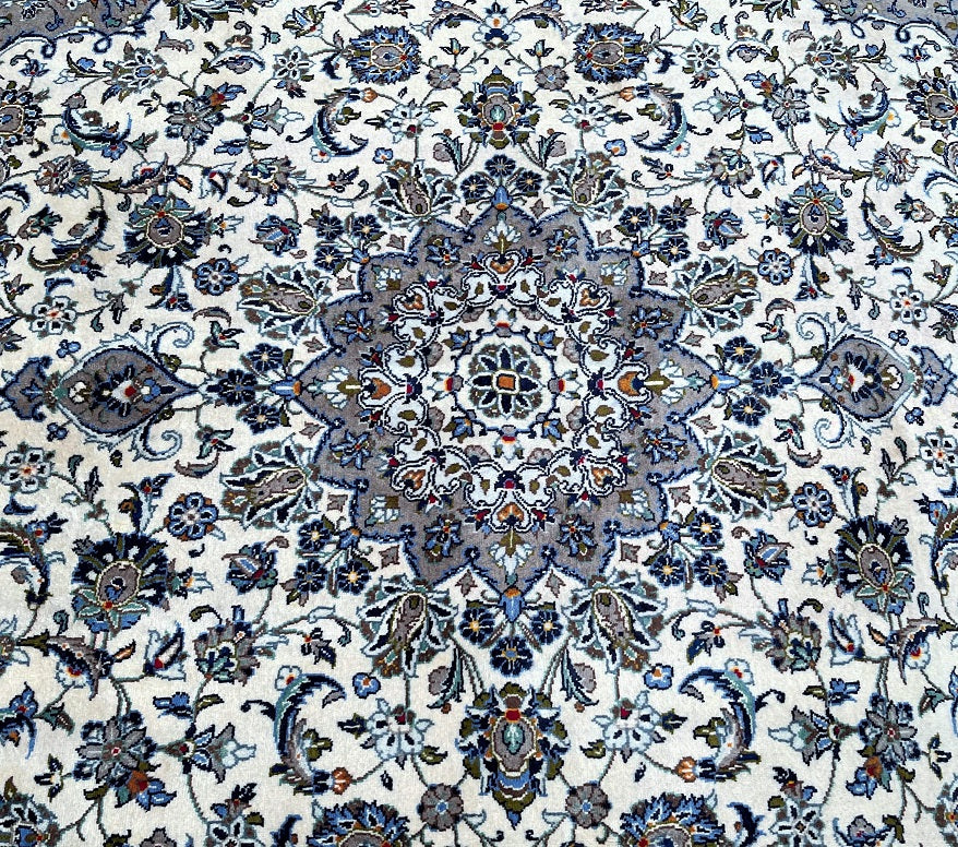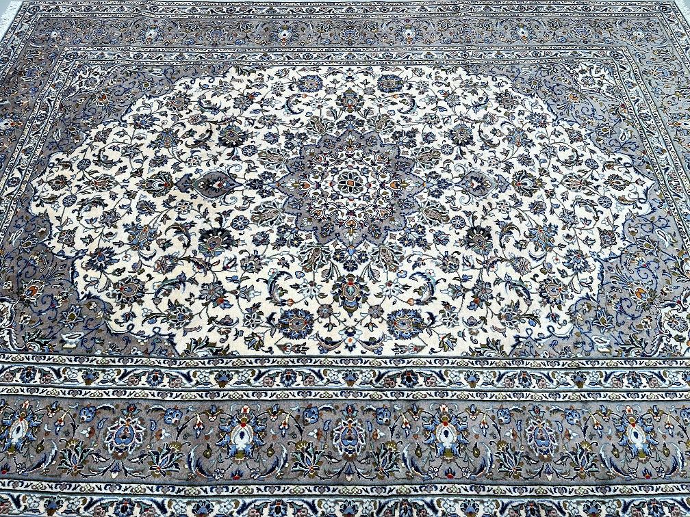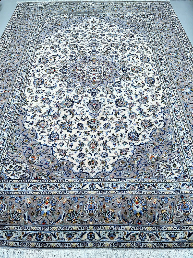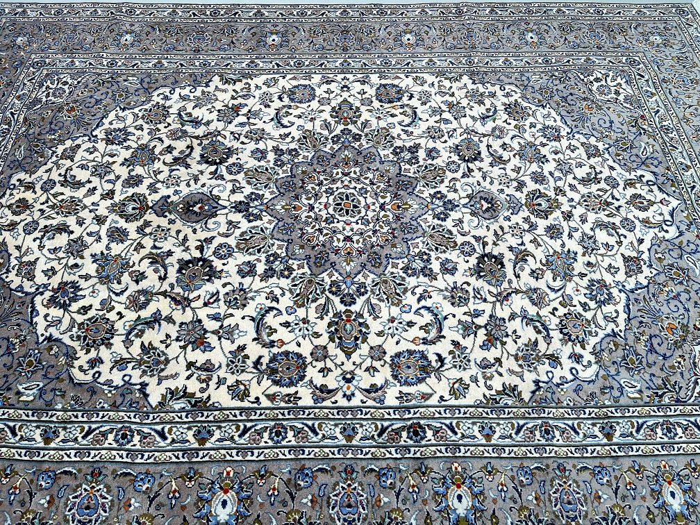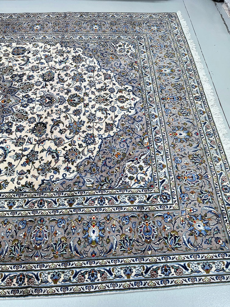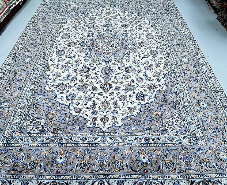 Large Room Size Authentic Handmade Persian Kashan Carpet. Above All It Is Hard To Get This Quality Hand Made Rug In These Colour Tone. It Also Has A Lamb’s Wool Pile On Cotton Base. Beige, Green, Blue With A Touch Of Red And Yellow Tone Dyed Using Traditional Methods.