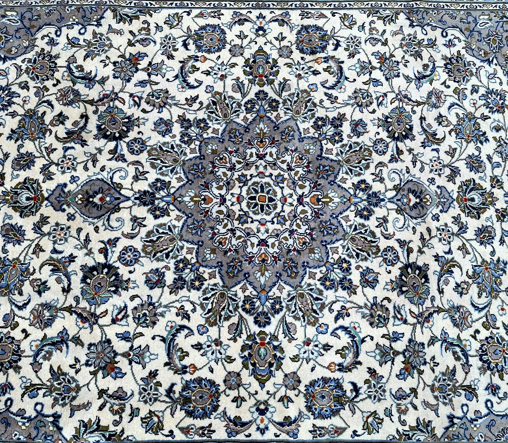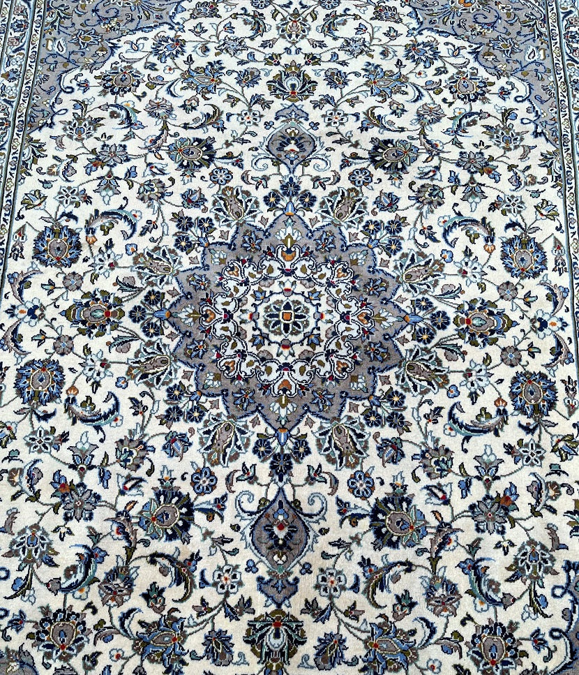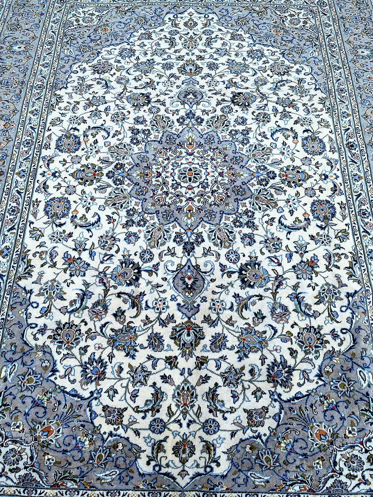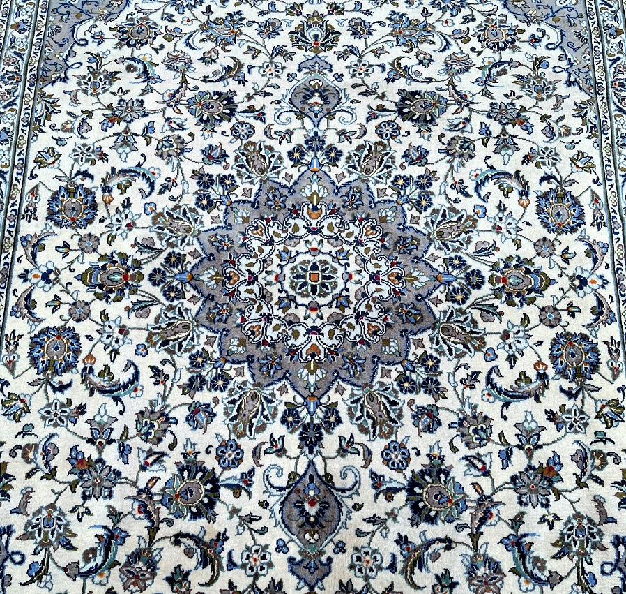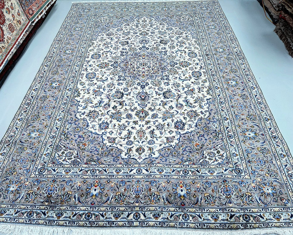 Large Room Size Authentic Handmade Persian Kashan Carpet. Above All It Is Hard To Get This Quality Hand Made Rug In These Colour Tone. It Also Has A Lamb’s Wool Pile On Cotton Base. Beige, Green, Blue With A Touch Of Red And Yellow Tone Dyed Using Traditional Methods.