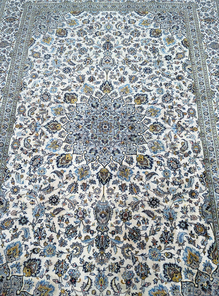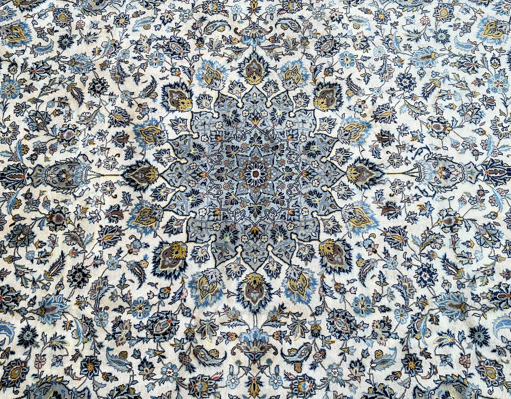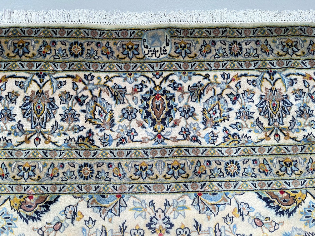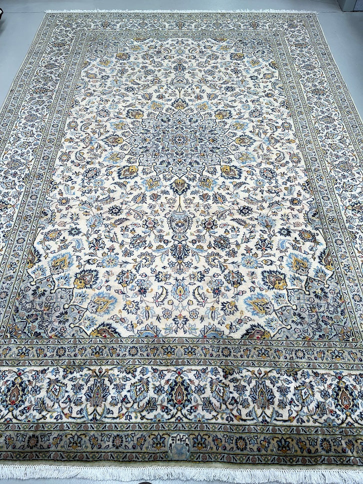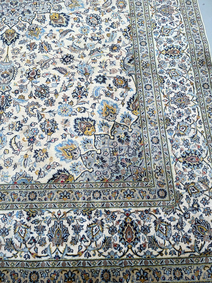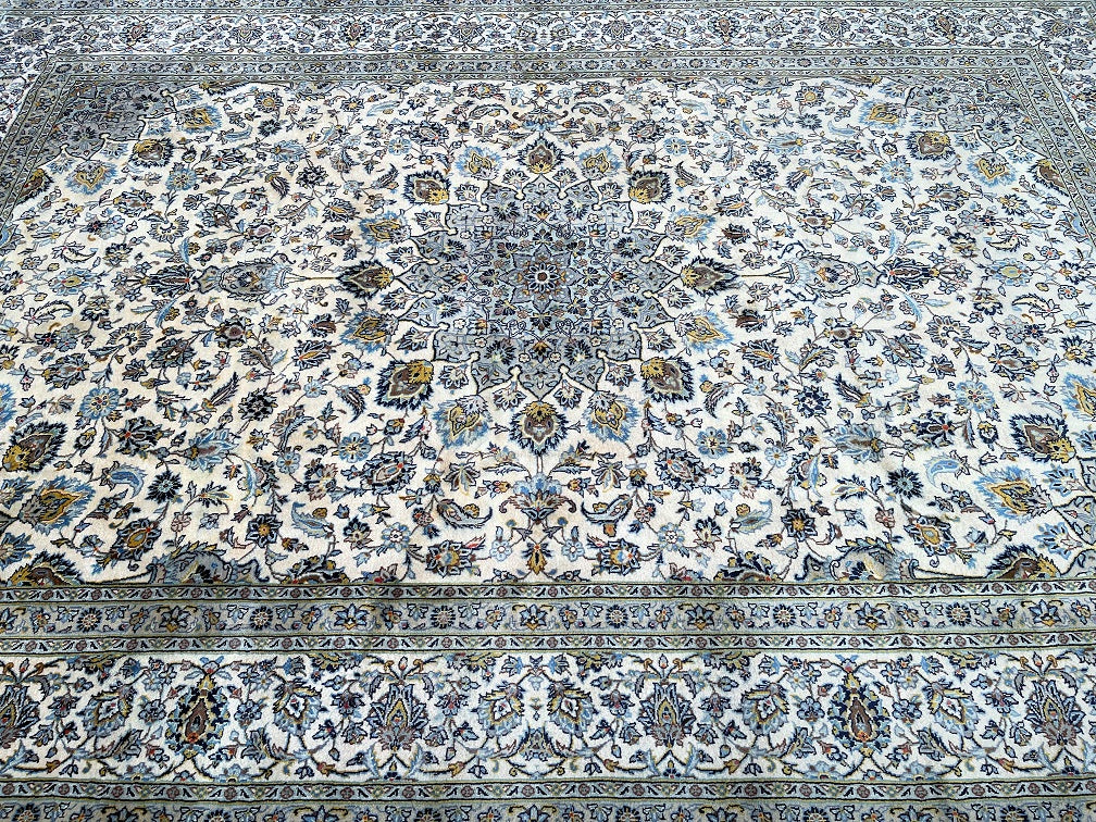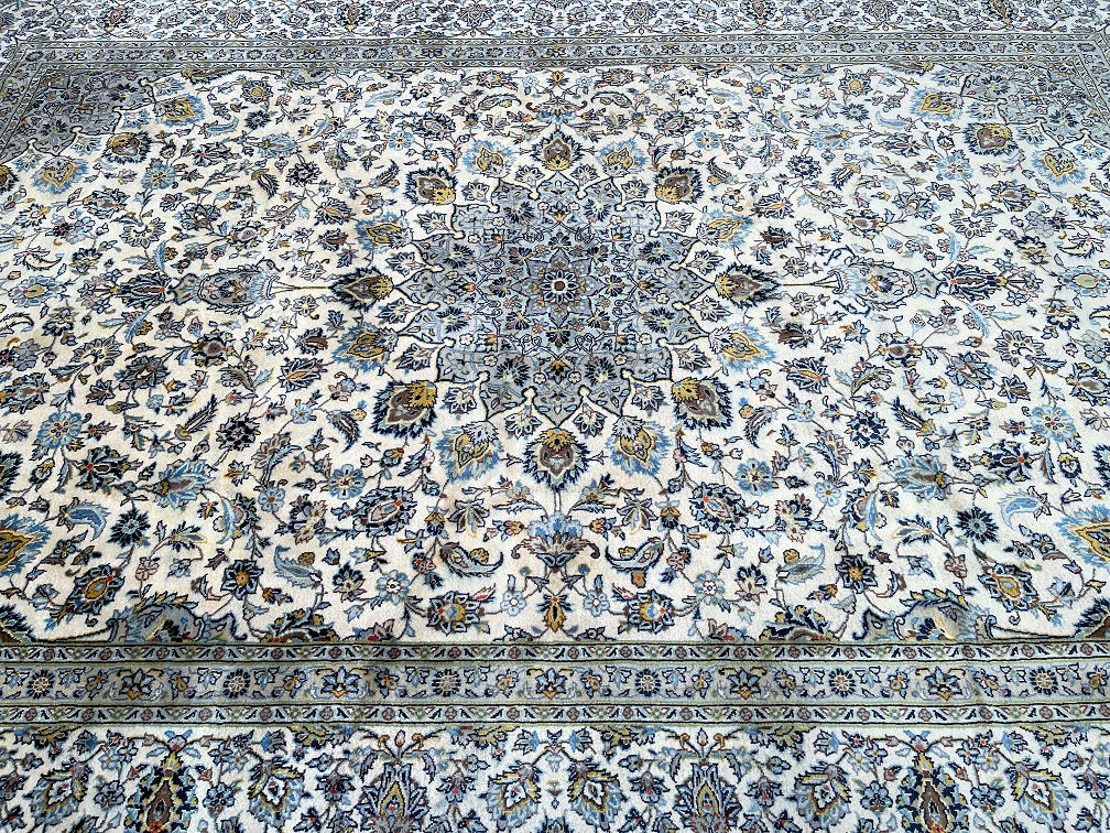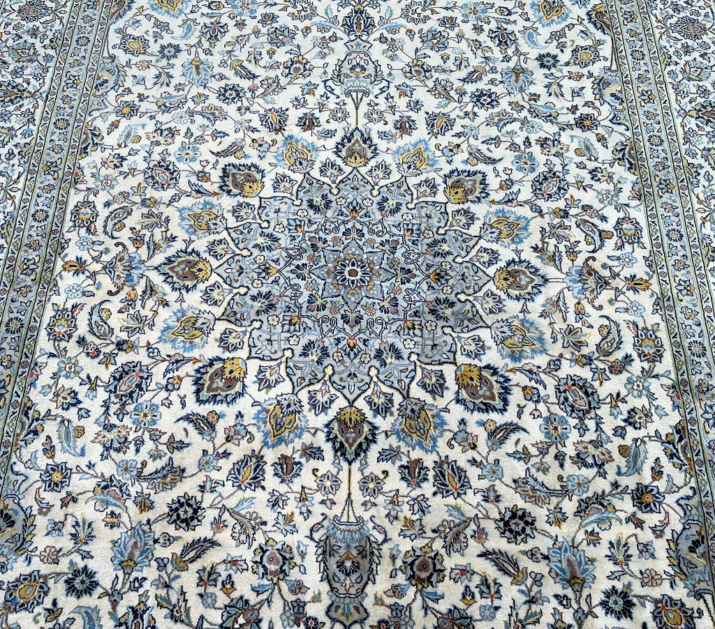 Large Room Size Authentic Hand Knotted Persian Kashan rug Signed. Above All It Has A Fine Lamb’s Wool Pile On Cotton Base. Beige, Indigo Blue, Light Blue, Green And Yellow Tone Dyed Using Traditional Methods. Superb Quality Piece From Weaving House Of “Mah-Kashan”.