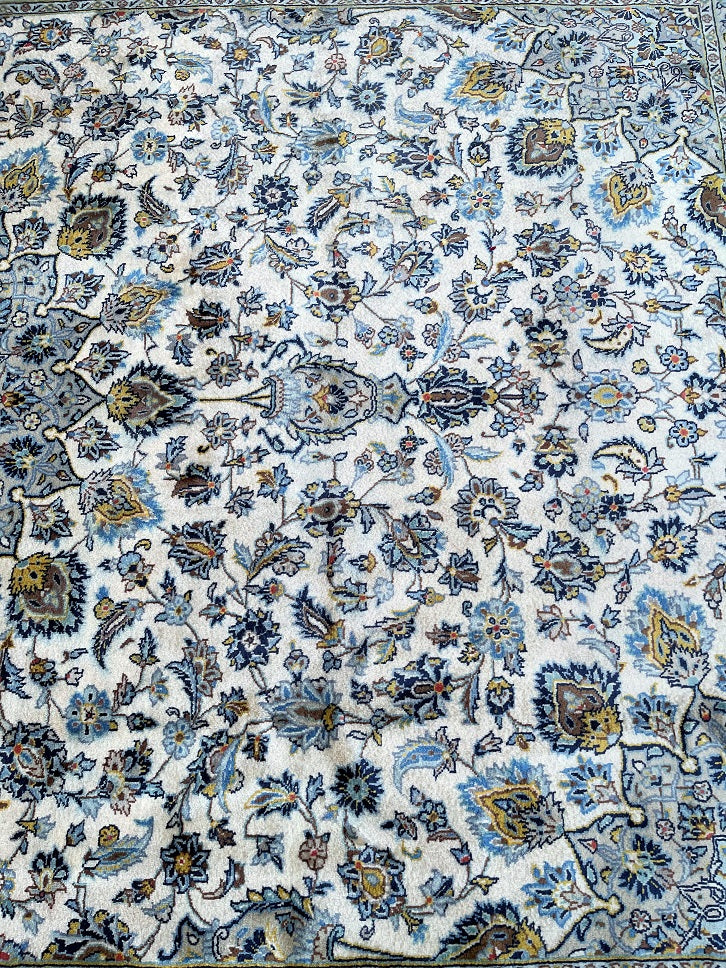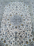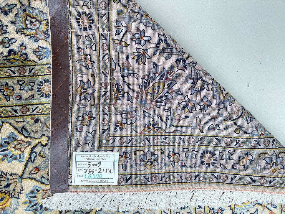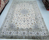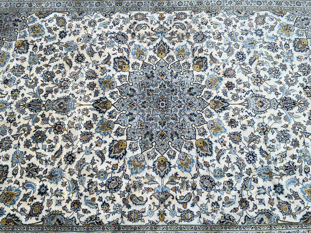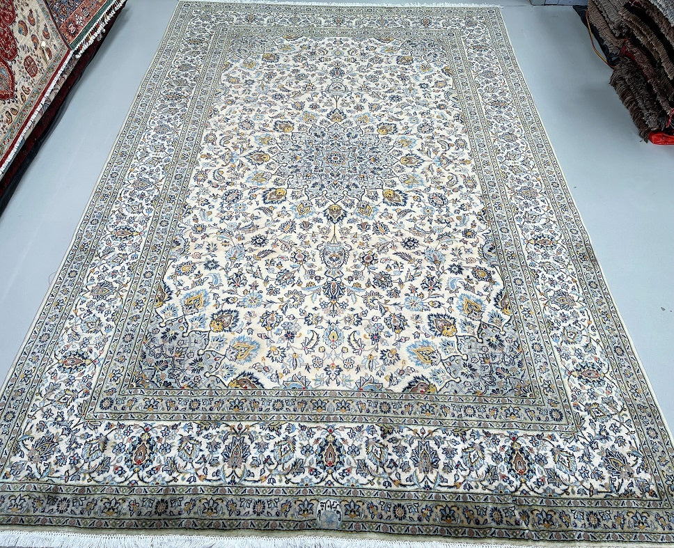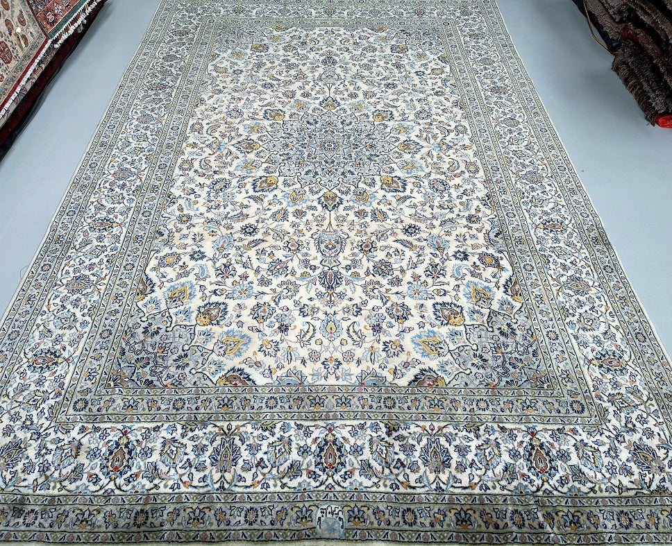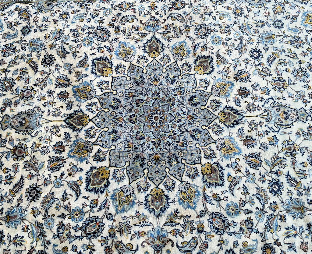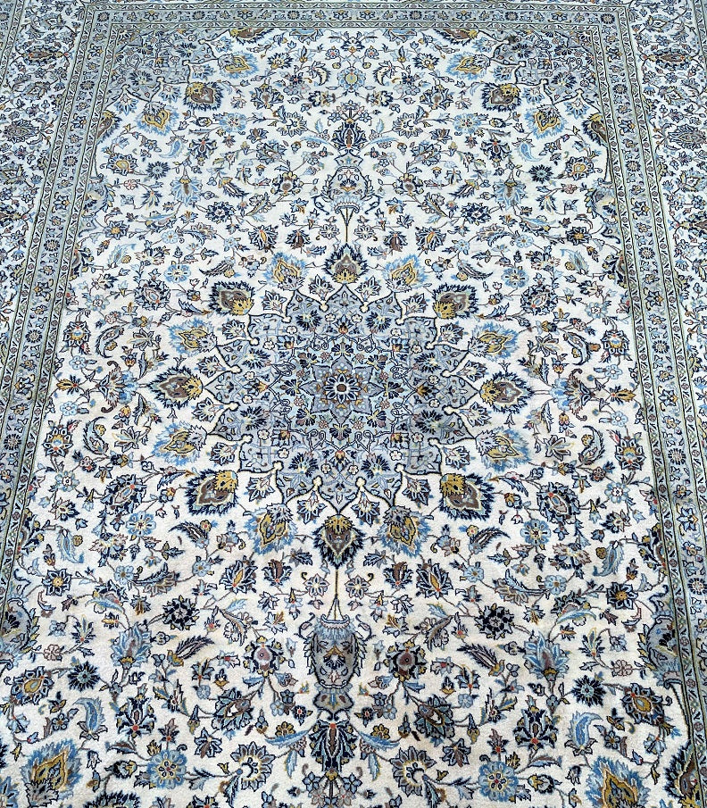 Large Room Size Authentic Hand Knotted Persian Kashan rug Signed. Above All It Has A Fine Lamb’s Wool Pile On Cotton Base. Beige, Indigo Blue, Light Blue, Green And Yellow Tone Dyed Using Traditional Methods. Superb Quality Piece From Weaving House Of “Mah-Kashan”.