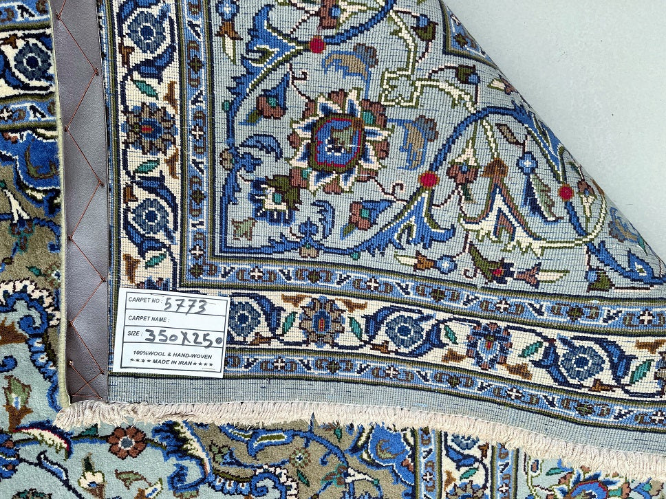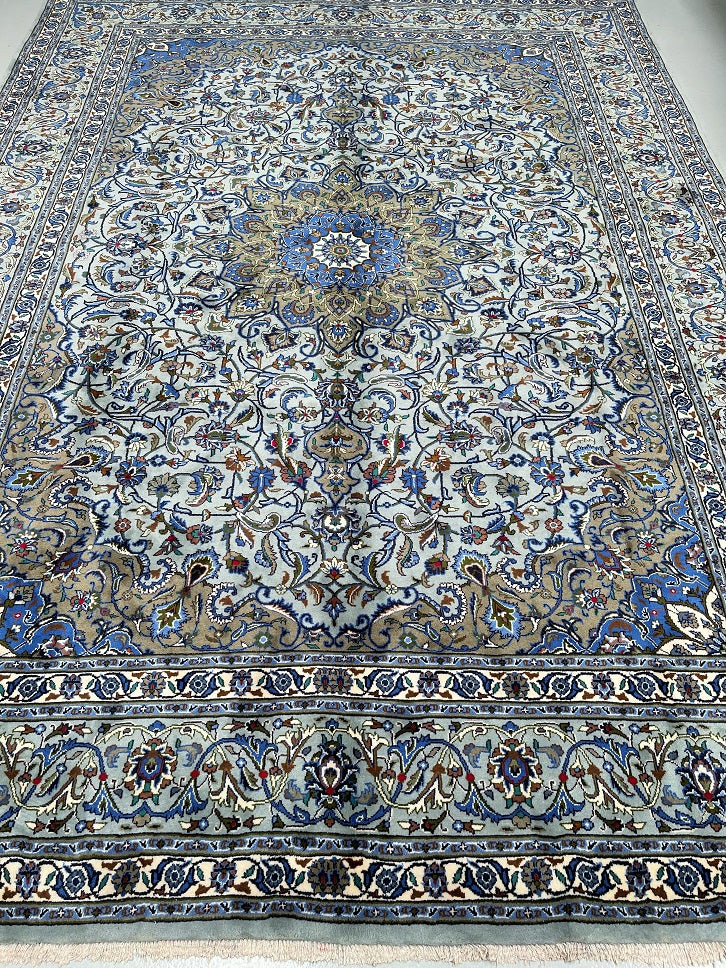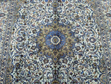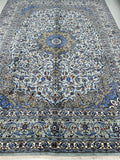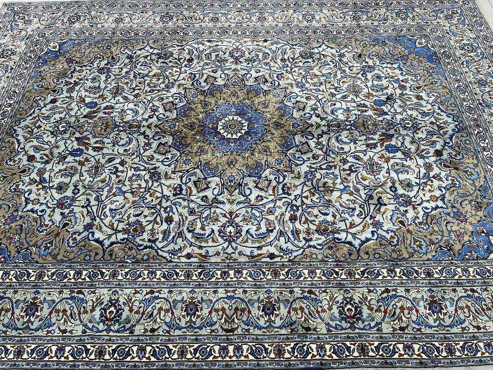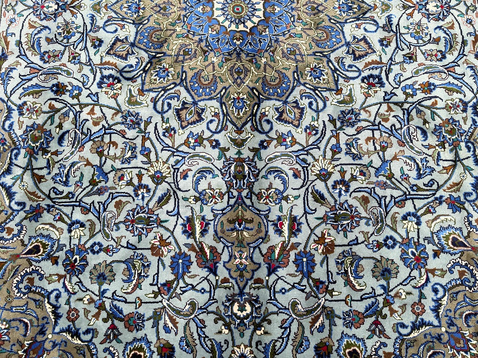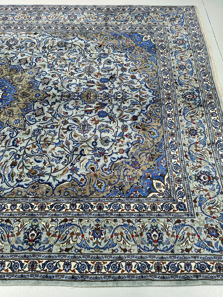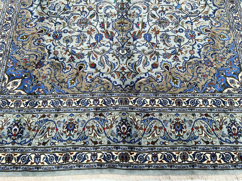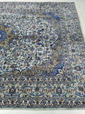 Dense Quality Large Room Size Authentic Handmade Vintage Persian Kashmar Rug. Above All It Is Hard To Get This Quality Hand Made Rug In Larger Sizes. It Also Has A Pure Lamb’s Wool Pile On Cotton Base. Blues, Beige, Brown With Hint Of Pistachio Green Tone Dyed Using Traditional Methods.
