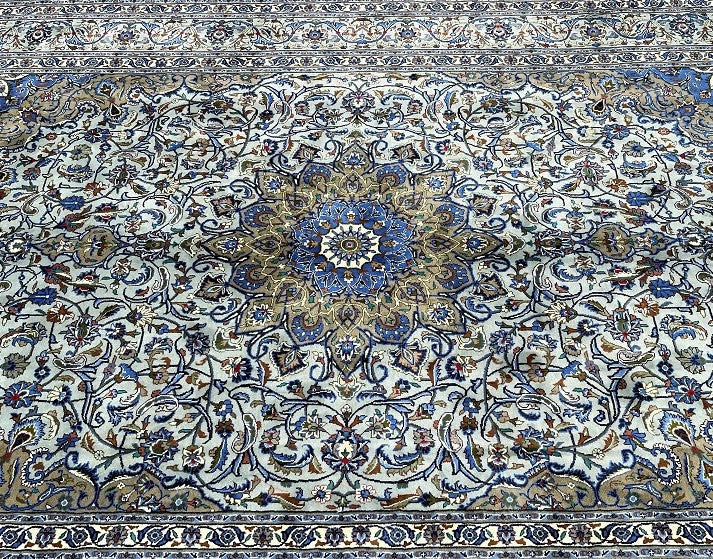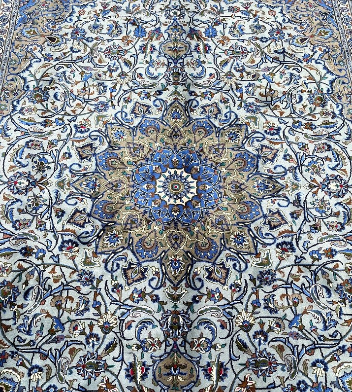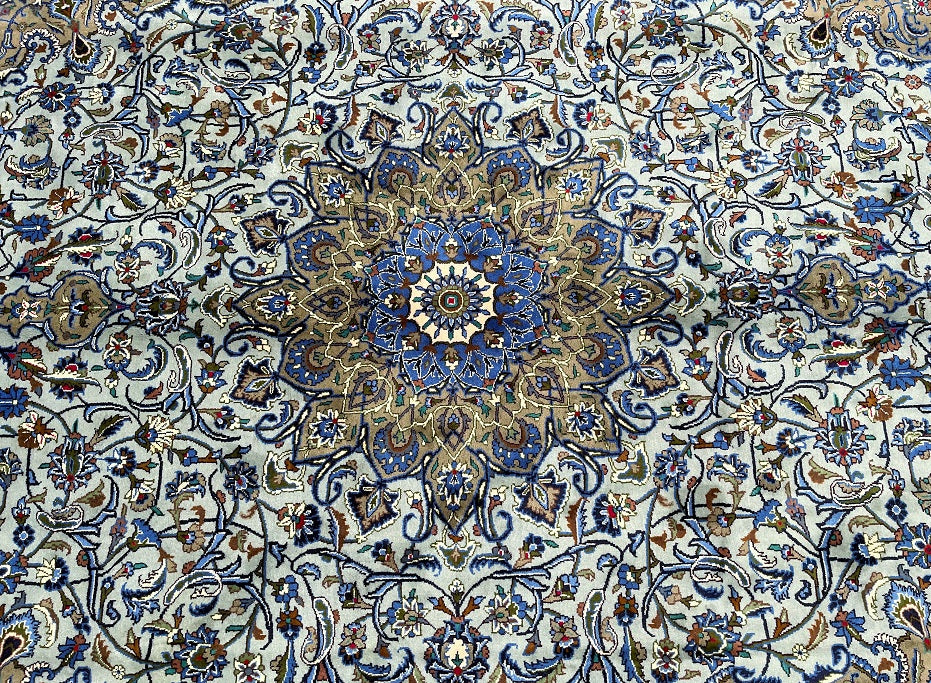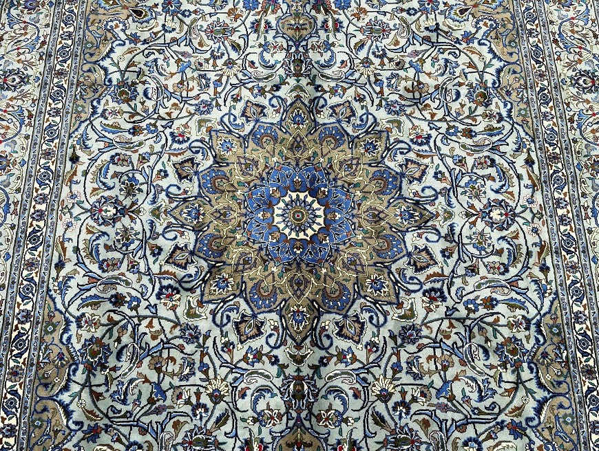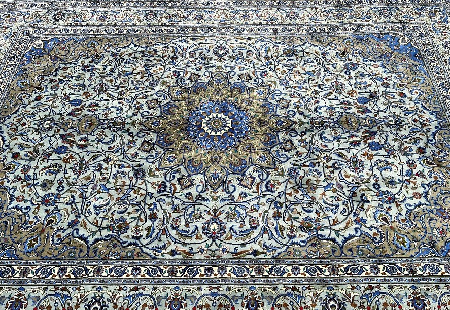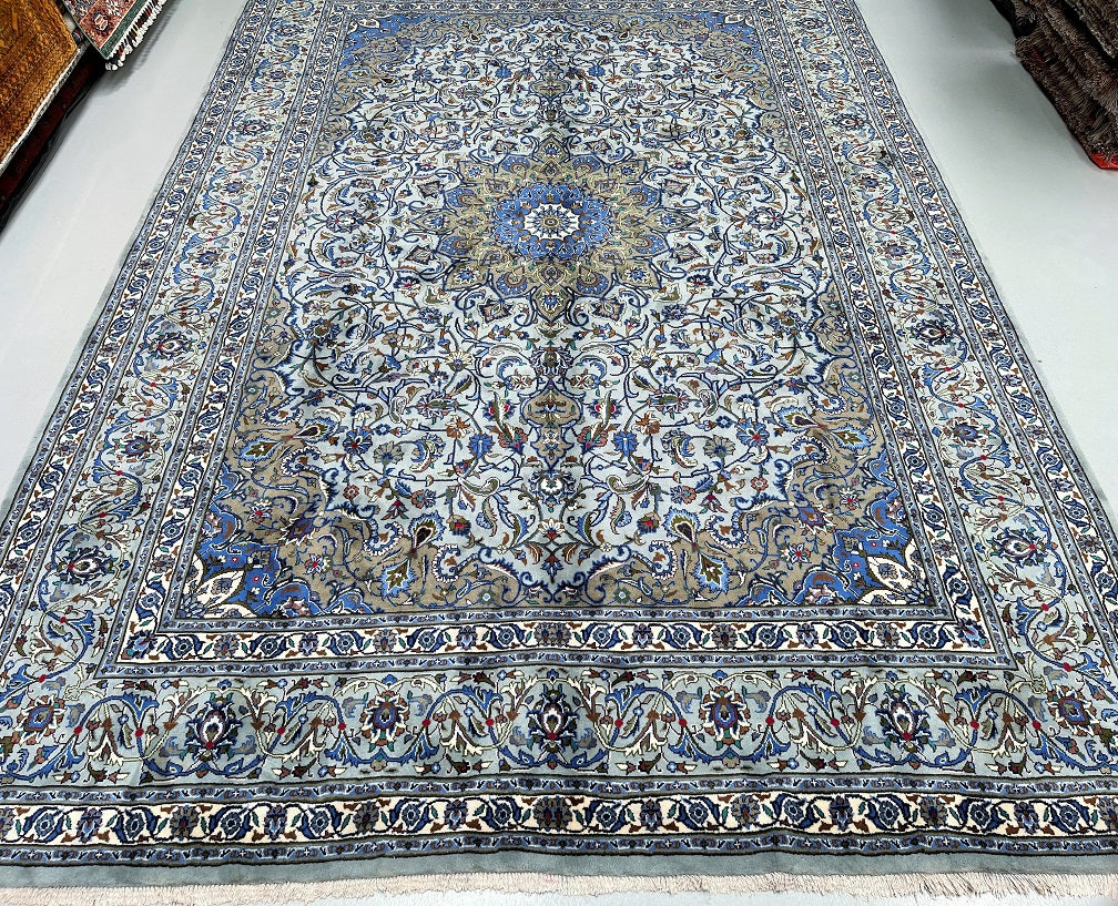 Dense Quality Large Room Size Authentic Handmade Vintage Persian Kashmar Rug. Above All It Is Hard To Get This Quality Hand Made Rug In Larger Sizes. It Also Has A Pure Lamb’s Wool Pile On Cotton Base. Blues, Beige, Brown With Hint Of Pistachio Green Tone Dyed Using Traditional Methods.