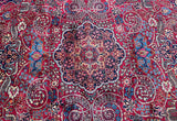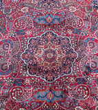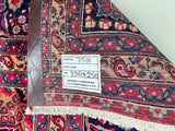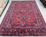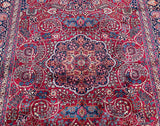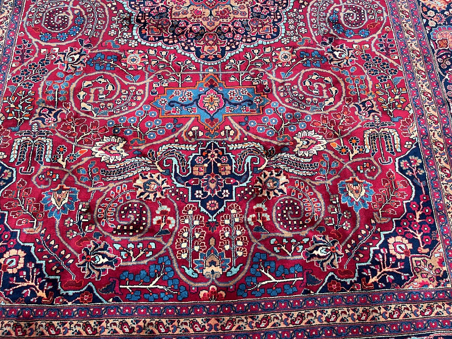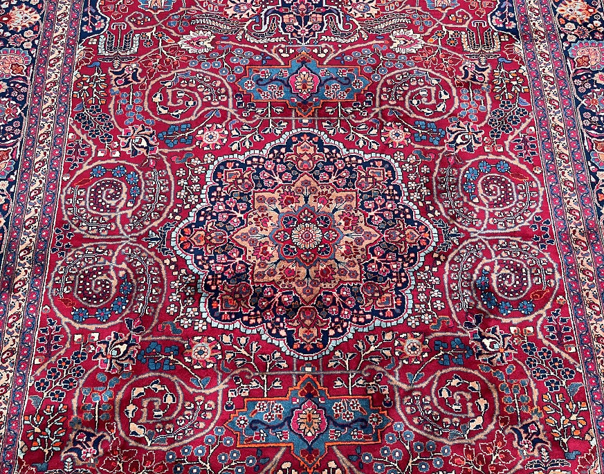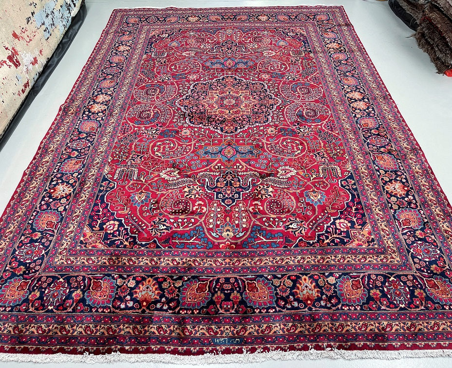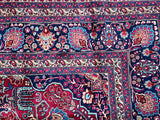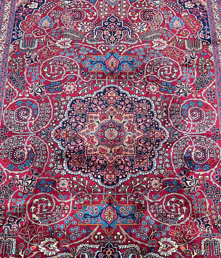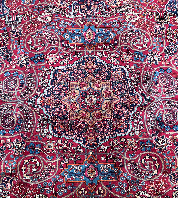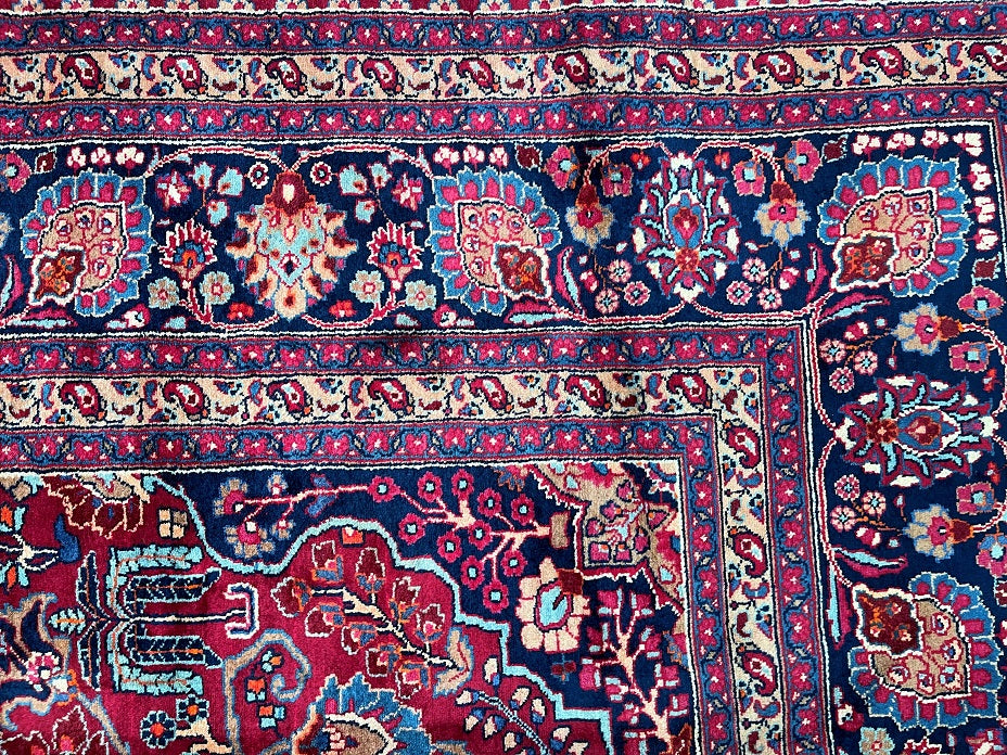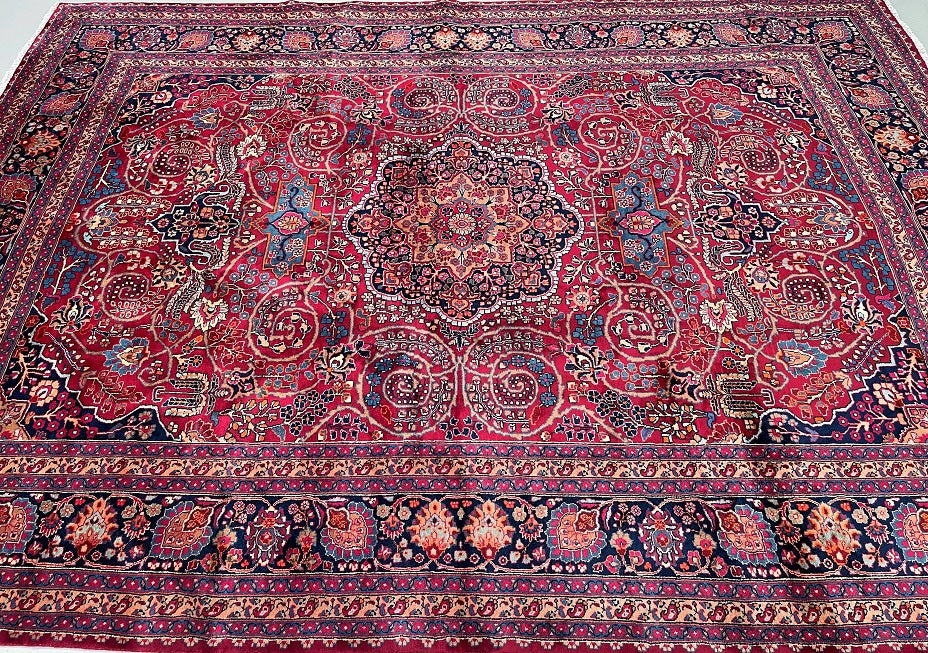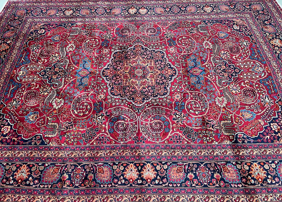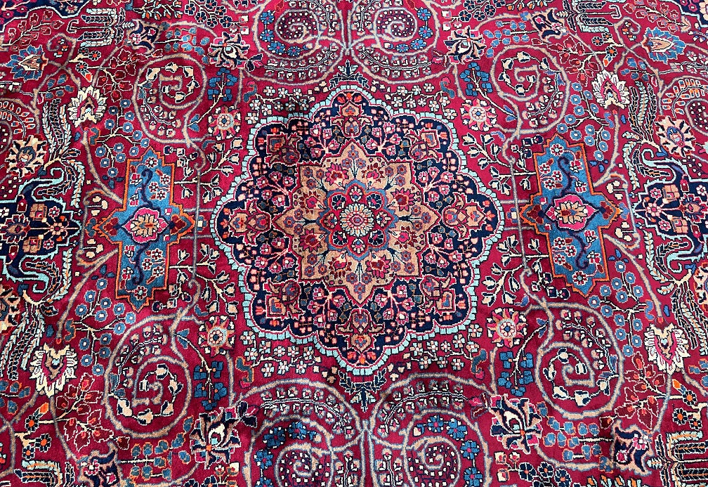 Authentic Handmade Persian Mashad Carpet: This large room-sized carpet features a unique Arabesque or Mahvelat pattern. It is made with a pure lamb's wool pile on a cotton base, dyed using traditional methods in shades of red/maroon, pink, blues, beige, brown, and orange. The central medallion showcases a scrolling floral design, renowned as Arabesque. It is hand-woven in the city of Mashad in East Persia and measures 350 x 250 cm. This exquisite piece would have taken two weavers approximately 12 months to complete. Its gallery replacement value is estimated at $7900.