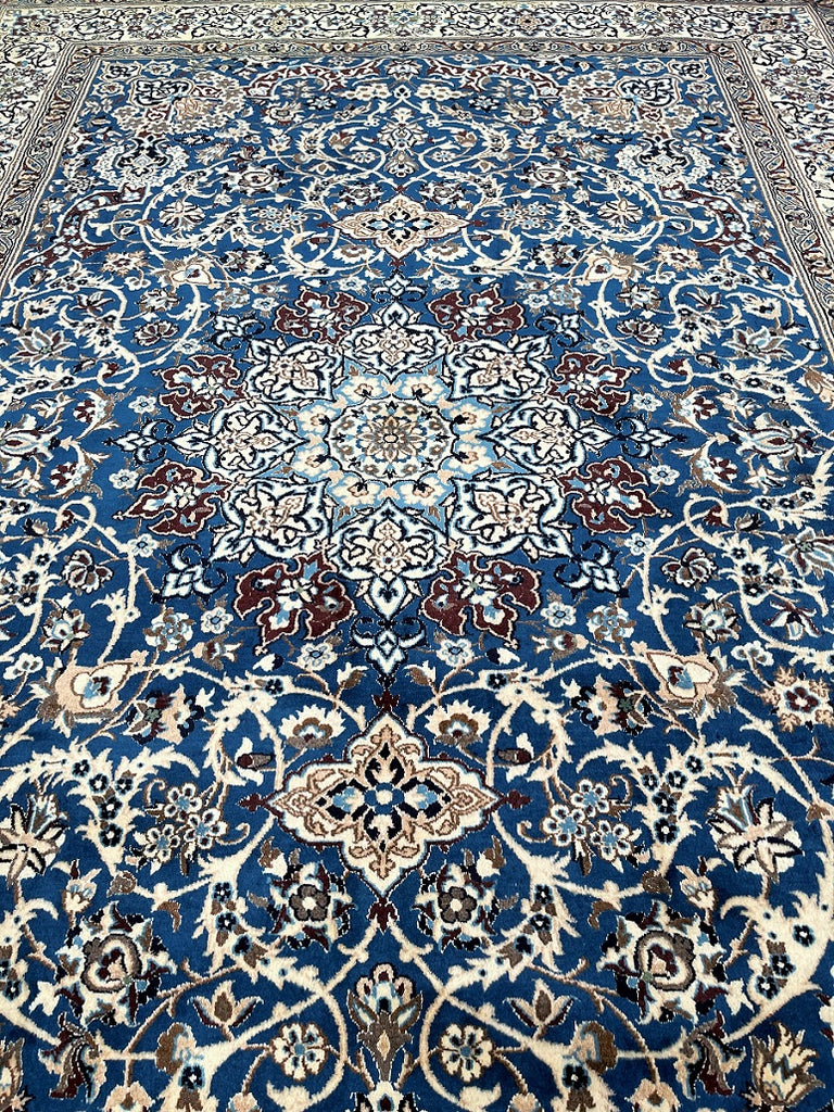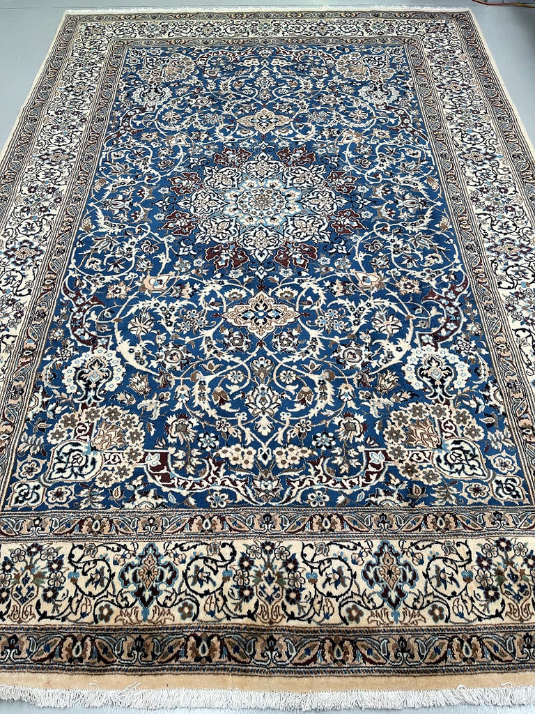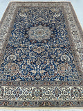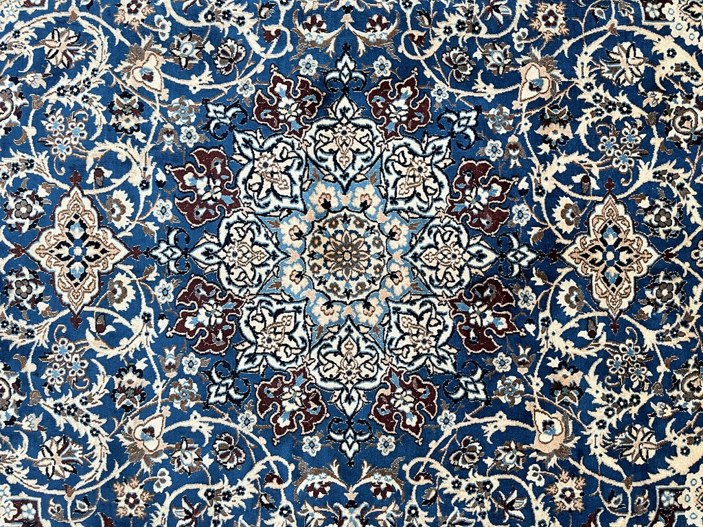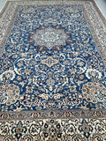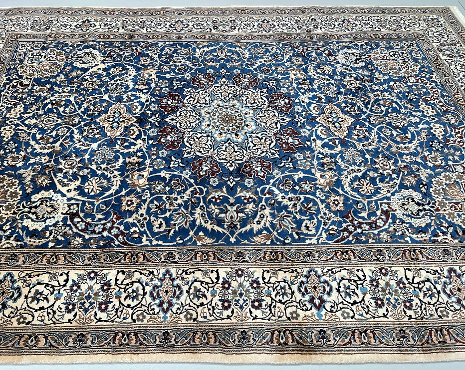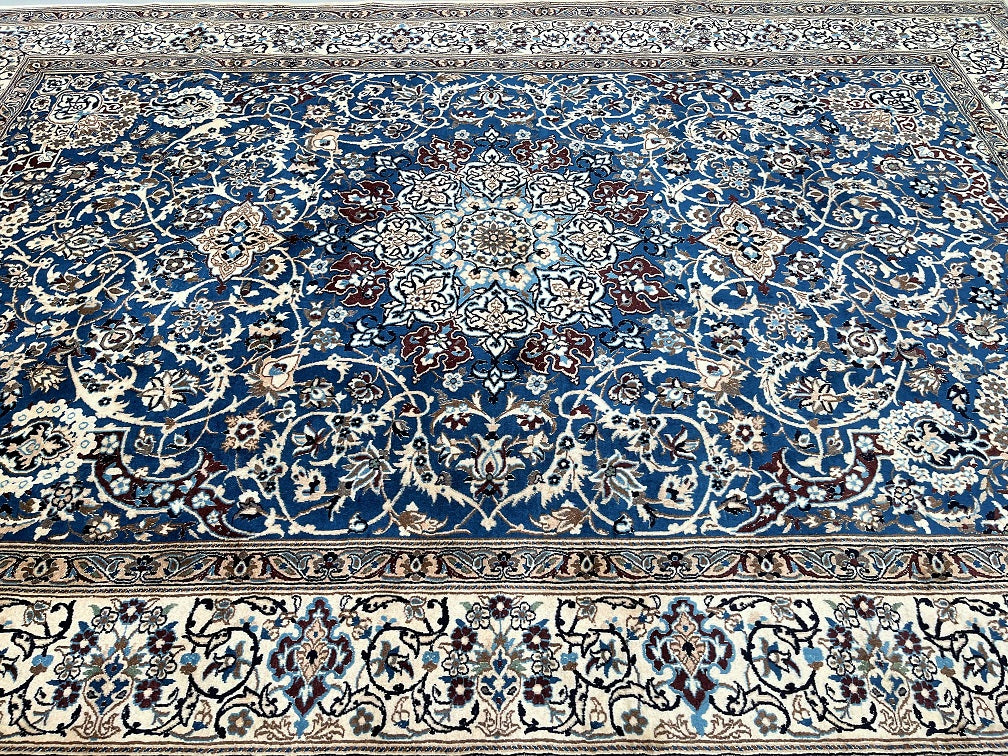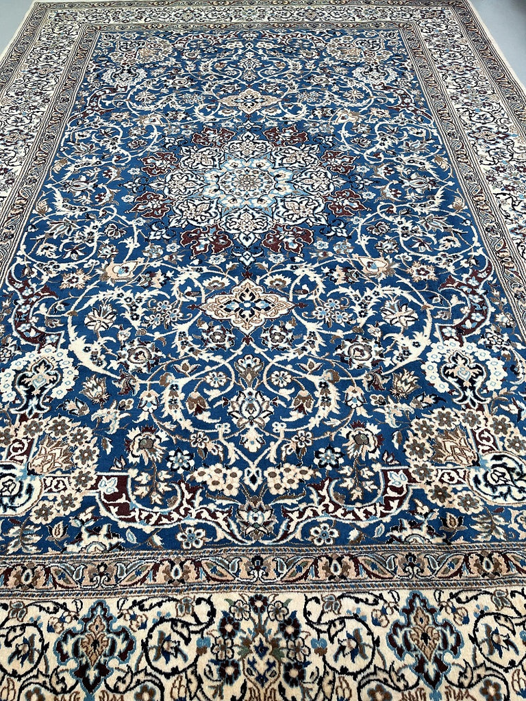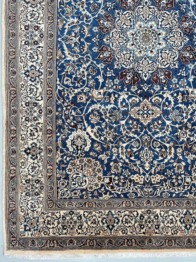 Fine Large Room Size Authentic Handmade Vintage Persian Nain Carpet. Above All It Is Hard To Get This Quality Hand Made Rug In Larger Sizes. Lamb’s Wool With Silk Highlights Pile On Cotton Base. It Also Has A Blue, Beige, Brown And Burgundy Tone Dyed Using Traditional Methods. Stunning Central Medallion Floral Design.