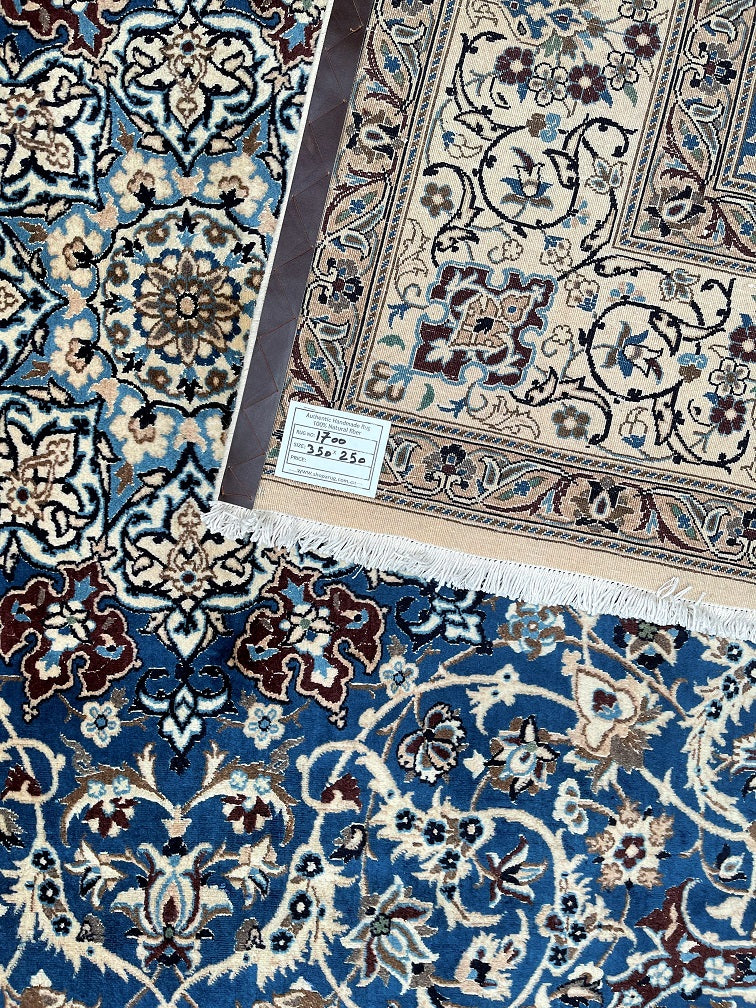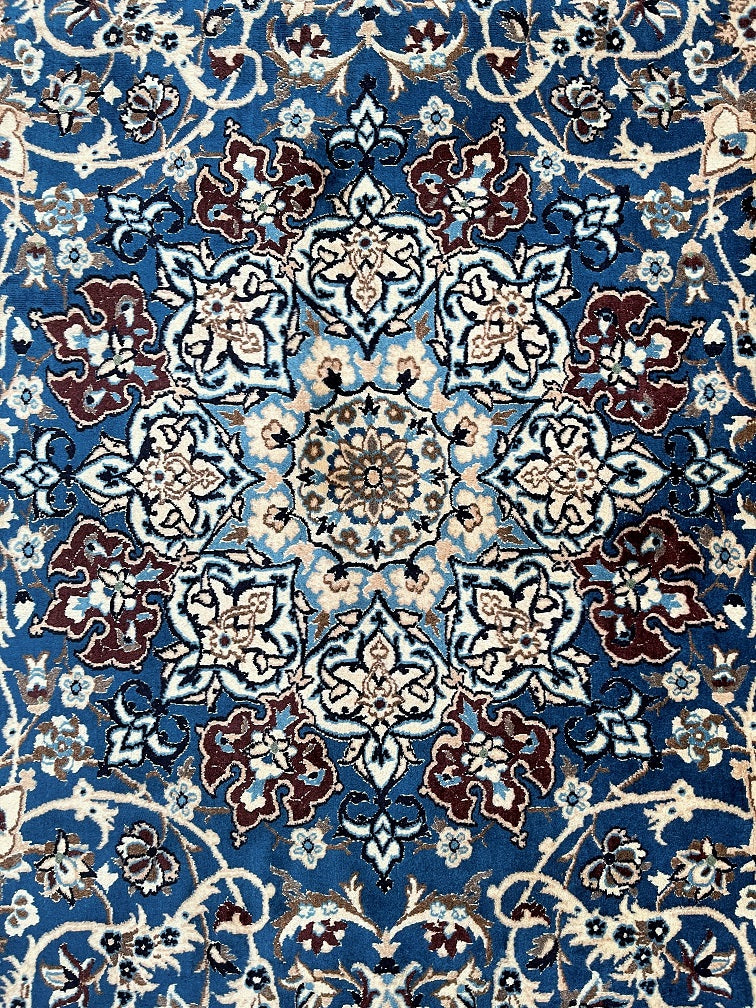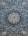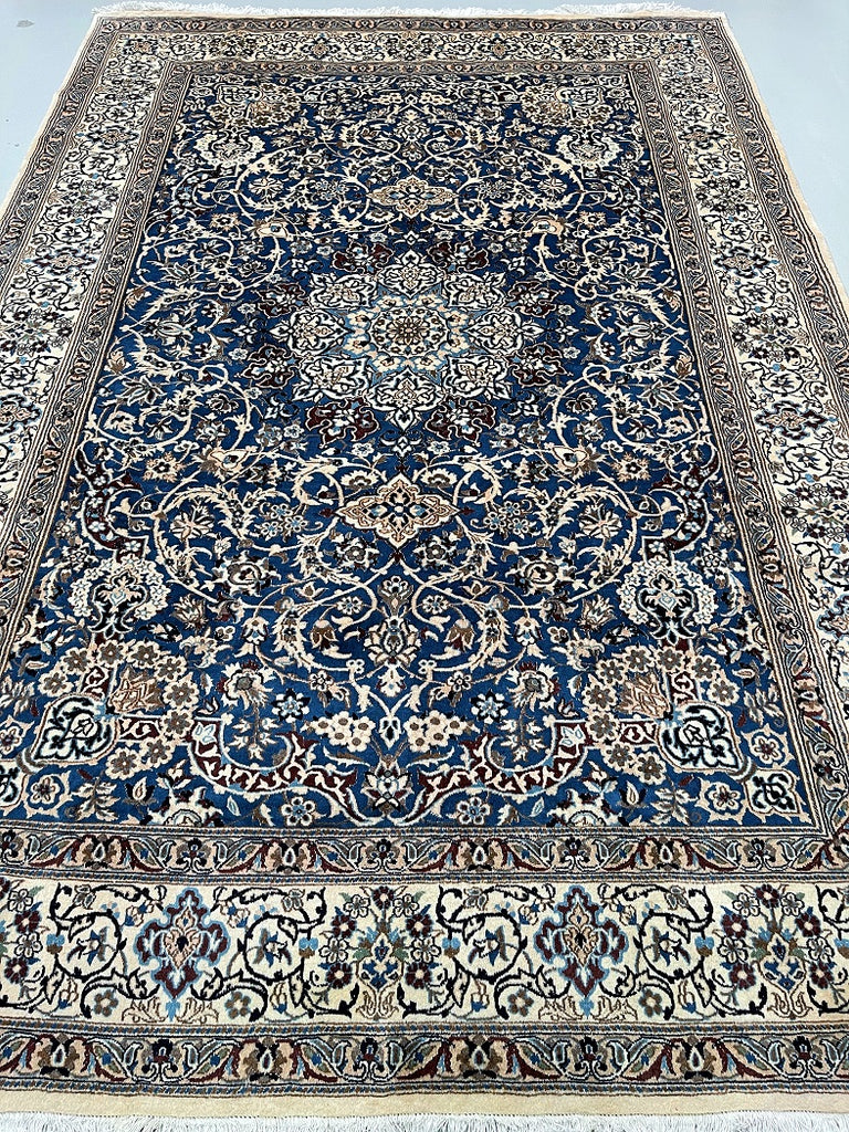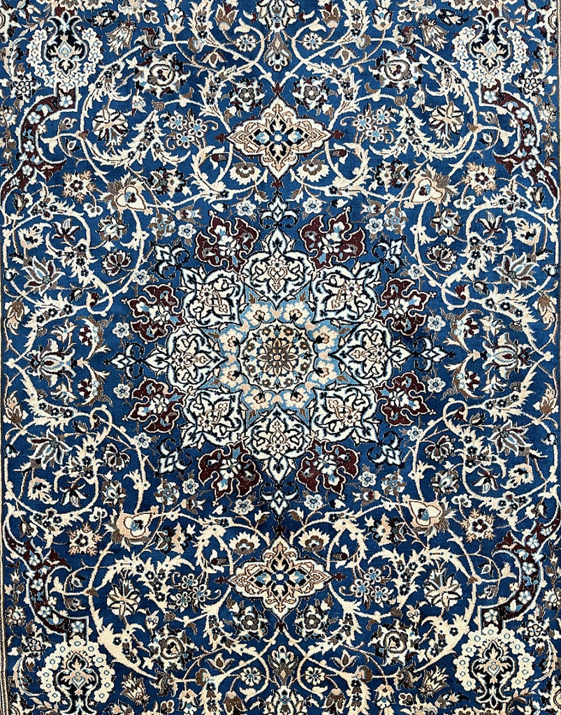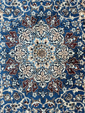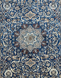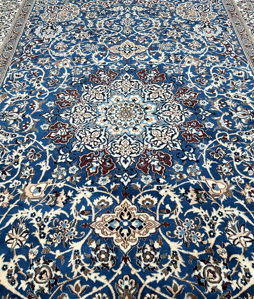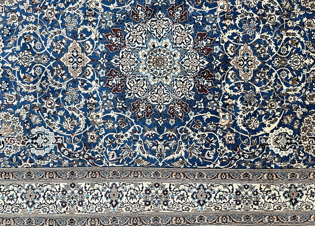 Fine Large Room Size Authentic Handmade Vintage Persian Nain Carpet. Above All It Is Hard To Get This Quality Hand Made Rug In Larger Sizes. Lamb’s Wool With Silk Highlights Pile On Cotton Base. It Also Has A Blue, Beige, Brown And Burgundy Tone Dyed Using Traditional Methods. Stunning Central Medallion Floral Design.
