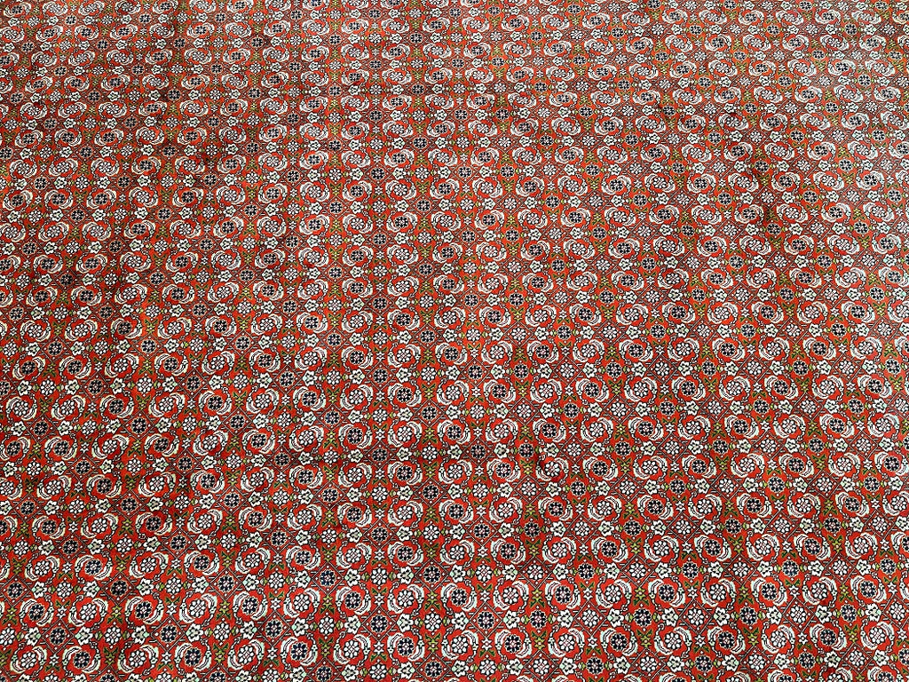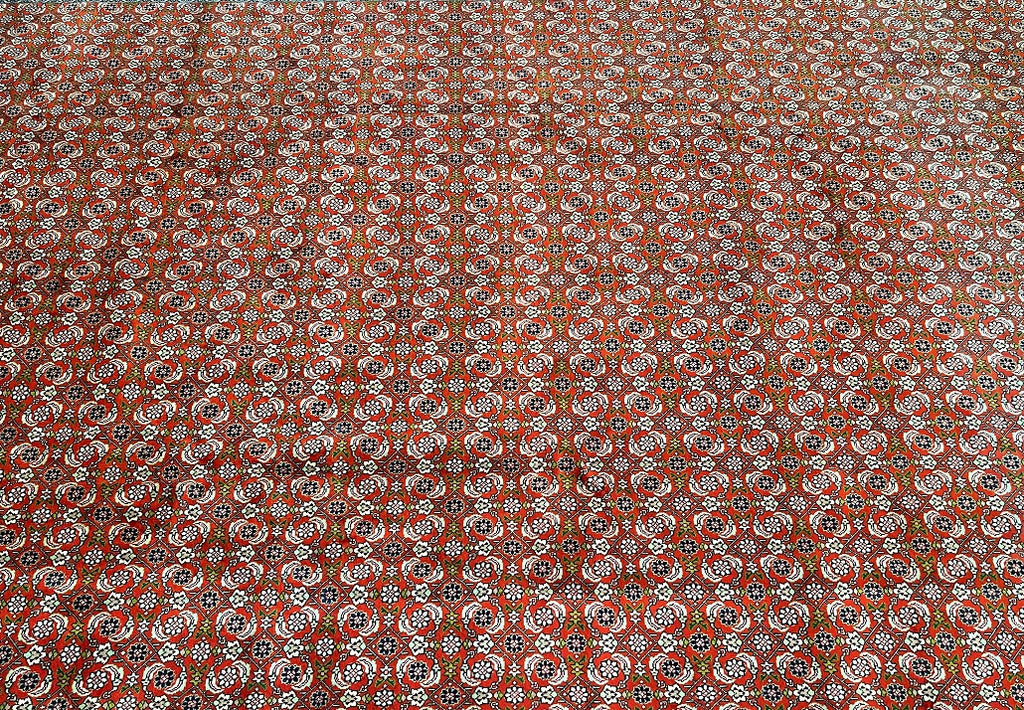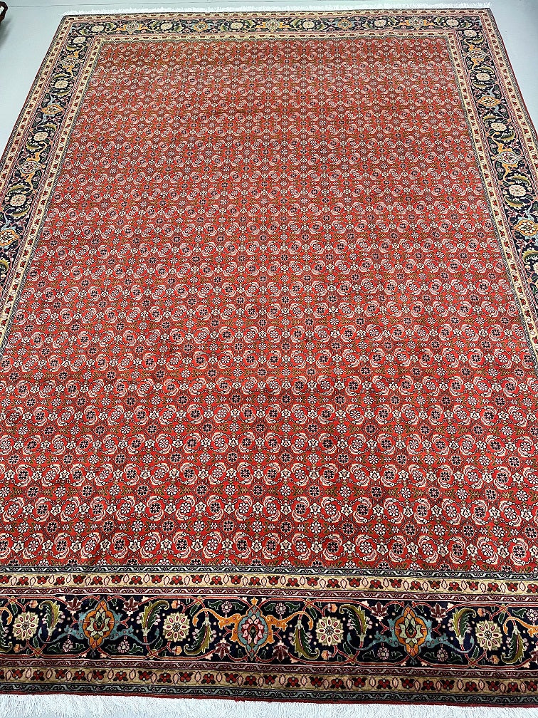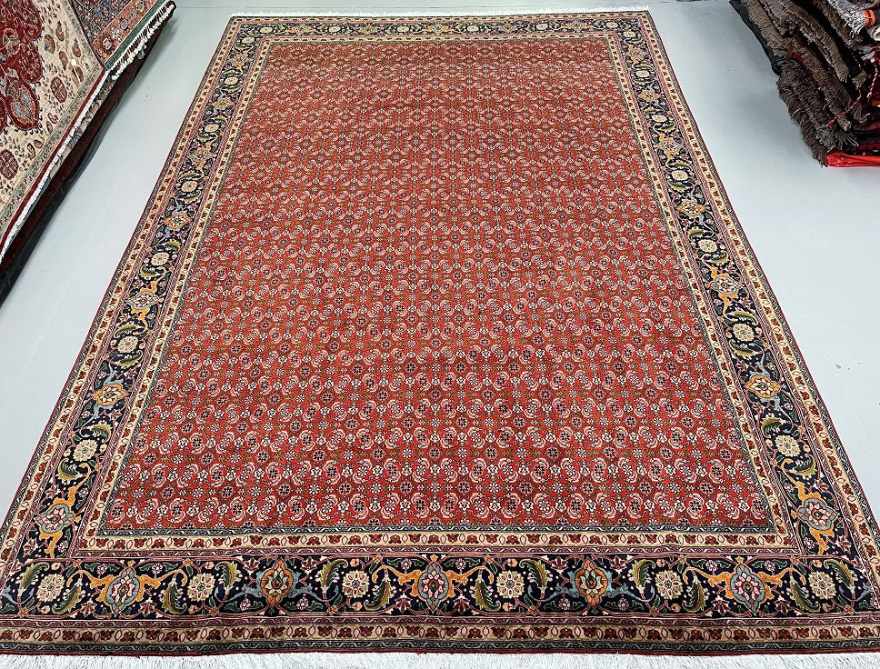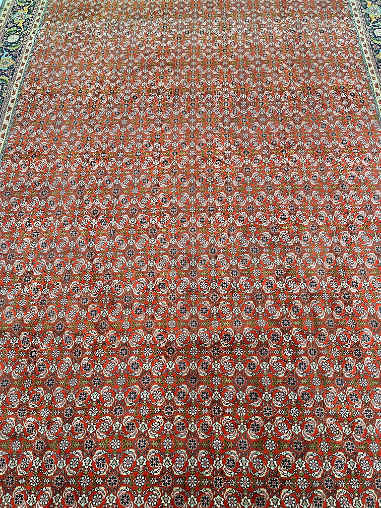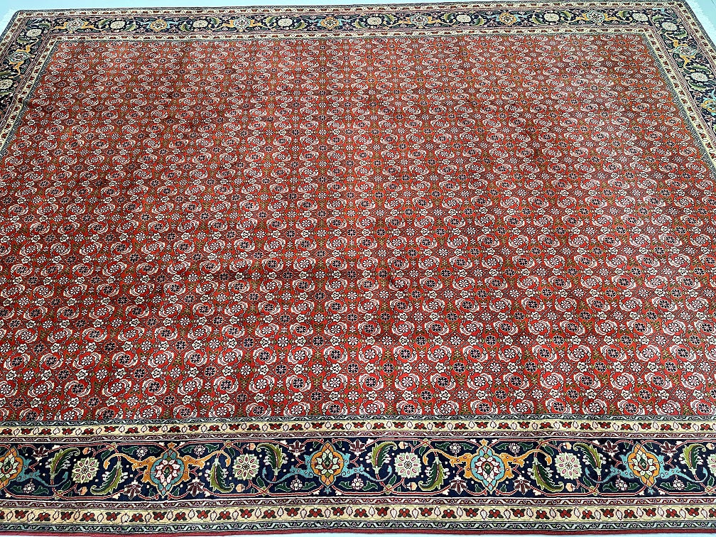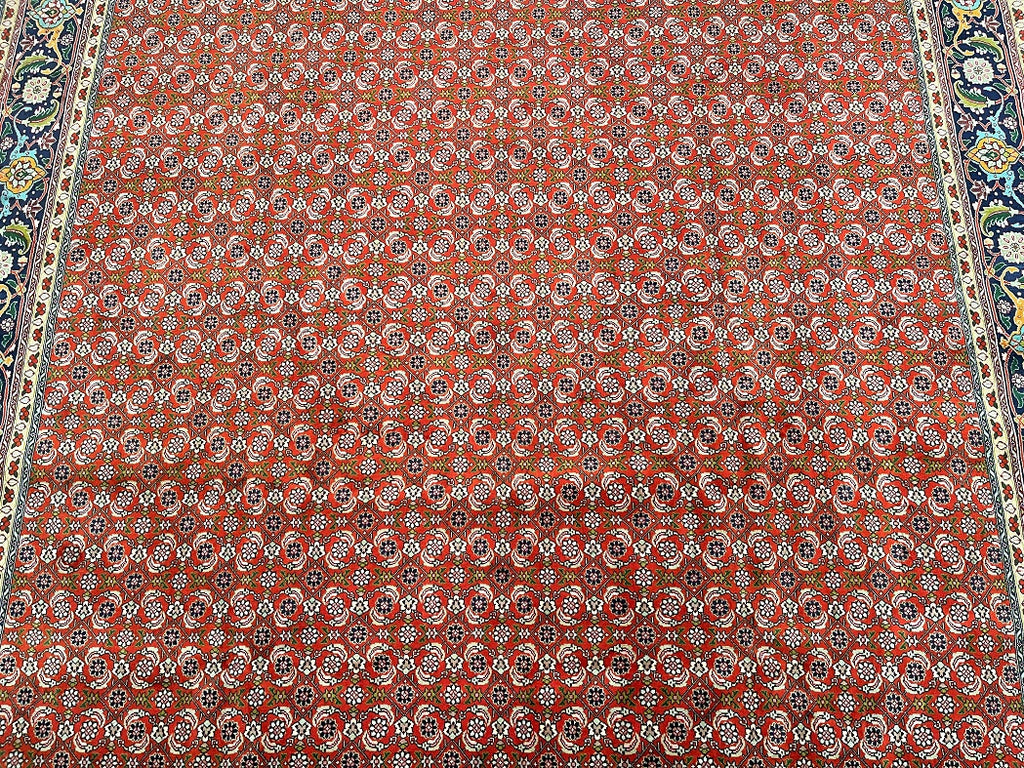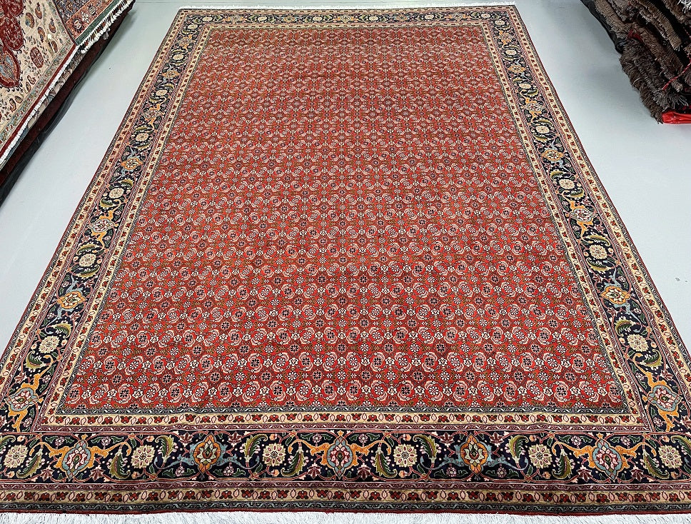Superb Large Room Size Authentic Persian Tabriz Carpet. Above All This Is A Well Knotted Piece With A High Density. It Also Has A Pure Wool Pile On Cotton Base. It Also Has A Terracotta/Orange, Beige, Green, Indigo Blue/Black, Burnt Orange And Pink Tone Dyed Using Traditional Methods.