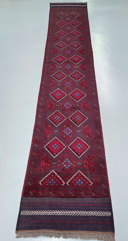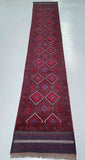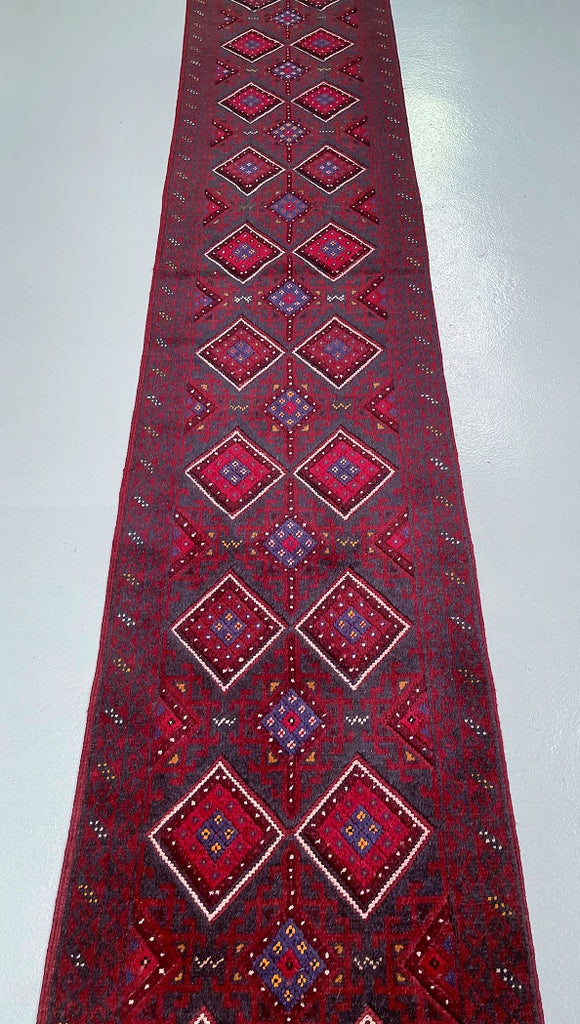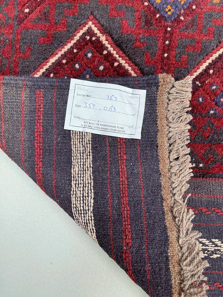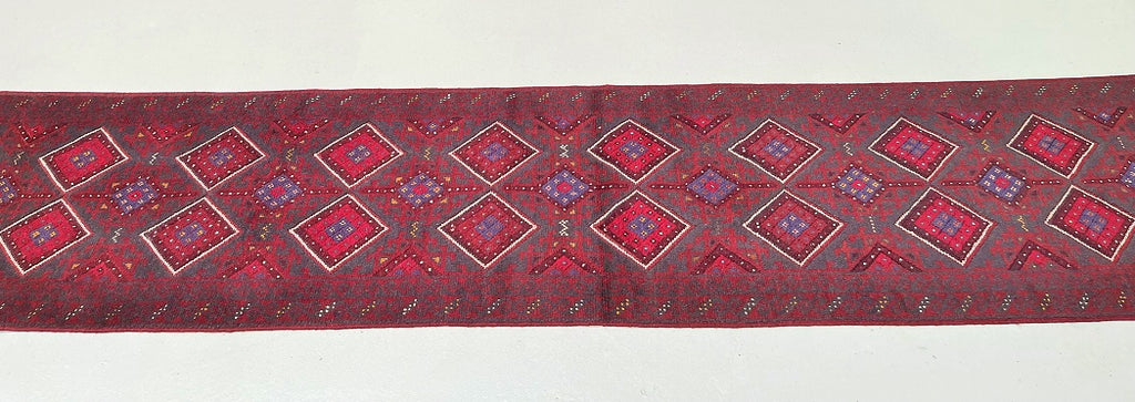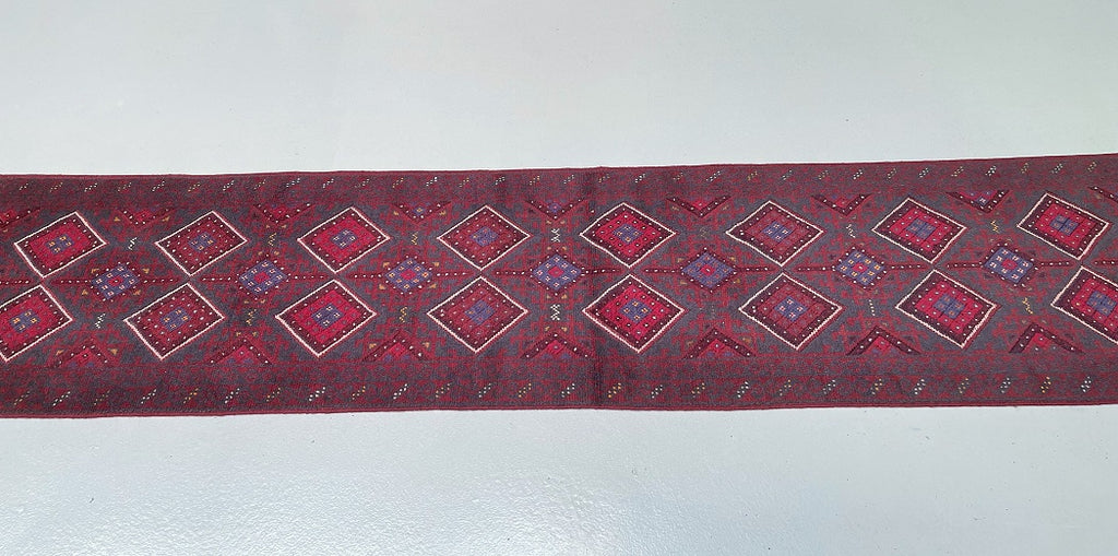 Hand Woven Afghan Mishwani Balouchi Hall Runner. Above All Three Weaving Technique Used To Make This Runner. It also Has A Pure Hand Spun Wool Pile On Wool Base. Red, Beige And Blue Tone Dyed Using Traditional Methods.