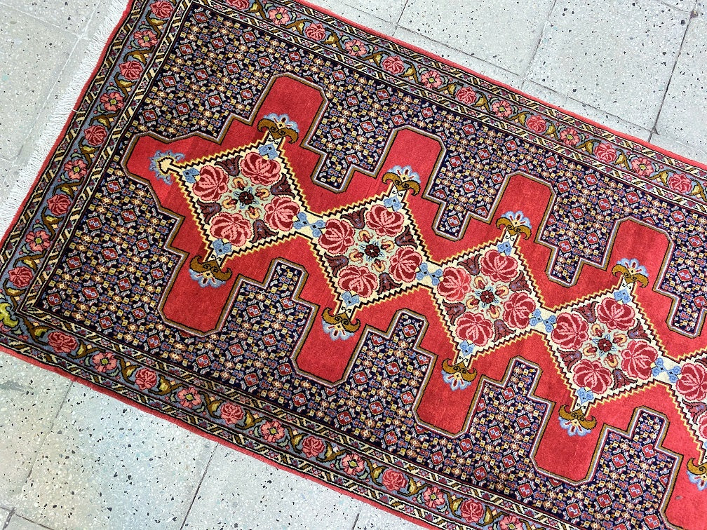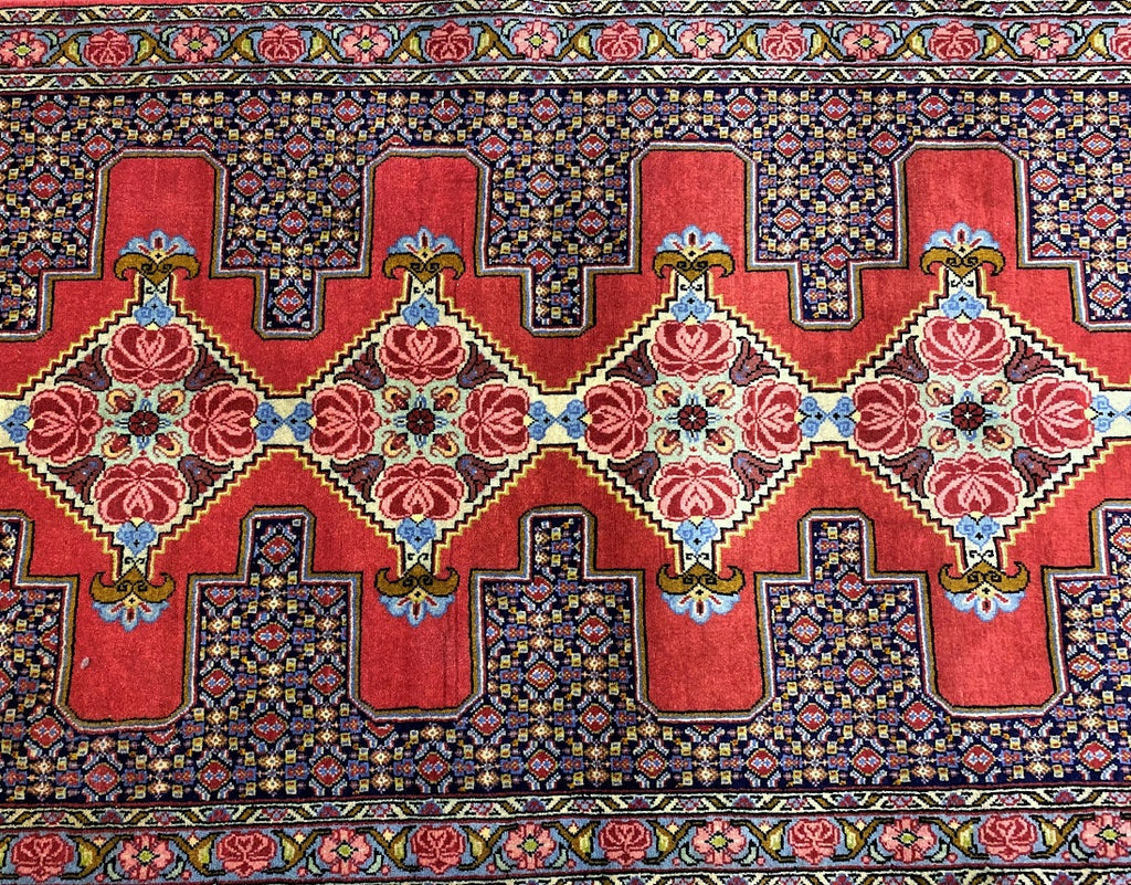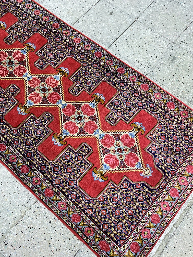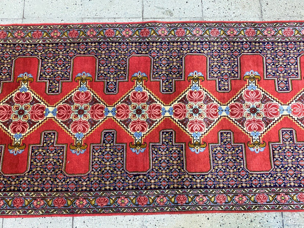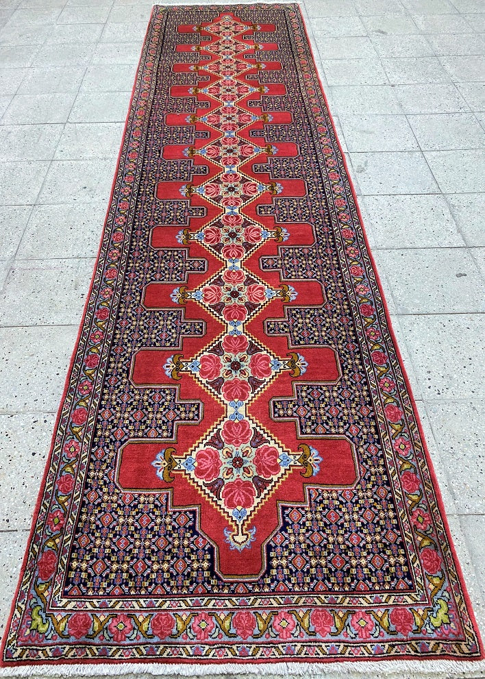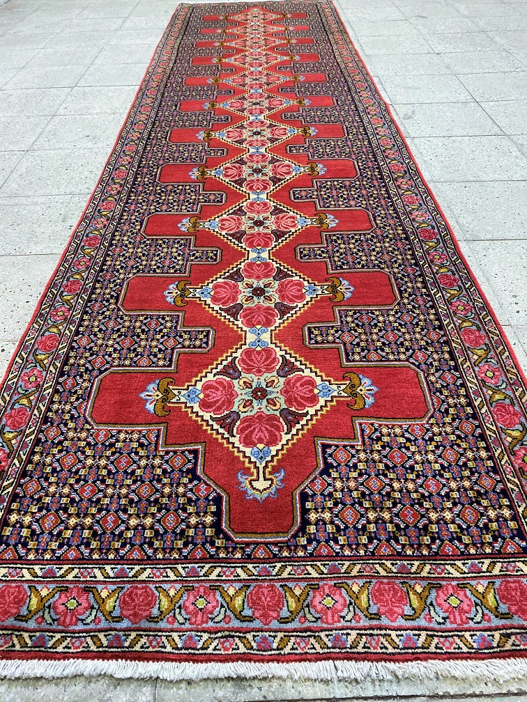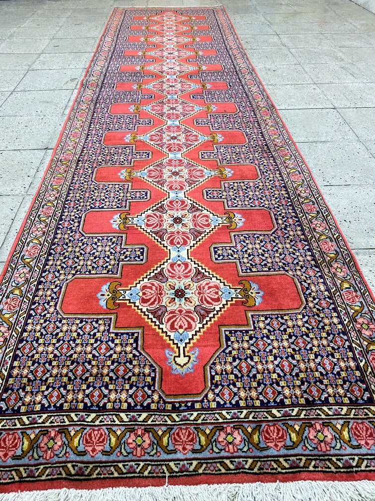 Fine 3.6m French Roses Hand Knotted Persian Senneh Bijar Hall Runner. Above All It Is Hard To Find This Quality Handmade Hall Runners From Kurdistan. It Has A Pure Lamb’s Wool Pile On Fine Cotton. Terracotta/Pink Tone Dyed Using Traditional Methods. Dense Quality From Sanandaj.