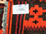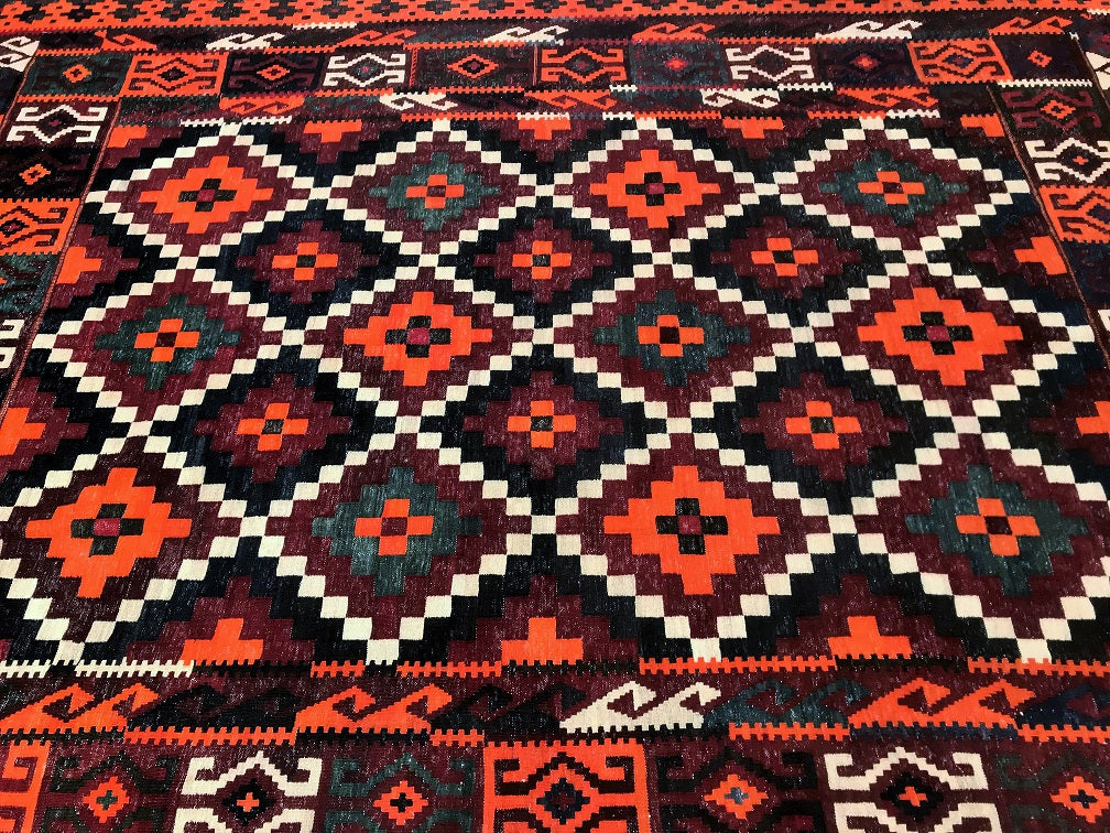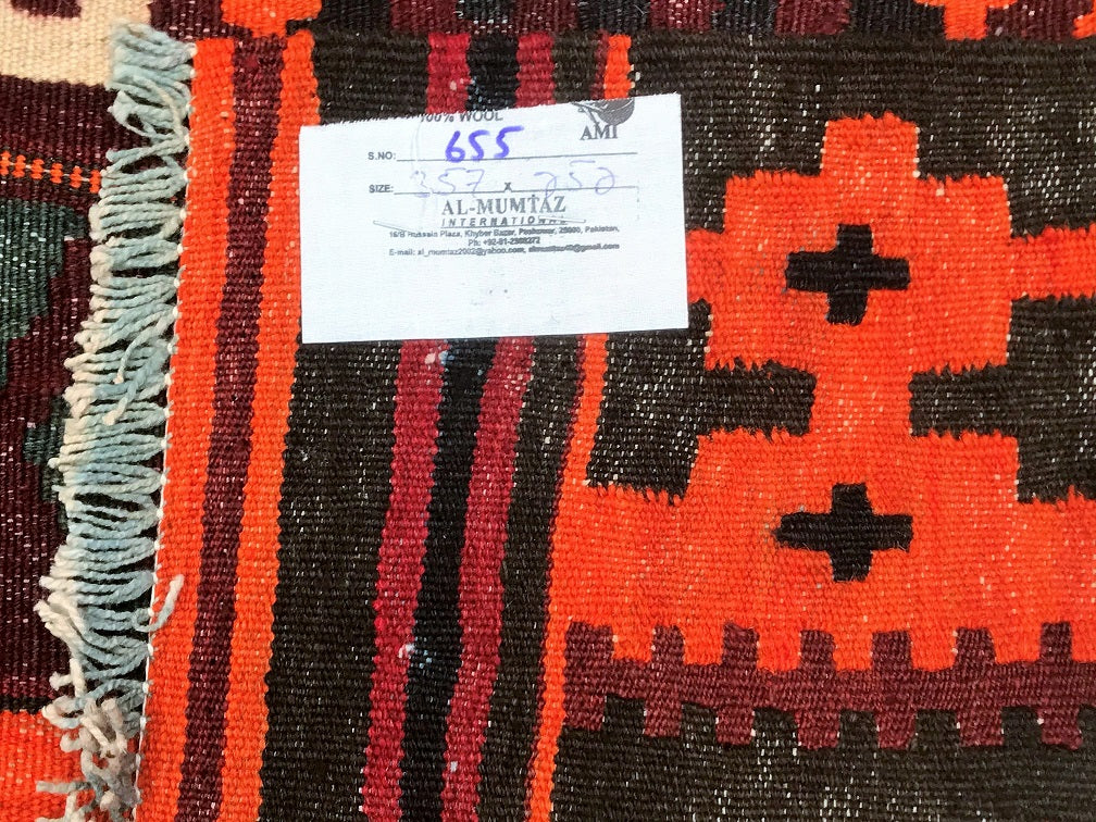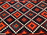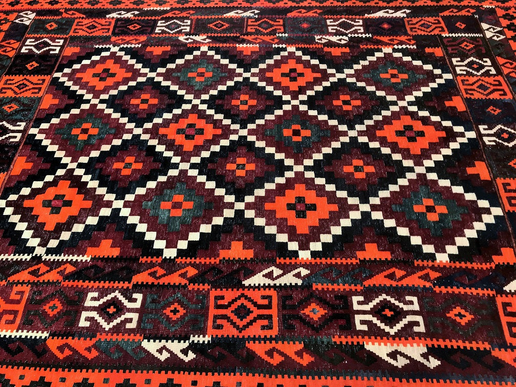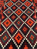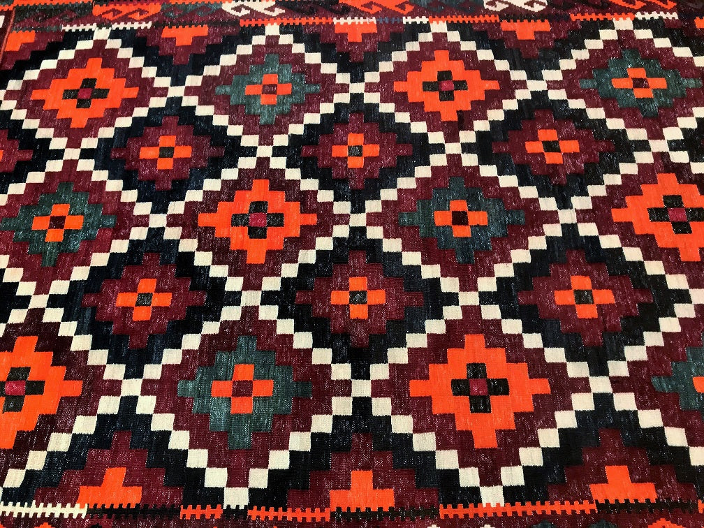 Large Room Size Tribal Design Hand Woven Vintage Afghan Gul Muri Kilim. Ideal For Lounge or Dining Room With The Extra Width. It Also Has A Pure Hand Spun Wool Pile On Wool Base. Rustic Burnt Orange, Maroon And Black Tone Dyed Using Traditional Methods.