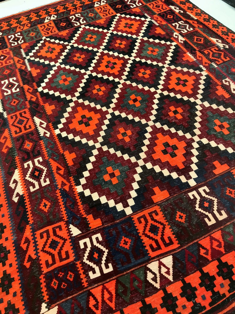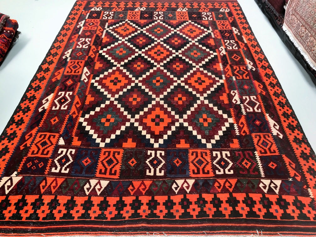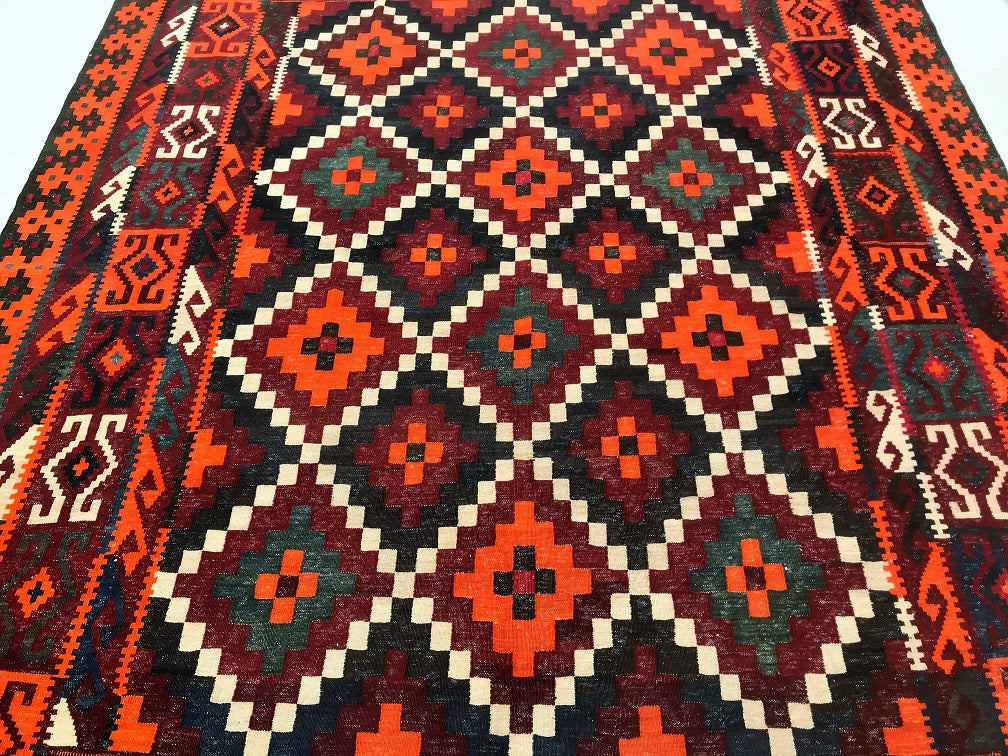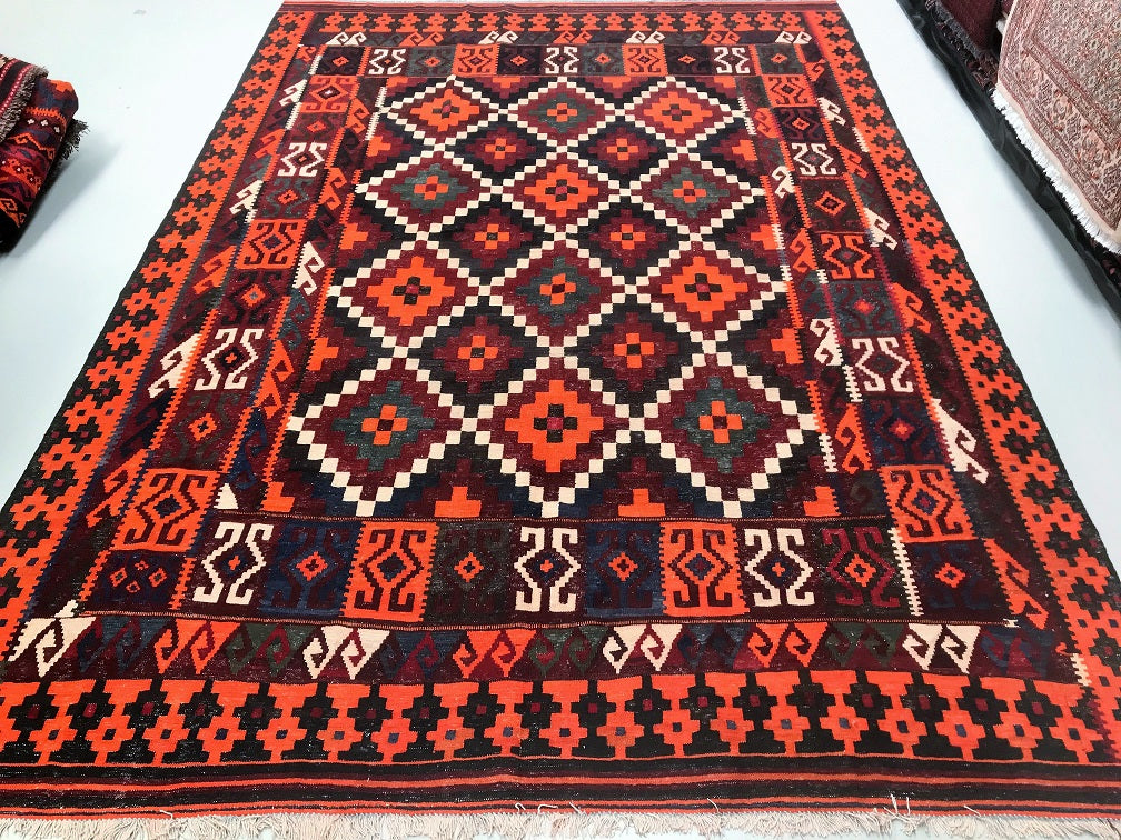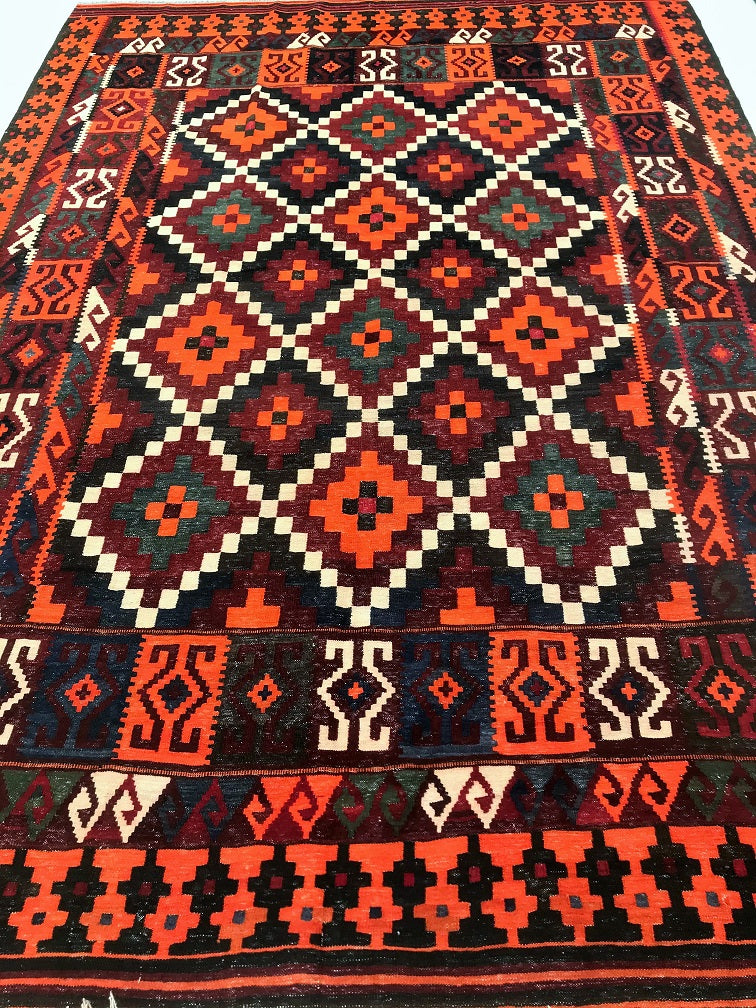 Large Room Size Tribal Design Hand Woven Vintage Afghan Gul Muri Kilim. Ideal For Lounge or Dining Room With The Extra Width. It Also Has A Pure Hand Spun Wool Pile On Wool Base. Rustic Burnt Orange, Maroon And Black Tone Dyed Using Traditional Methods.
