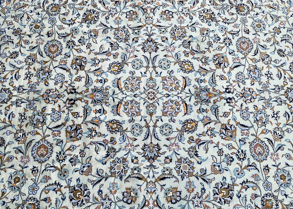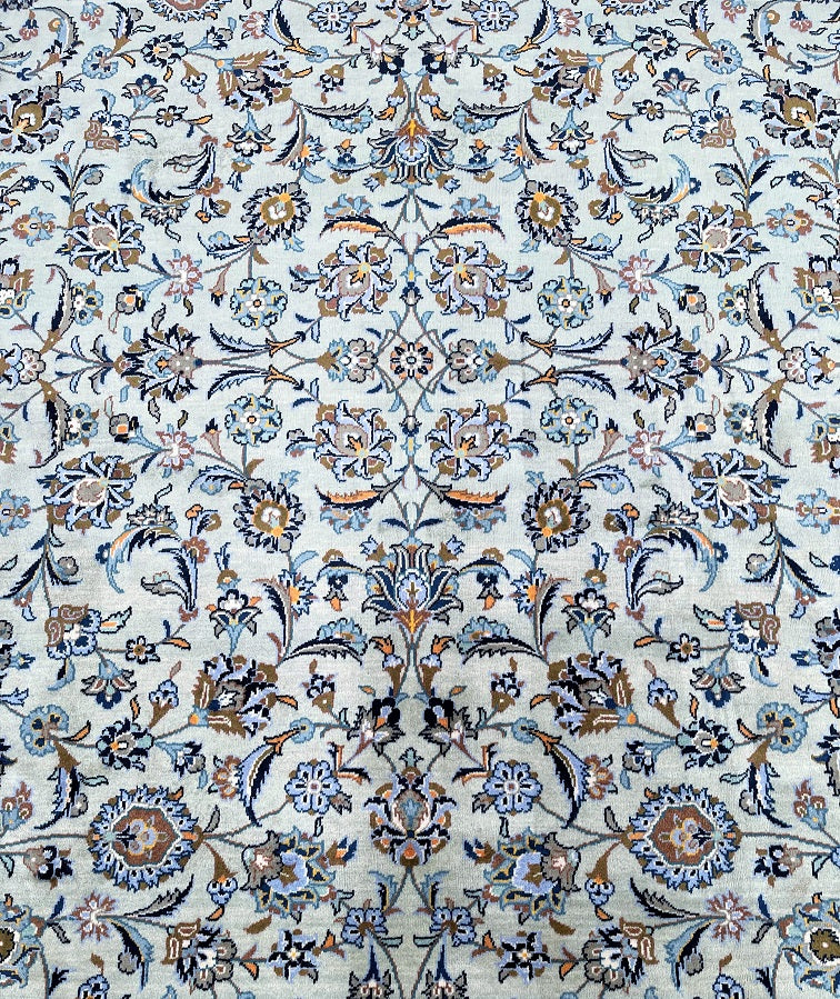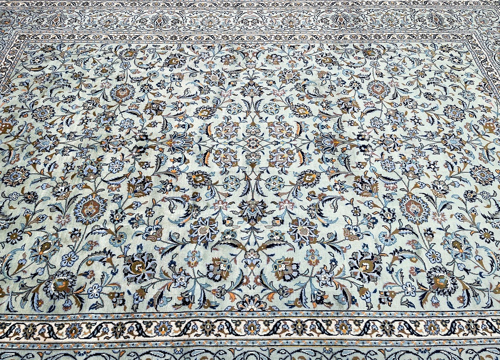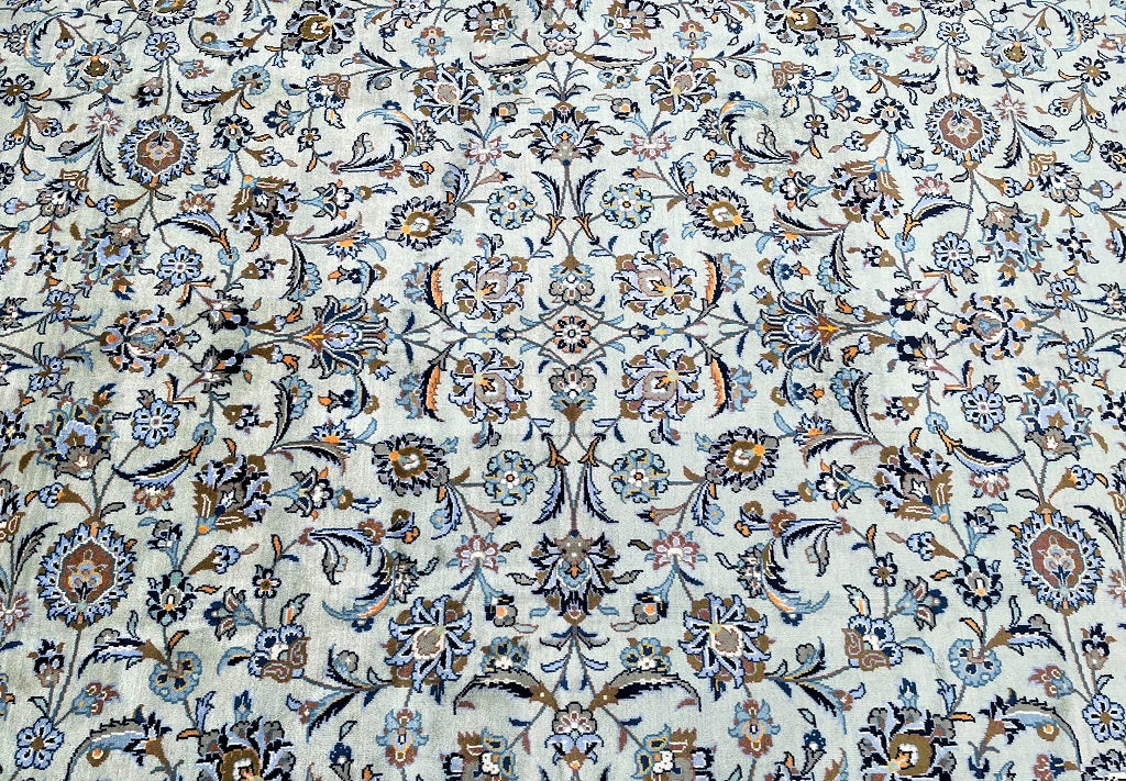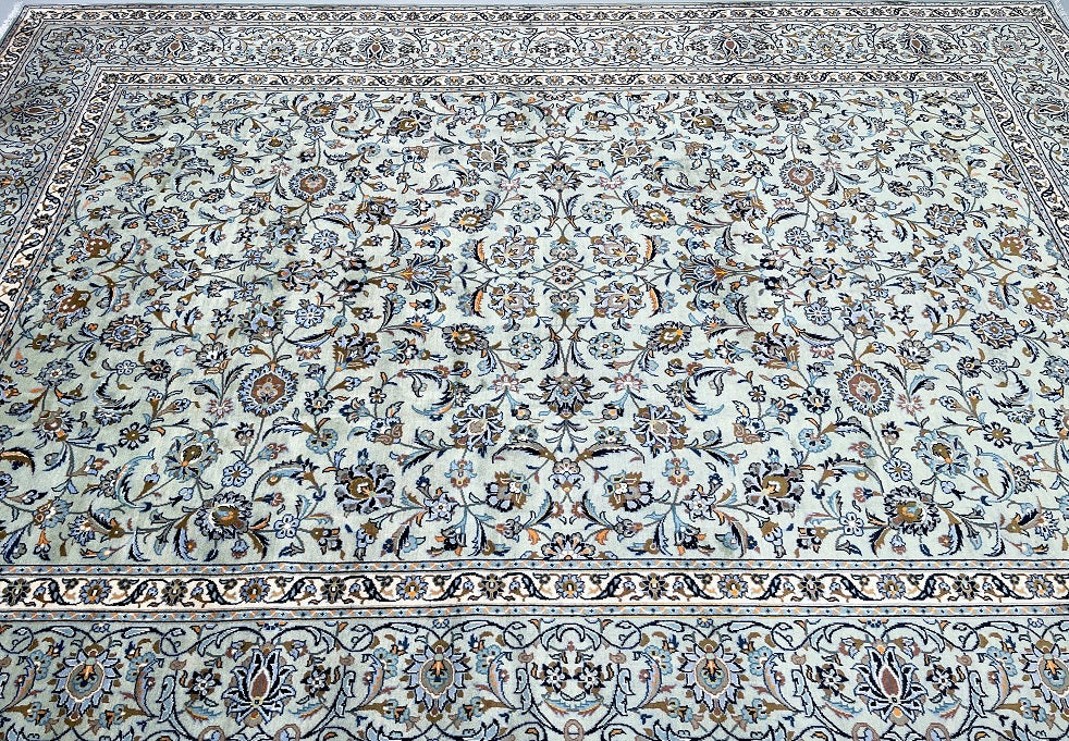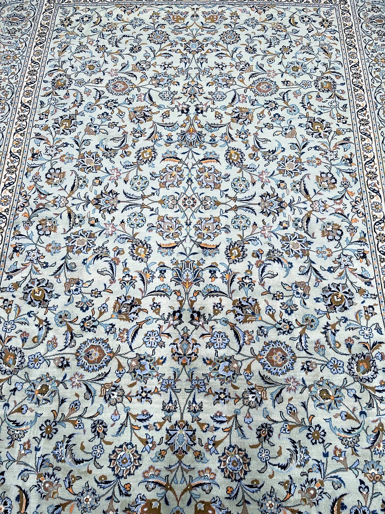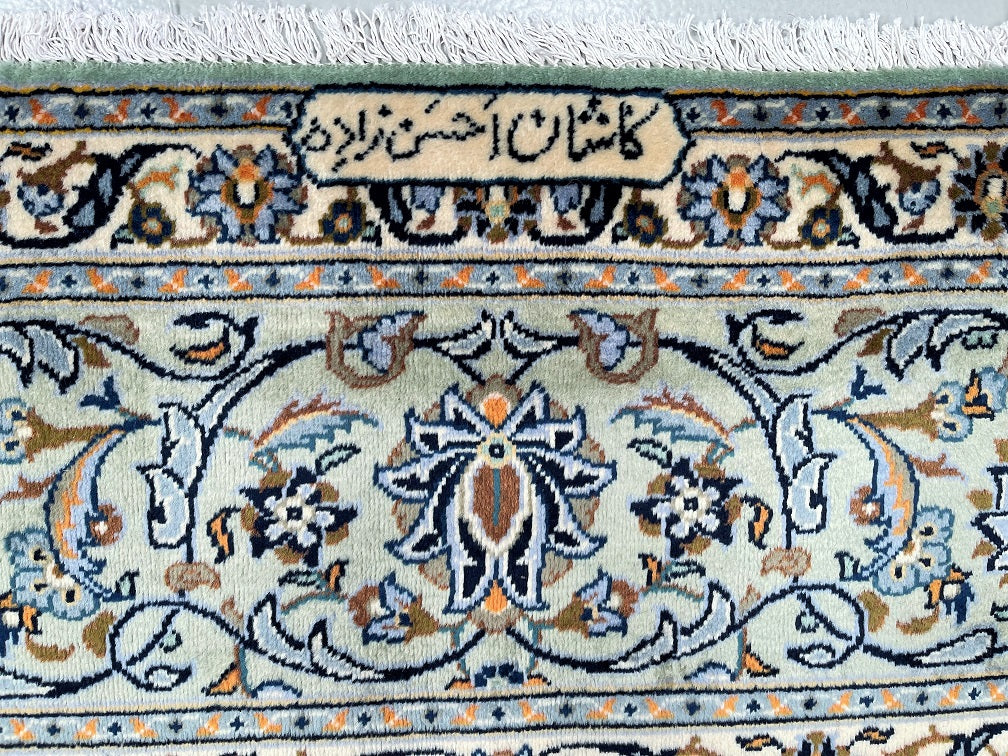 Large Room Size Pistachio Tone Handmade Persian Kashan Rug Signed. Above All It Is Hard To Get This Quality Original Handmade Rug Which Are Signed. It Is Also Pure Lamb’s Wool Pile on Cotton Base. Pistachio, Blues, Beige, Orange And Mustard Tone Dyed Using Traditional Methods.