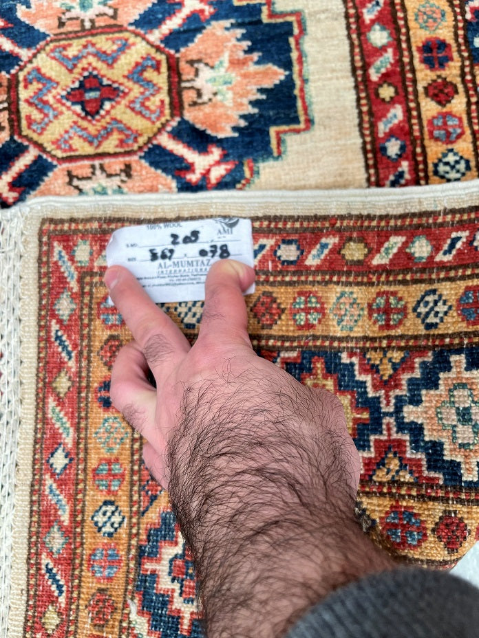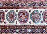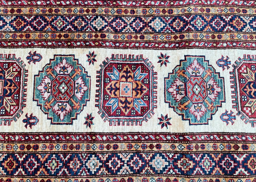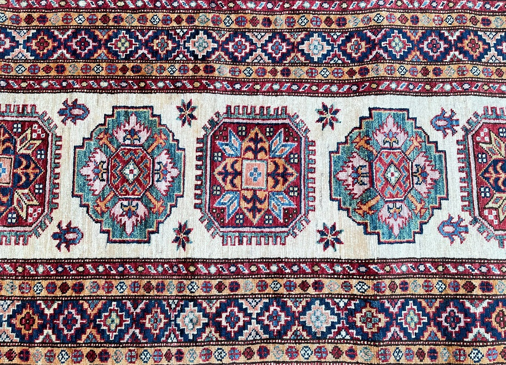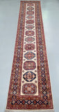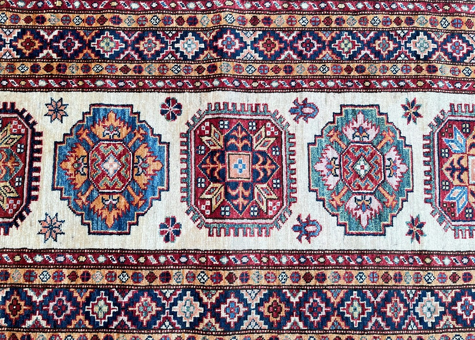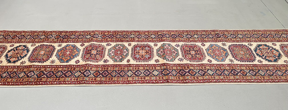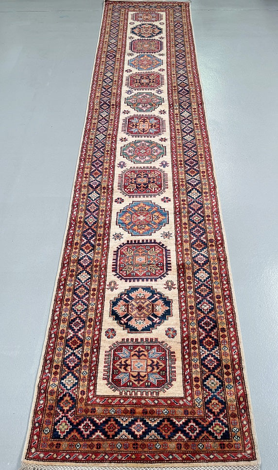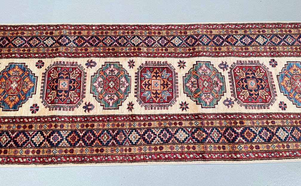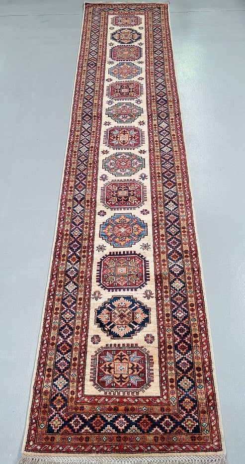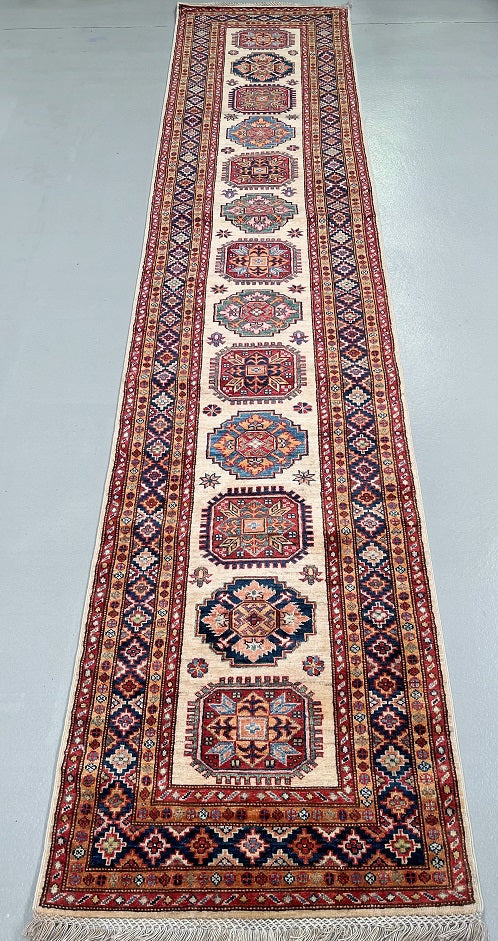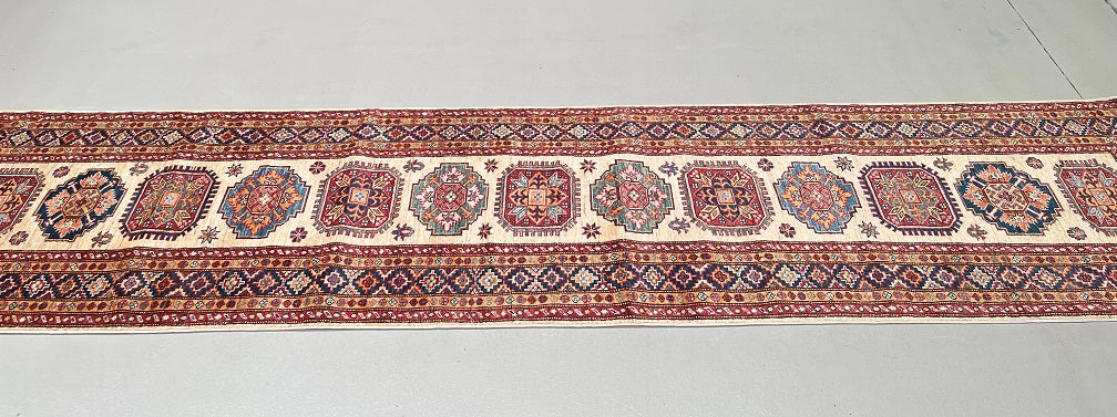 Authentic Handmade Afghan Super Kazak Hall Runner. Above All We Do Have This Runner In A Matching Pair. It Has A Pure Hand Spun Wool Pile On Cotton Base. Stunning Beige, Blue, Orange, Green And Red Tones Dyed Using Traditional Methods (Vegetable Dyes). Last Of True Woven Tribal Art.