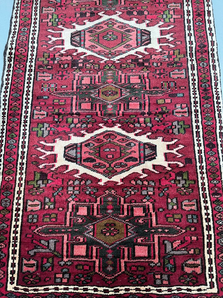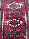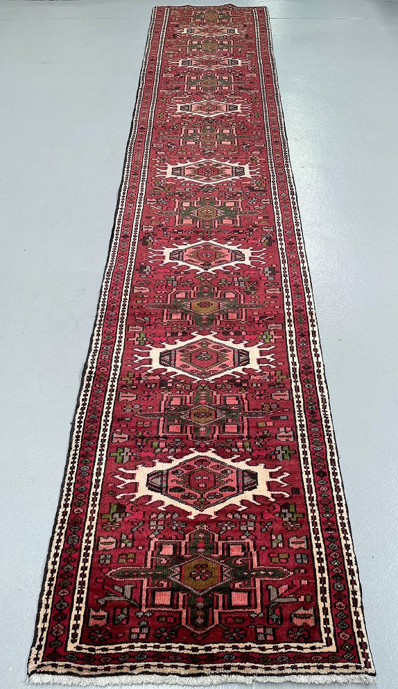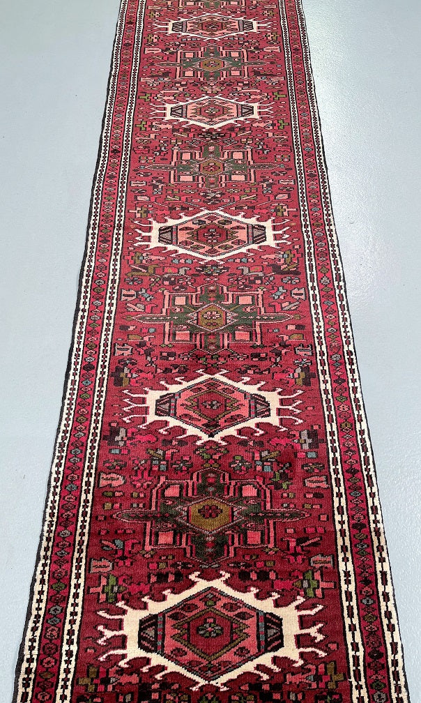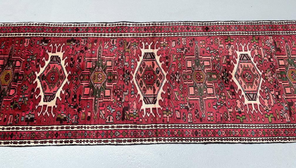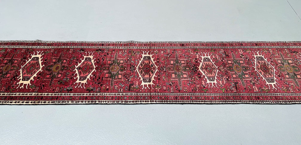 Rare Authentic Handmade Persian Heriz Hall Runner. Above Has A Pure Hand Spun Wool Pile On Cotton Base. Red, Pink, Green, Beige, Brown And Blue Tone Dyed Using Traditional Methods.