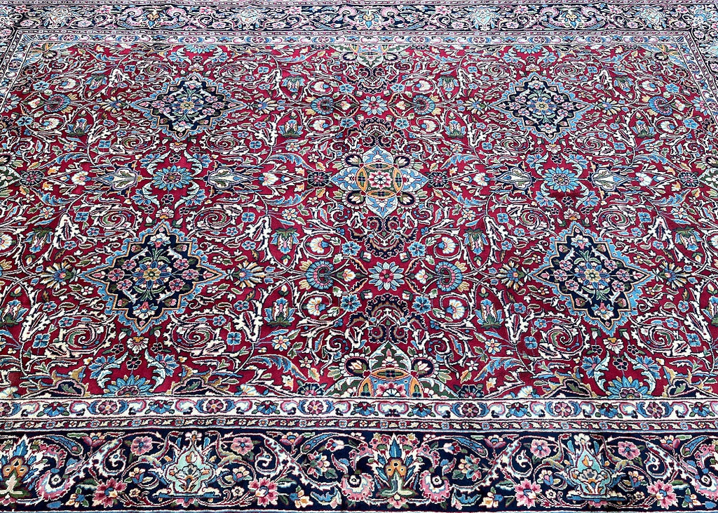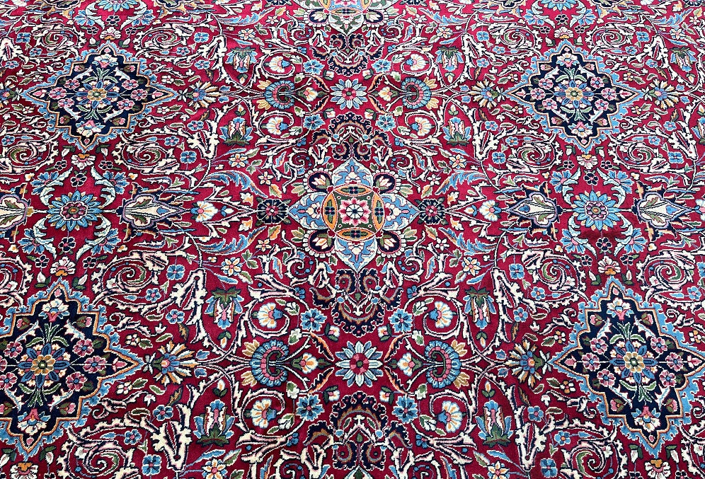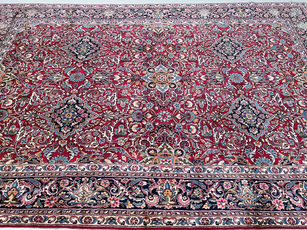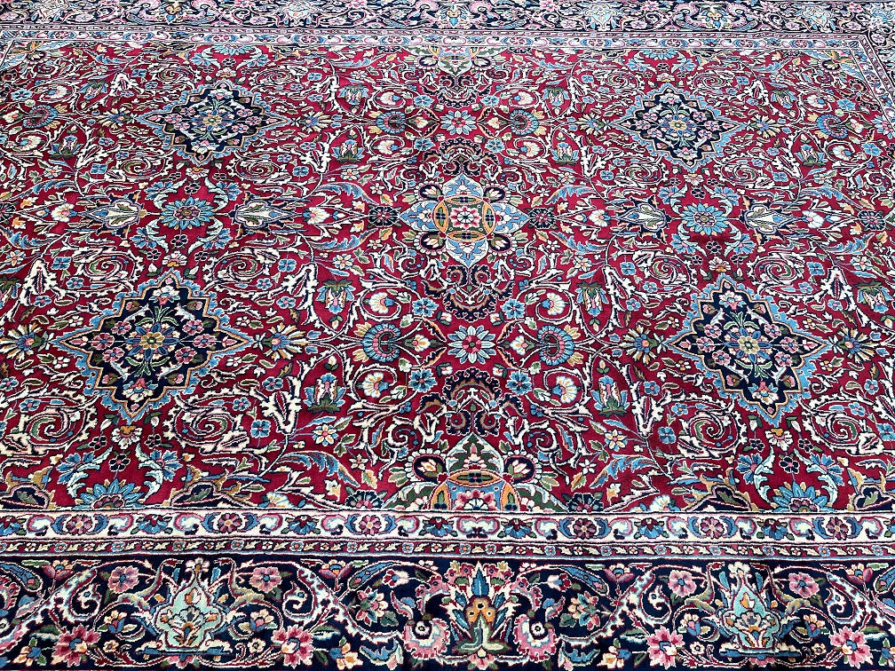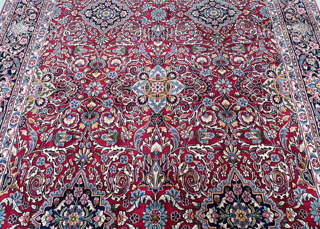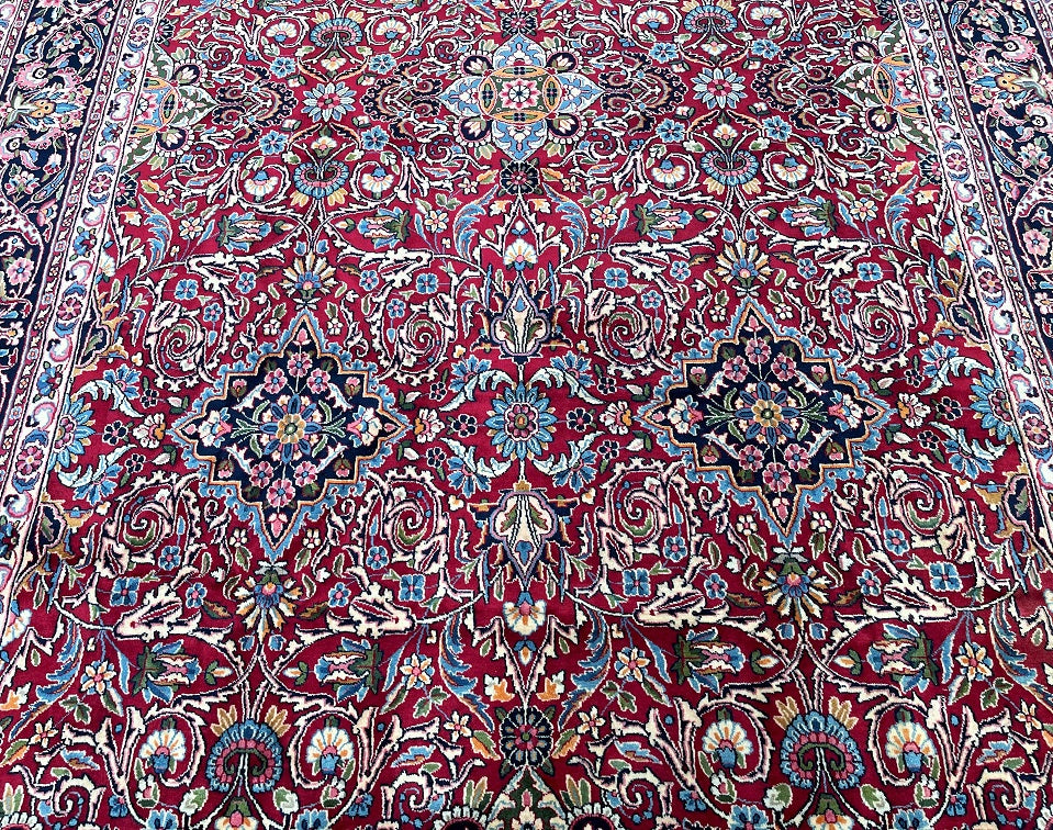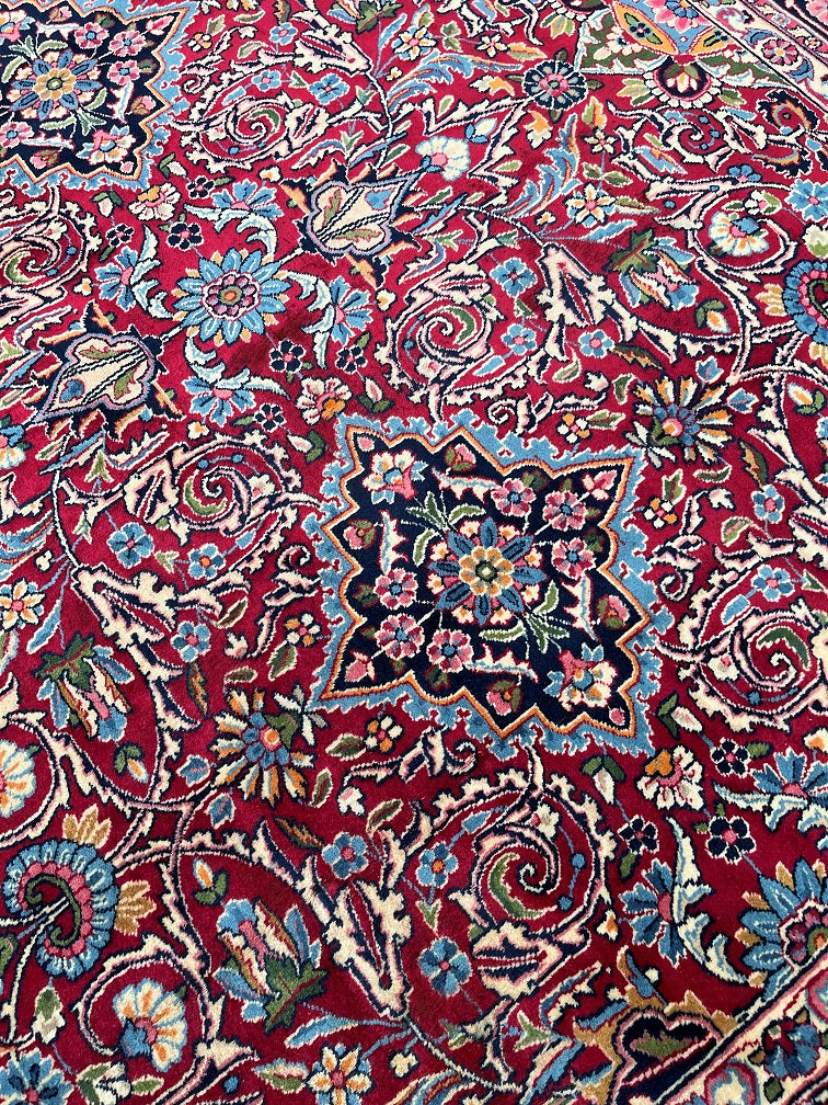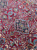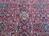 Rare Large Room Size Authentic Handmade Antique Persian Kerman Rug. Above All This Rug Was Woven Circa 1950’s And Old Rugs From City Of Kerman Are Highly Collectible. It Also Has a Pure Lamb’s Wool Pile On Cotton Base. Maroon Red, Beige, Black, French Blue, Green and Pink Tone Dyed Using Traditional Methods.