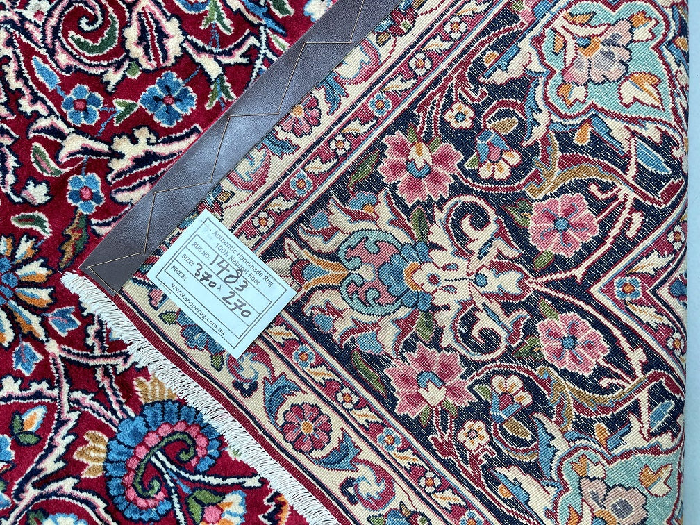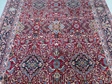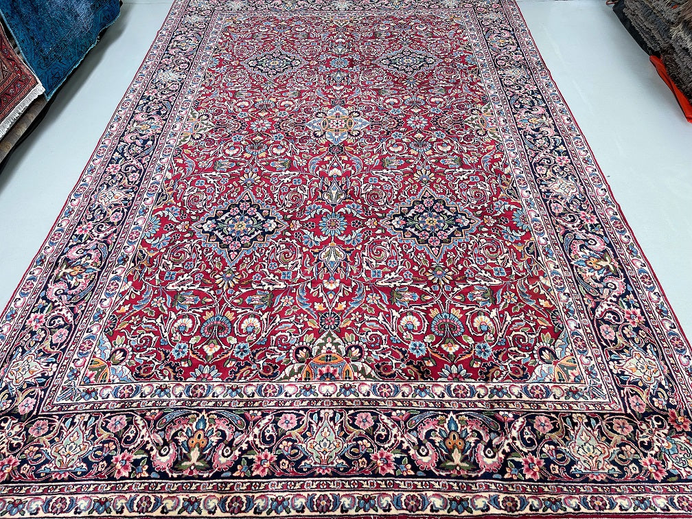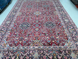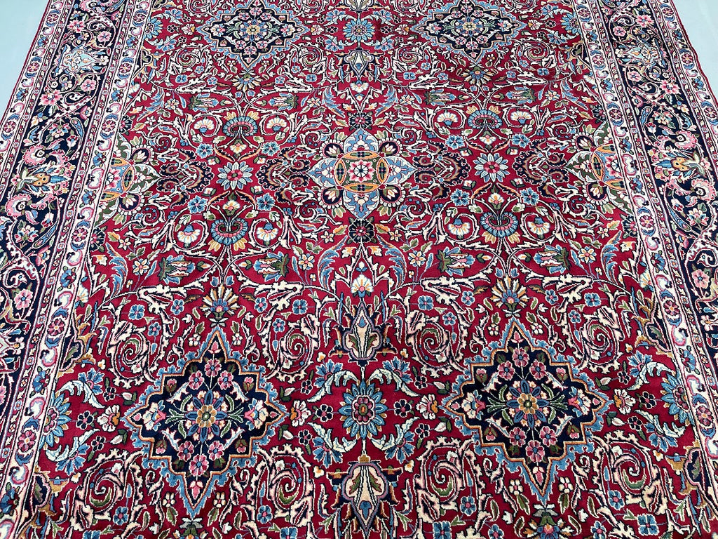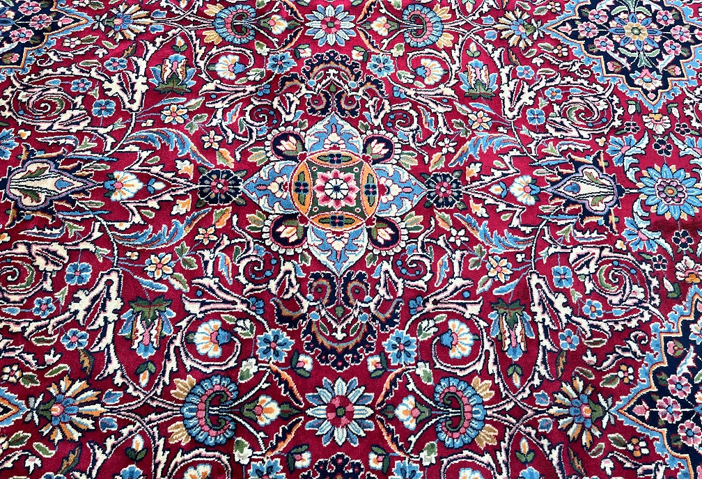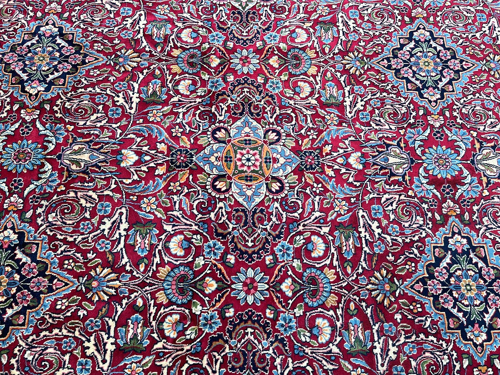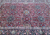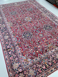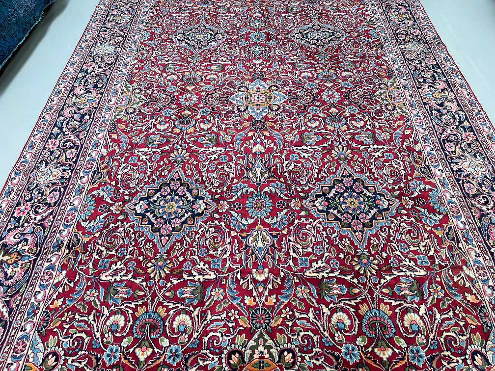 Rare Large Room Size Authentic Handmade Antique Persian Kerman Rug. Above All This Rug Was Woven Circa 1950’s And Old Rugs From City Of Kerman Are Highly Collectible. It Also Has a Pure Lamb’s Wool Pile On Cotton Base. Maroon Red, Beige, Black, French Blue, Green and Pink Tone Dyed Using Traditional Methods.