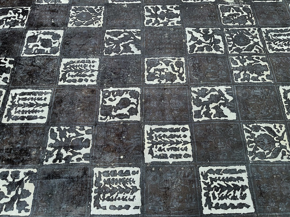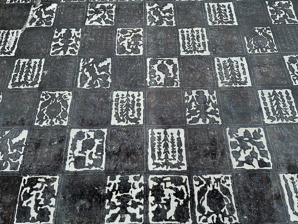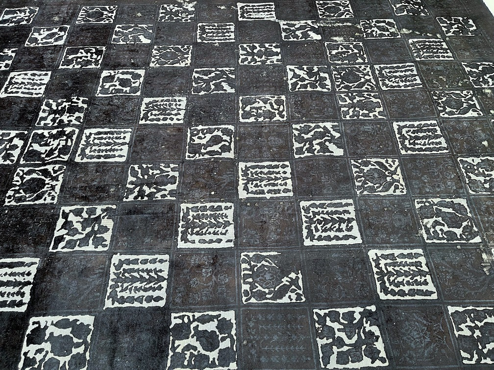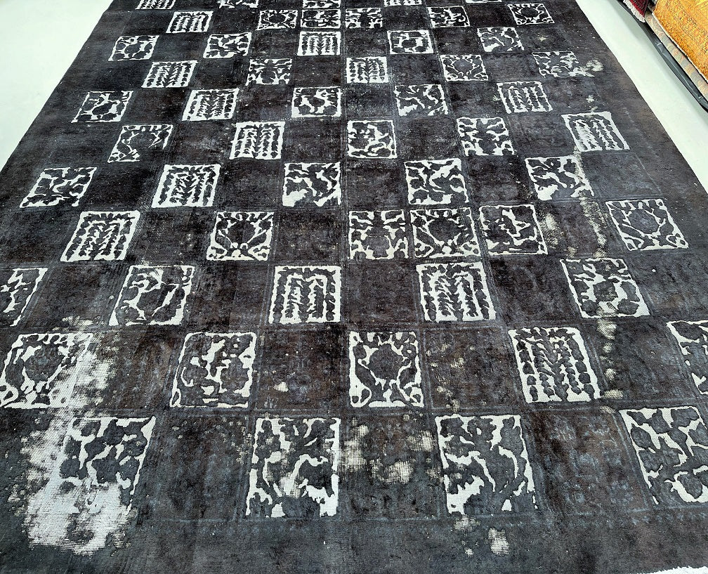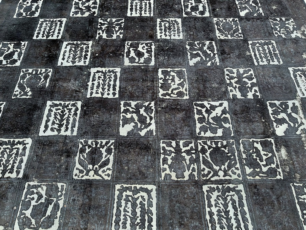 Large Room Size Handmade Over Dyed Vintage Persian Najafabad Rug Which Is Very Popular With Post Modern Décor. Above All This Rug Is Made From A Vintage Rug Which Goes Through Colour Neutralization And Then Dyed With New Colours. Pure Wool Pile On Cotton Base. It Also Has A Charcoal, Black And Grey Tone Dyed Using Traditional Methods.