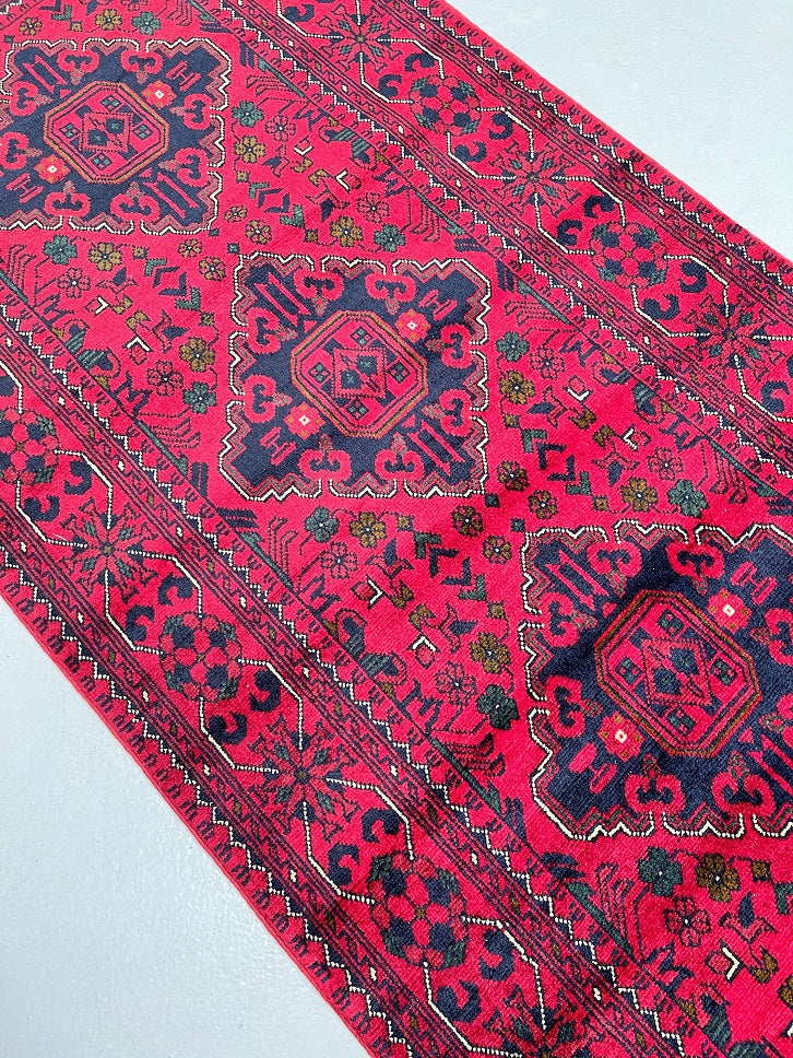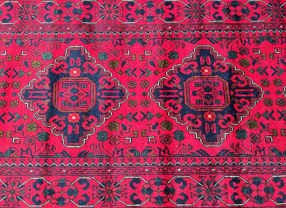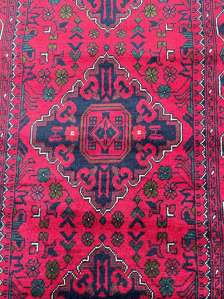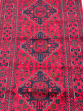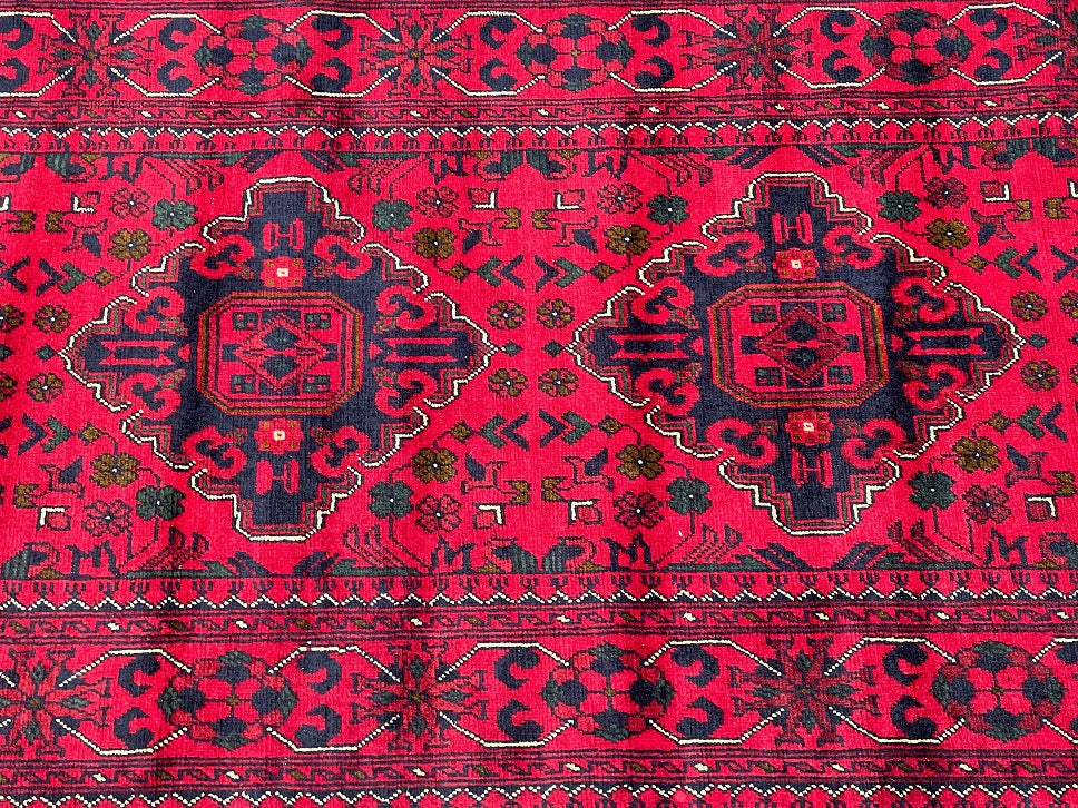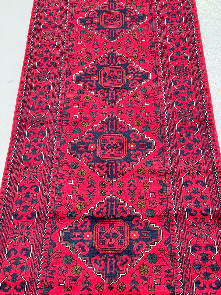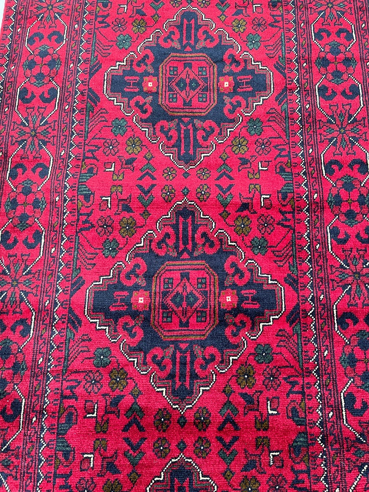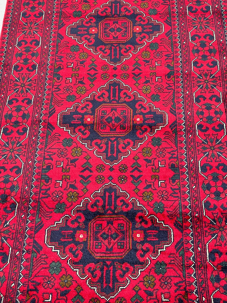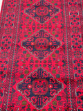 Fine Lamb’s Wool Hand Knotted Tribal Afghan Kunduz Hall Runner. Above All It Has A Pure Hand Spun Lamb’s Wool Pile On Cotton Base. It Also Has A Maroon/Burgundy Tone Dyed Using Traditional Methods. This Runner Would Look Fantastic On Wooden Floor Board.
