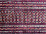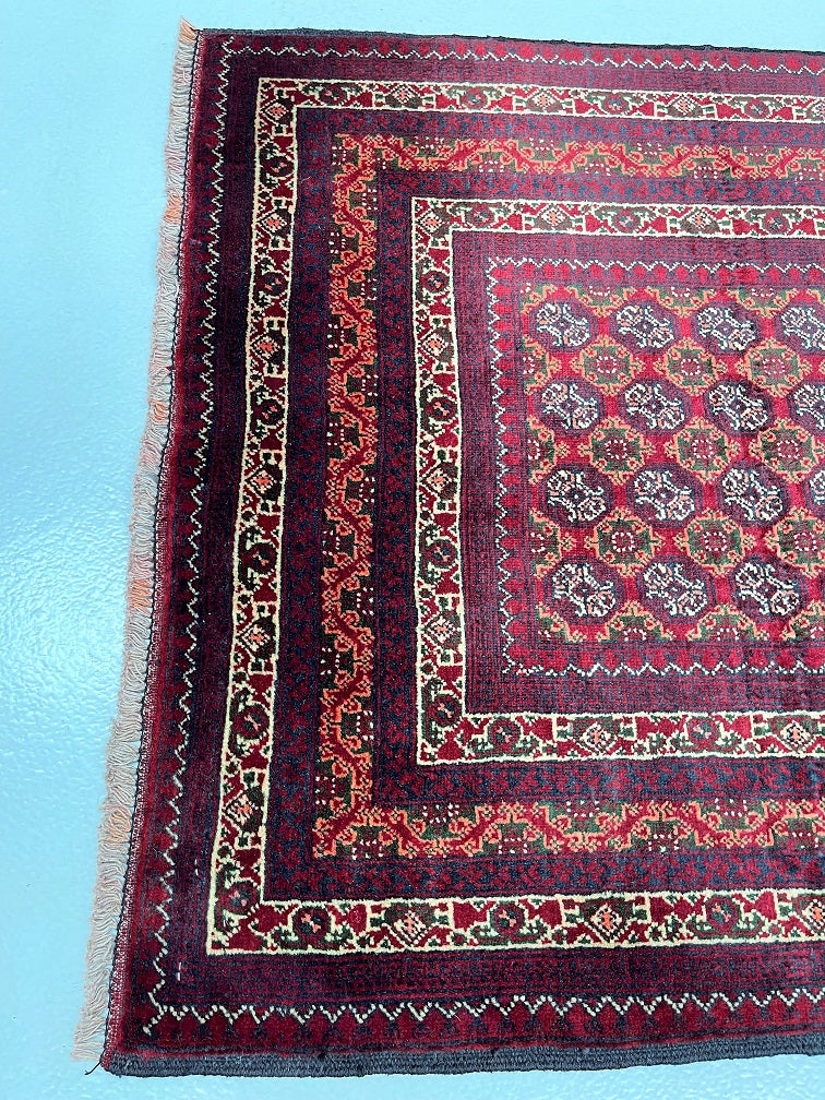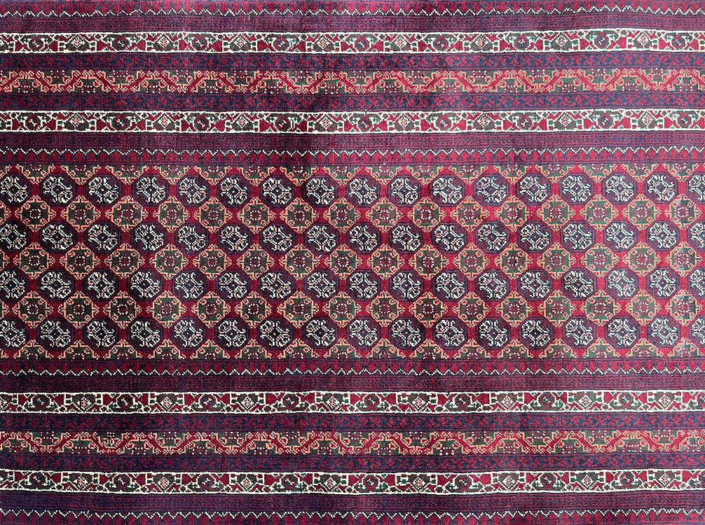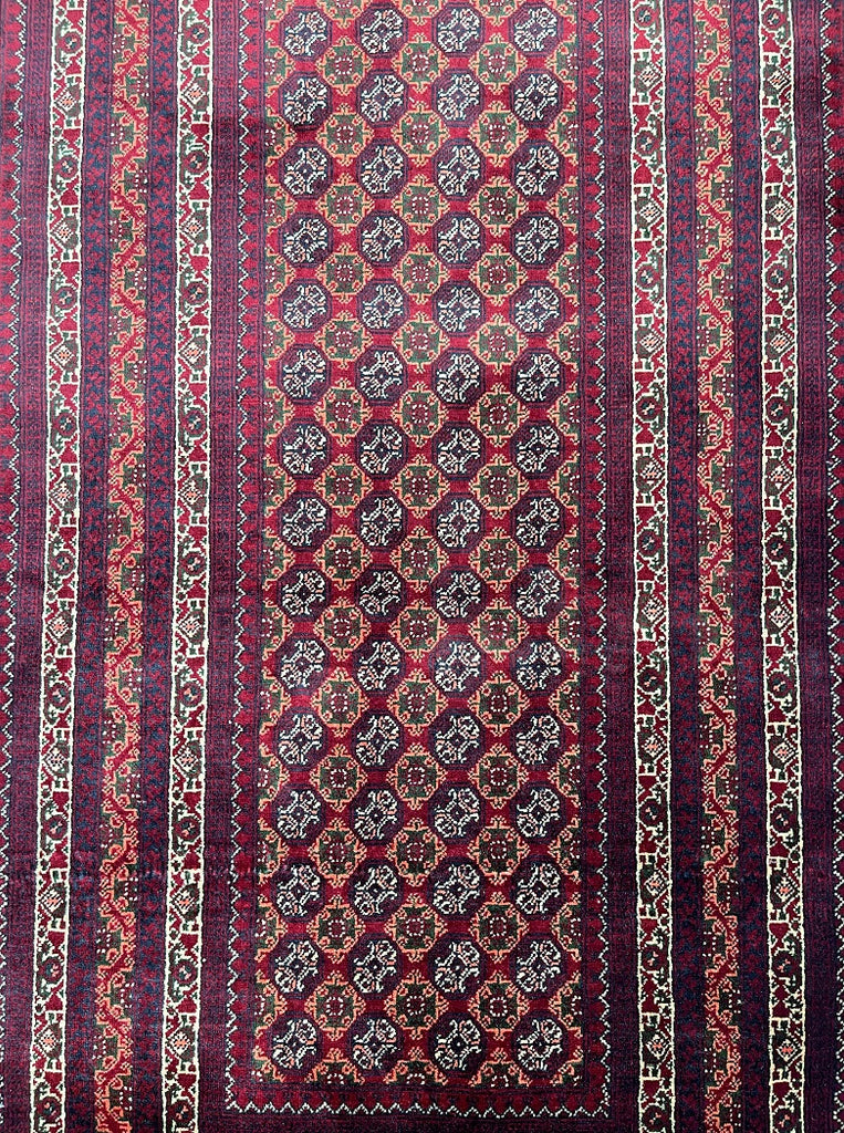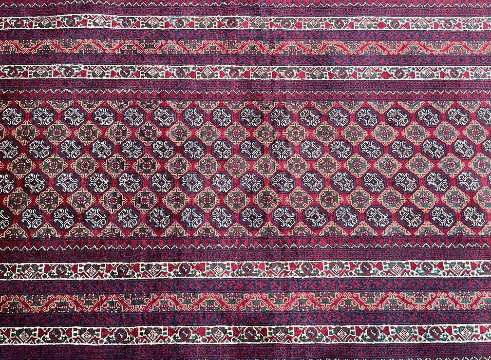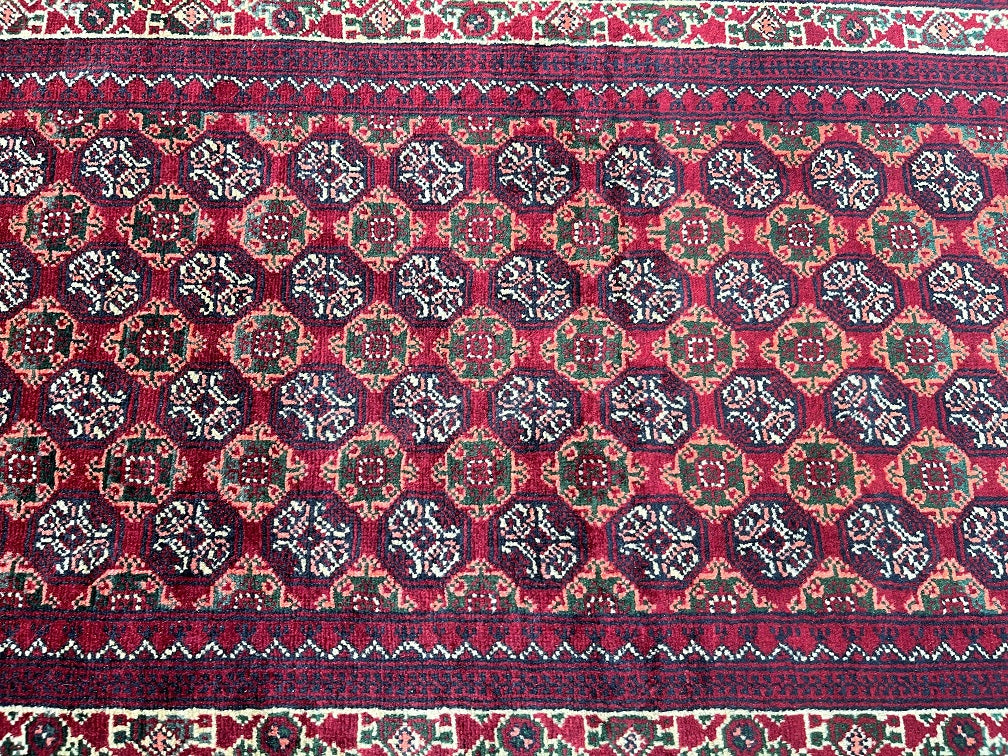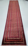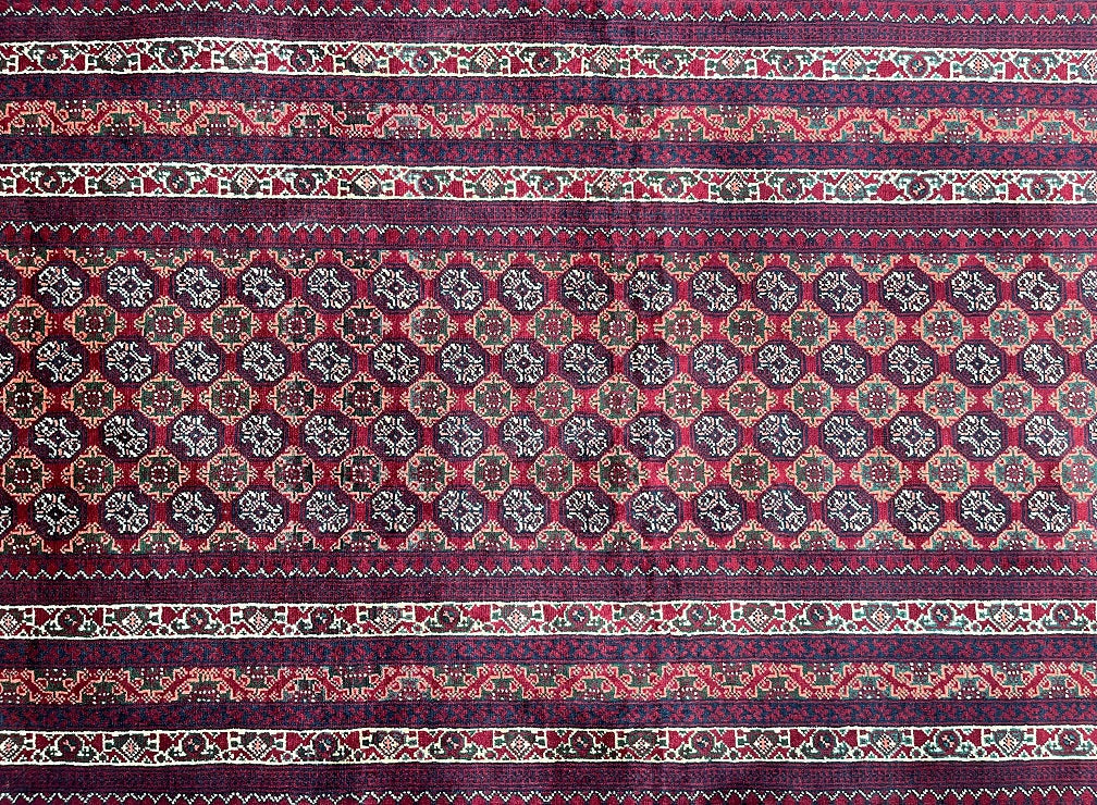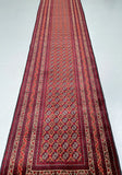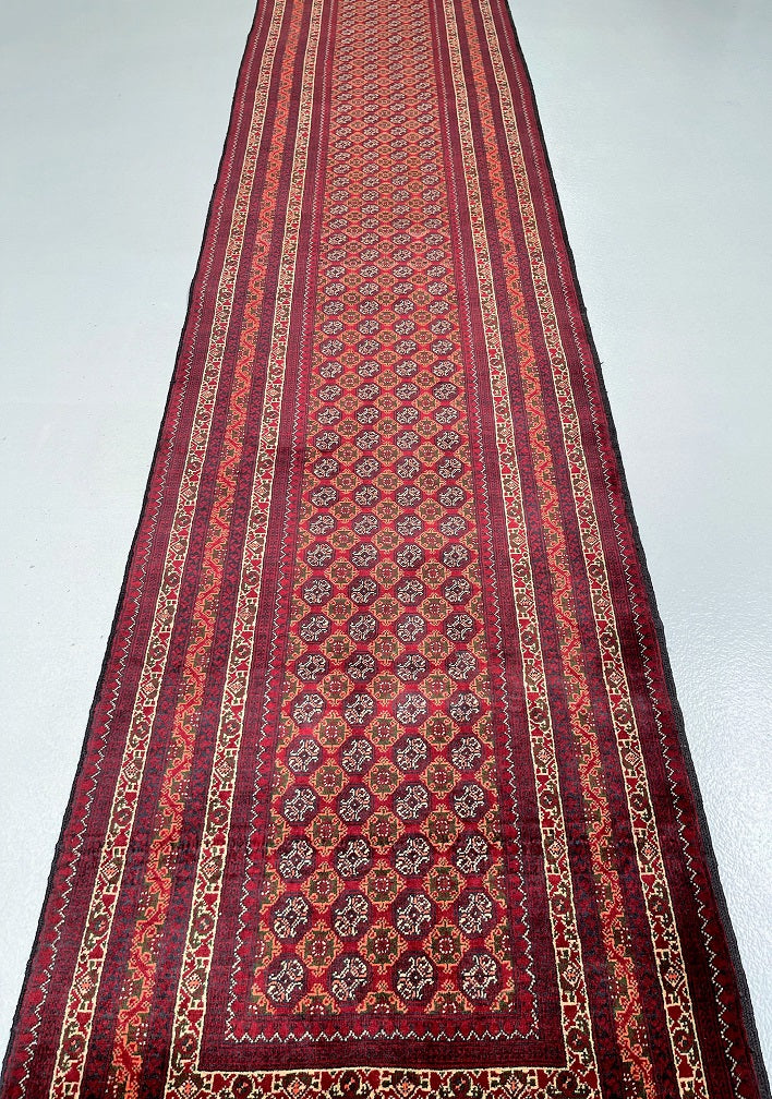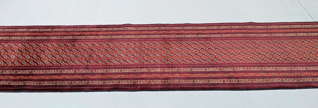 Handmade tribal Afghan Mazar Sharif Roshnai hall runner, a true gem for your home. What makes this runner even more special is that we have it available in a matching pair, allowing you to create a harmonious look in your space. Crafted with utmost care, the runner features a lamb's wool pile skilfully woven onto a cotton base. The color palette is a captivating combination of deep burgundy/maroon red, beige, black, green, and orange tones, achieved through traditional dyeing methods. This runner is particularly suited for wooden floorboards, adding a touch of elegance to your hallway. The design showcases a stunning camel foot Bukhara pattern, also known as Muri Gul, adding a unique charm to the piece. The level of craftsmanship is remarkable, with two weavers dedicating 4-6 months to complete this masterpiece. Hand-woven in Afghanistan, this hall runner measures 380 x 81 cm and holds a gallery replacement value of $5,500.