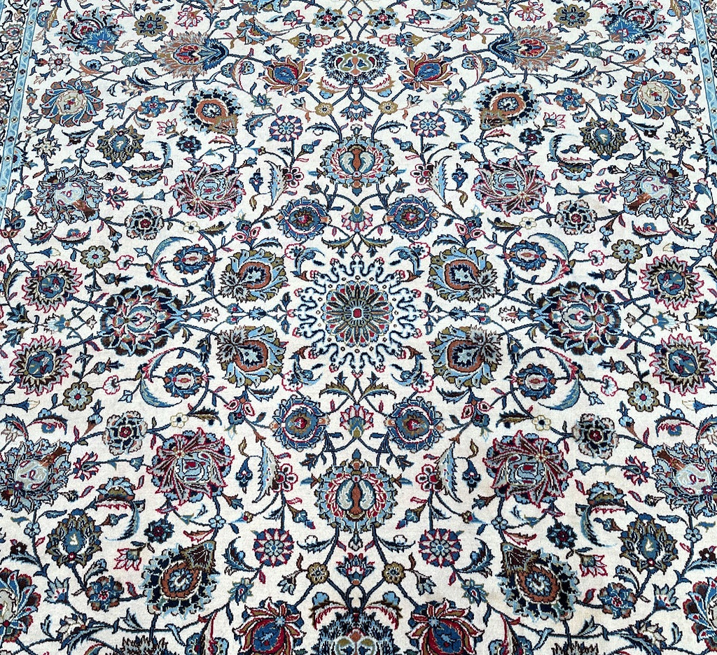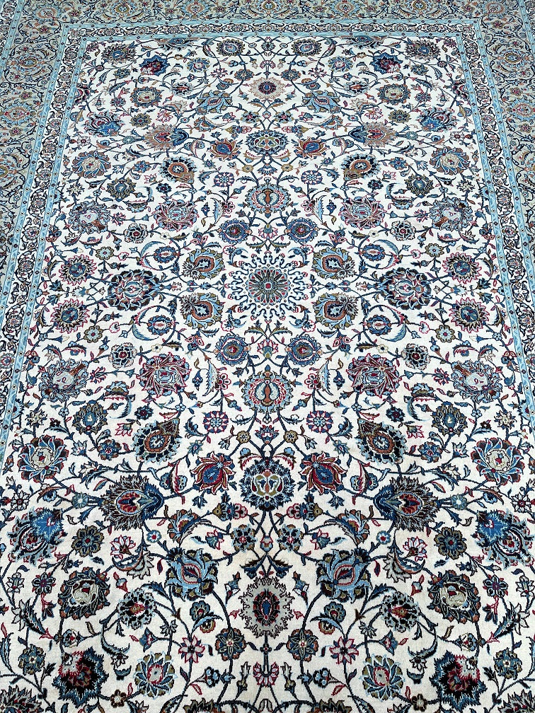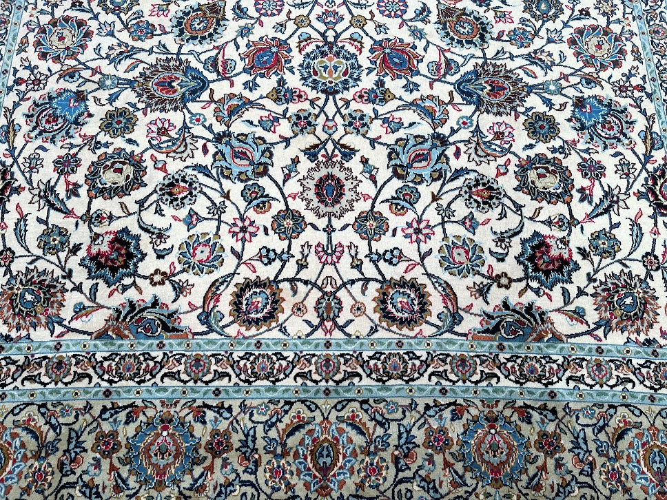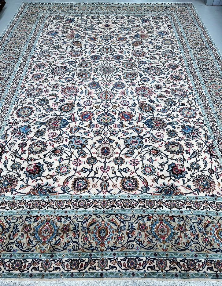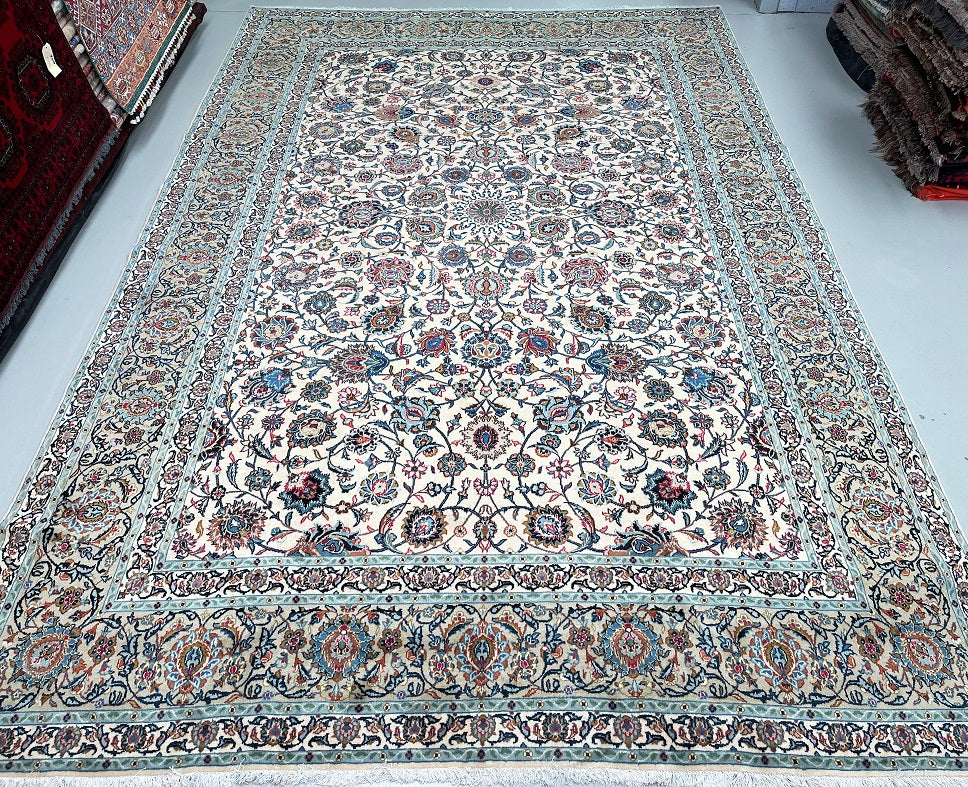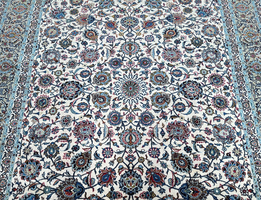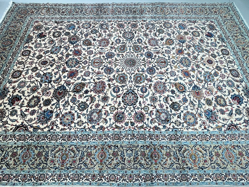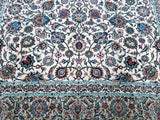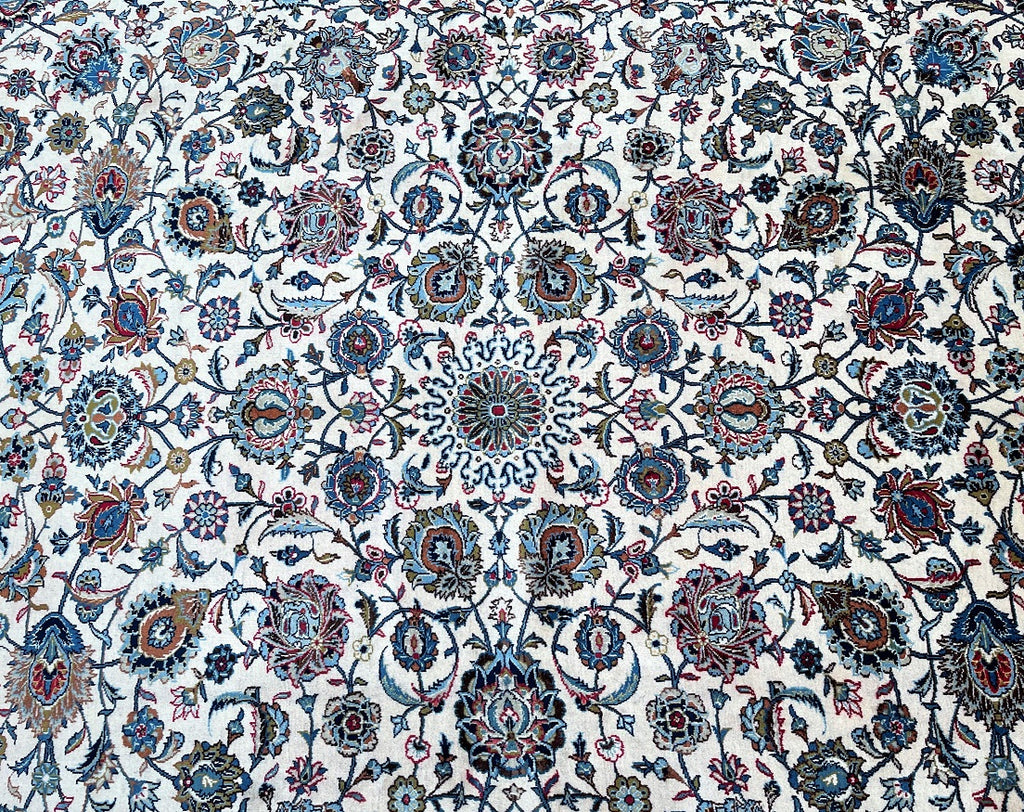 Fine Large Room Size Authentic Handmade Antique Persian Kashan Rug. Above All This Is A Rare Antique Piece In Mint Condition. It Has a Soft Lamb’s Wool Pile on Cotton Base. Beige, Indigo Blue, Aqua. Brown And Pistachio Green Tone Dyed Using Traditional Method.