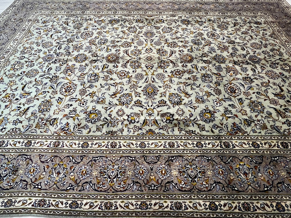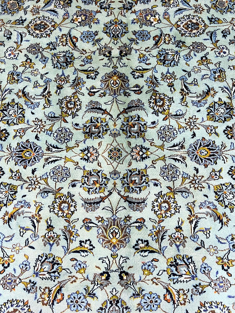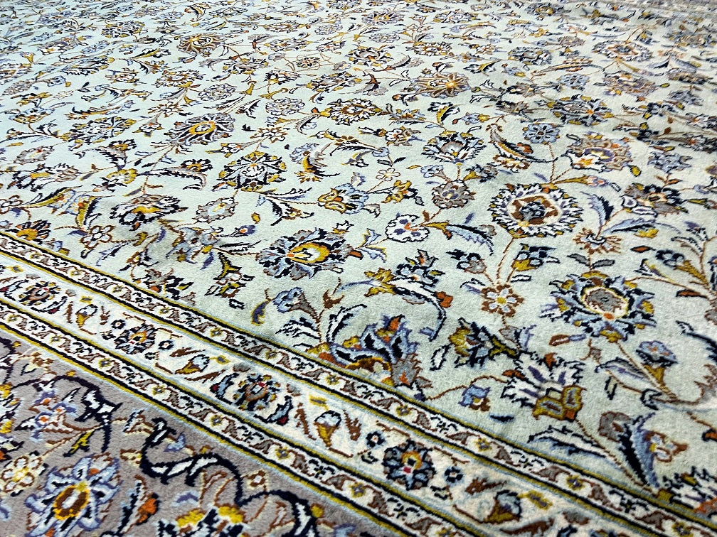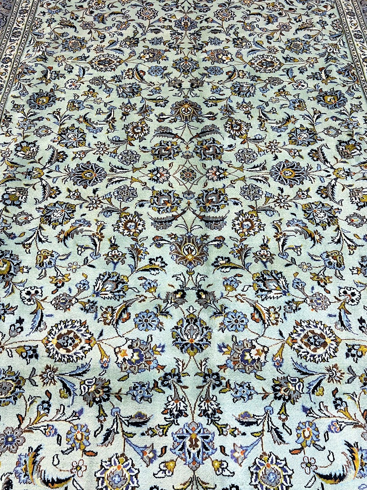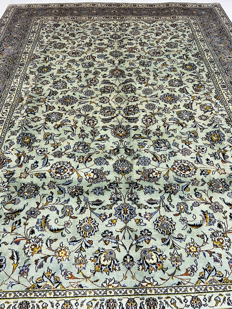 Large Room Size Authentic Handmade Persian Kashan Rug. Above All It Is Hard To Get This Quality Original Handmade Rug In This Colour. It Is Also Pure Lamb’s Wool Pile on Cotton Base. Pistachio, Beige, Indigo Blue, Mustard And Light Blue Tone Dyed Using Traditional Methods.