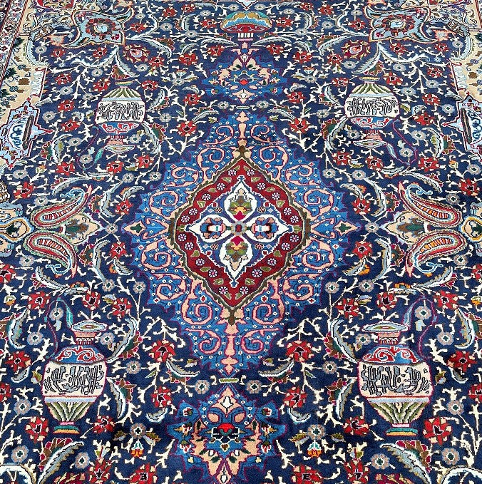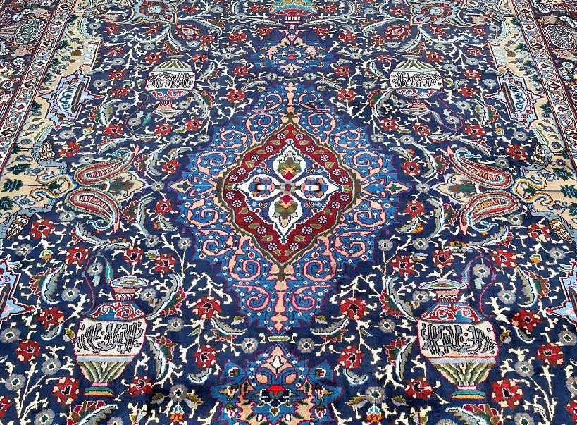 Massive Room Size Authentic Handmade Persian Kashmar Rug Signed. Above All It Is Hard To Get This Quality Handmade Rug In This Pattern. It Also Has A Pure Lamb’s Wool Pile on Cotton Base. It Also Has An Indigo Blue Background Dyed Using Traditional Methods.