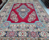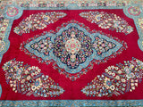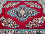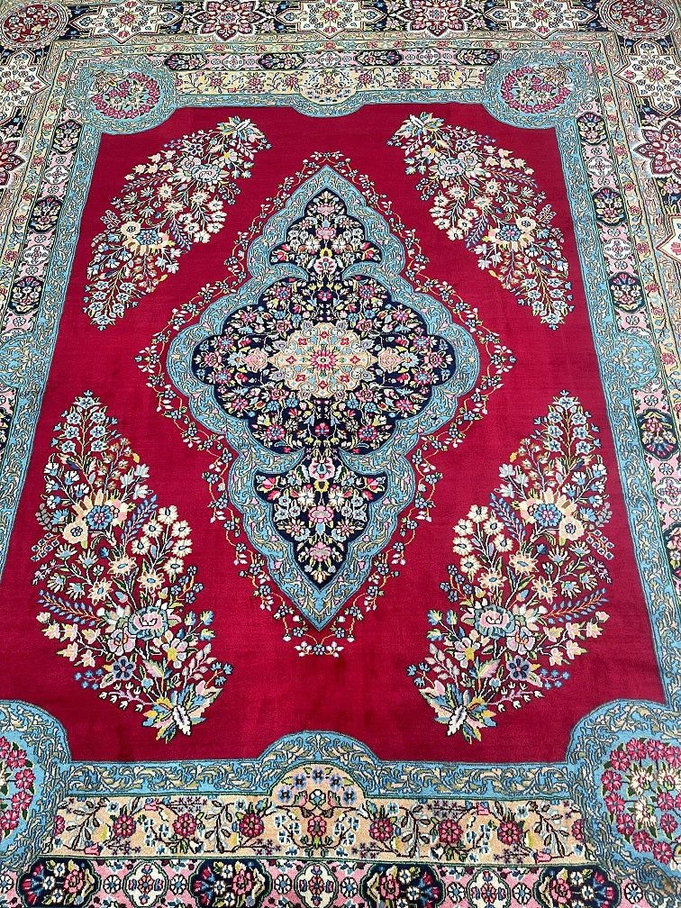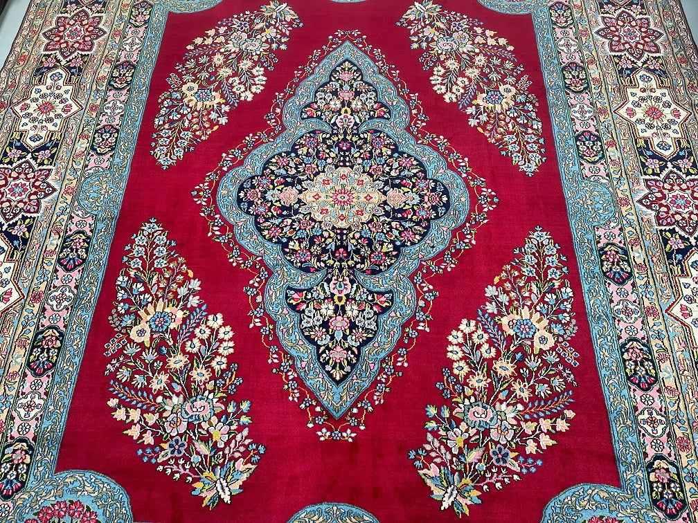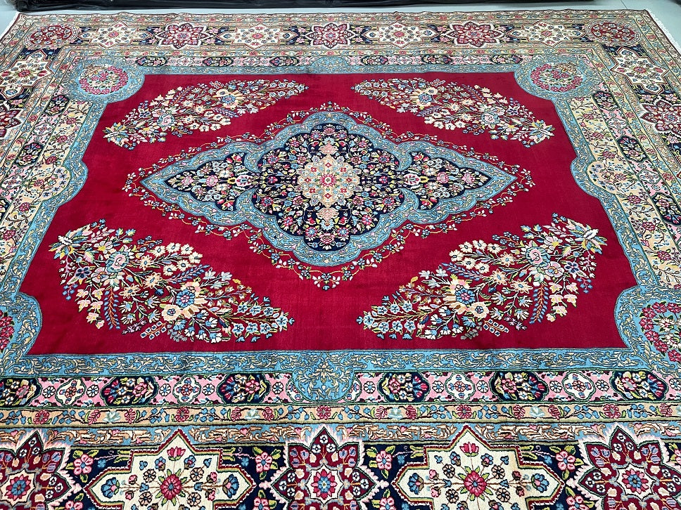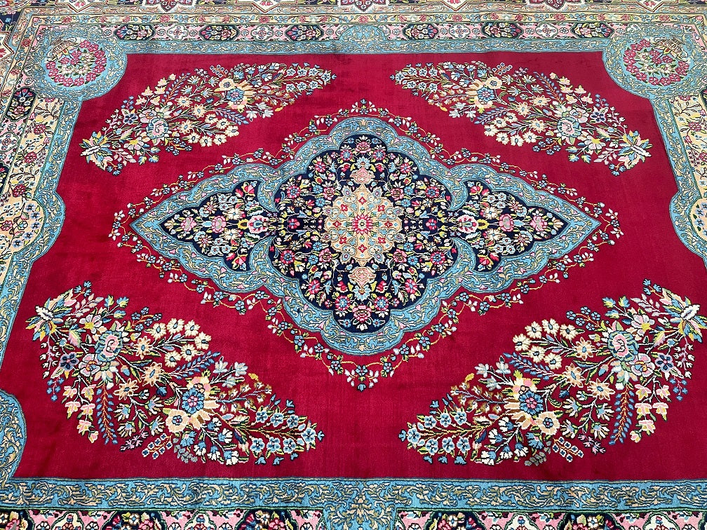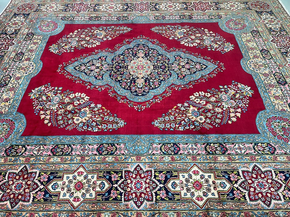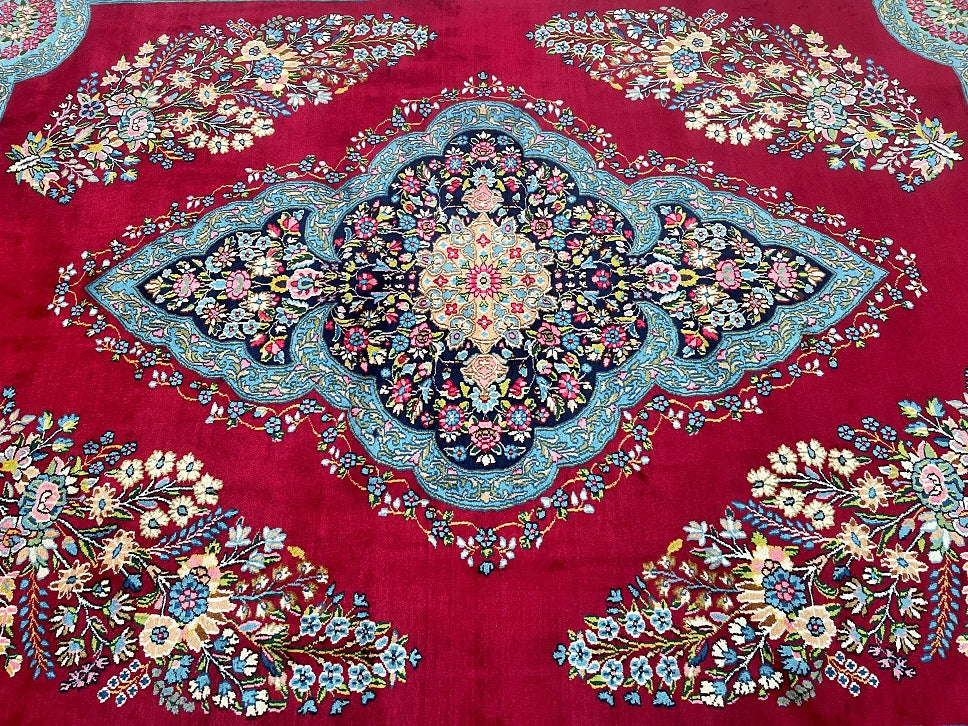 Stunning Massive Room Size Authentic Handmade Antique Persian Kerman Rug Woven Circa 1950’s. Above All We Do Have This Rug In A Matching Pair. It Is Also In Superb Condition And Has Been In Someone Collection For Many Years. It Has A Pure Lamb’s Wool Pile On Cotton Base. Maroon Red, Green, French Blue, Pink, Indigo Blue/Black And Beige Tone Dyed Using Traditional Methods.