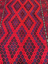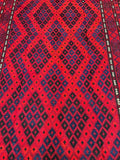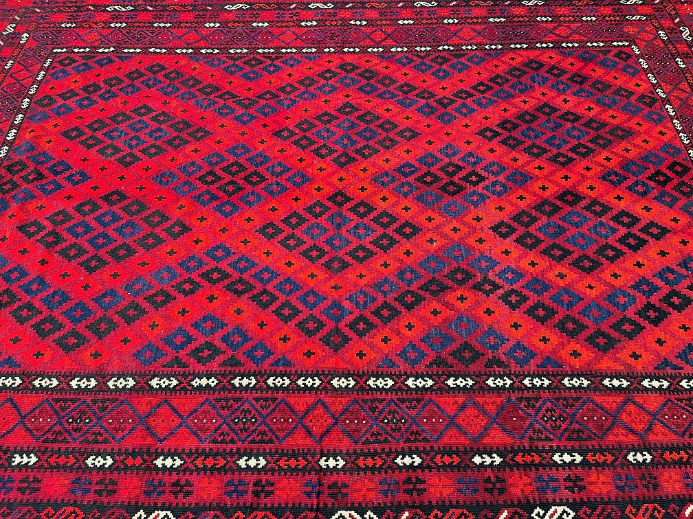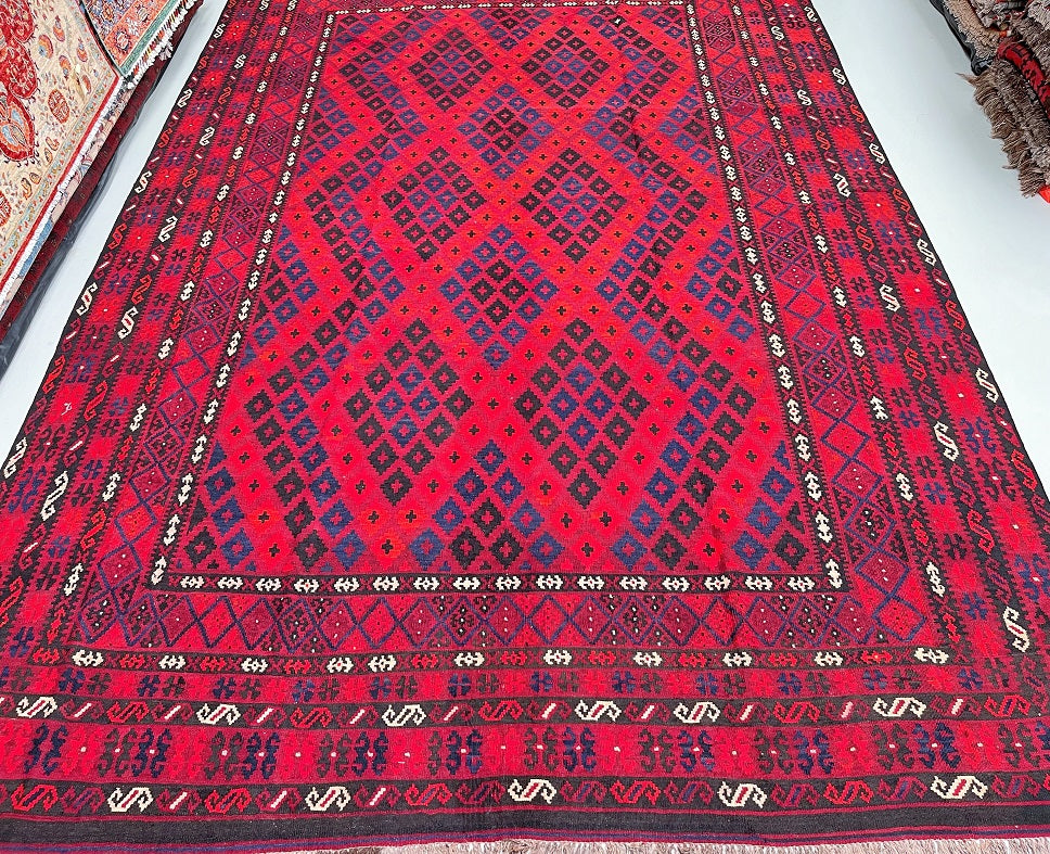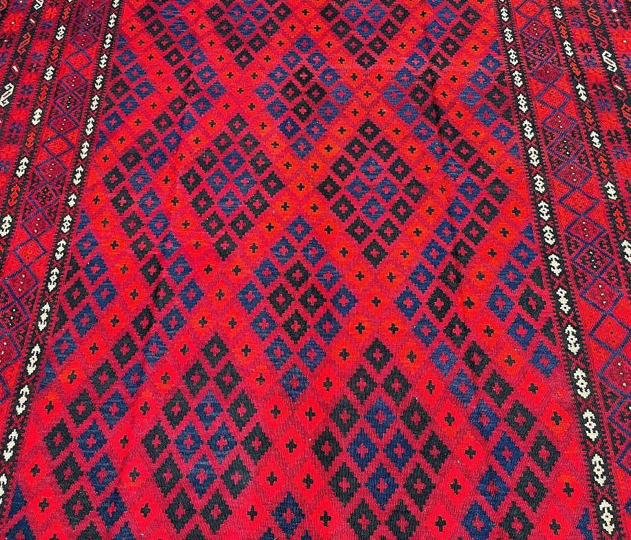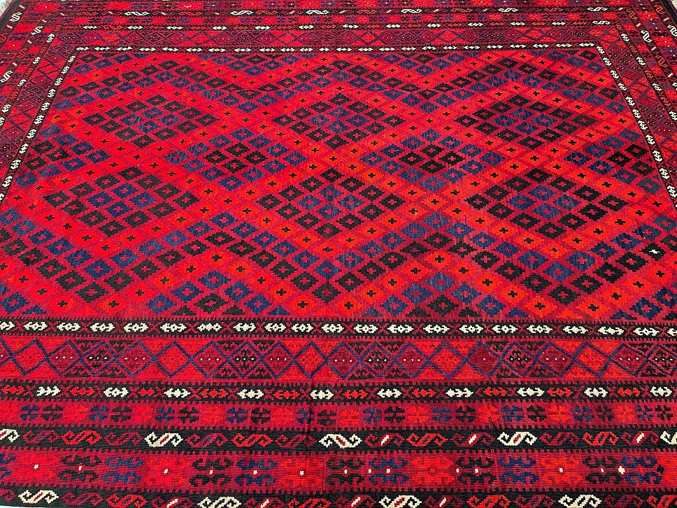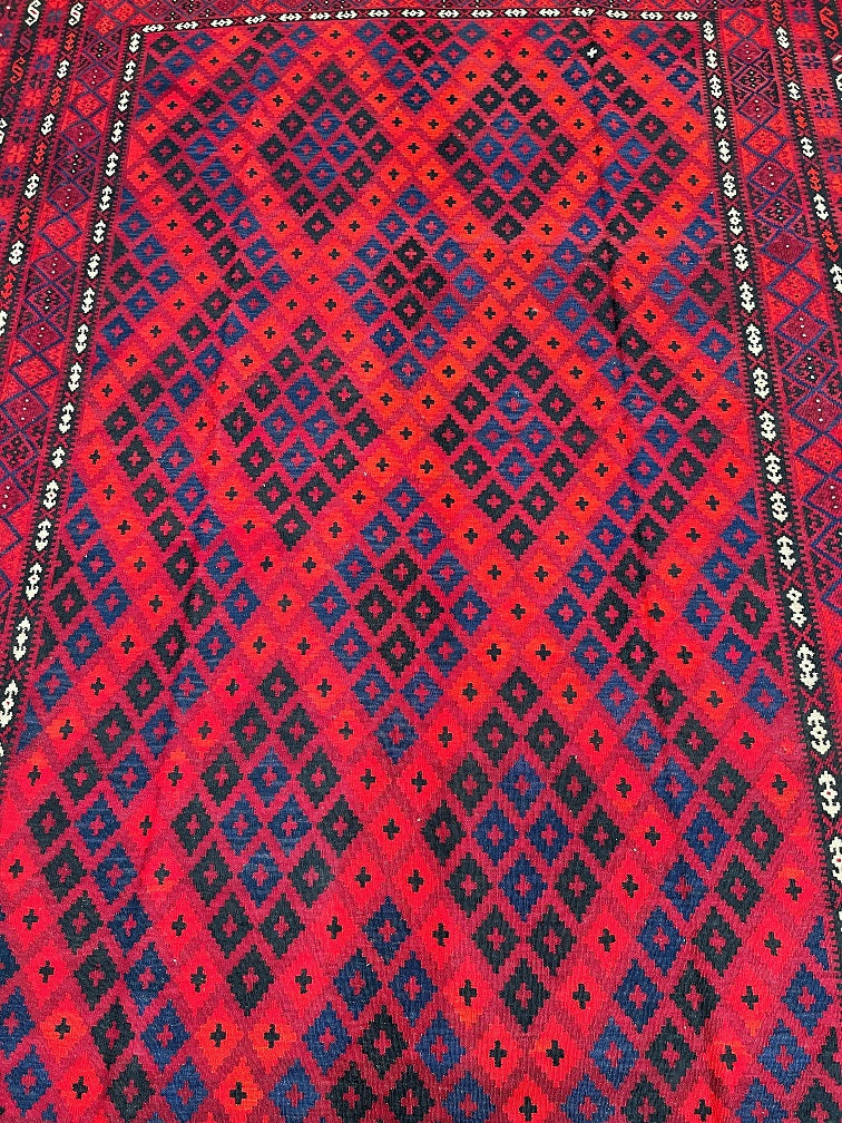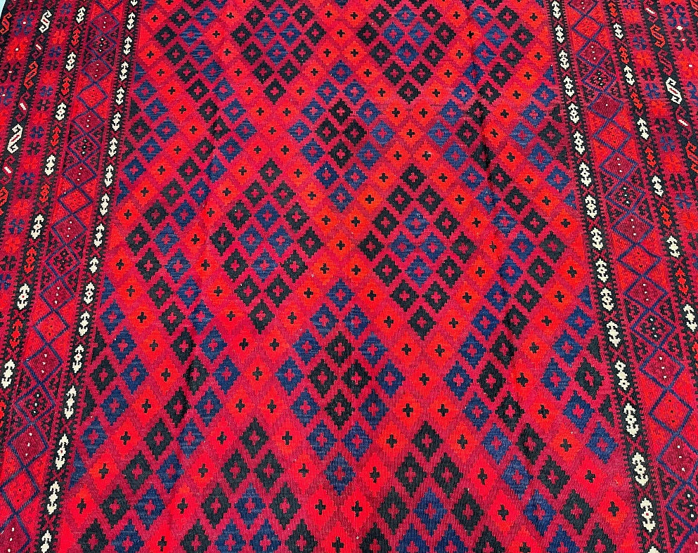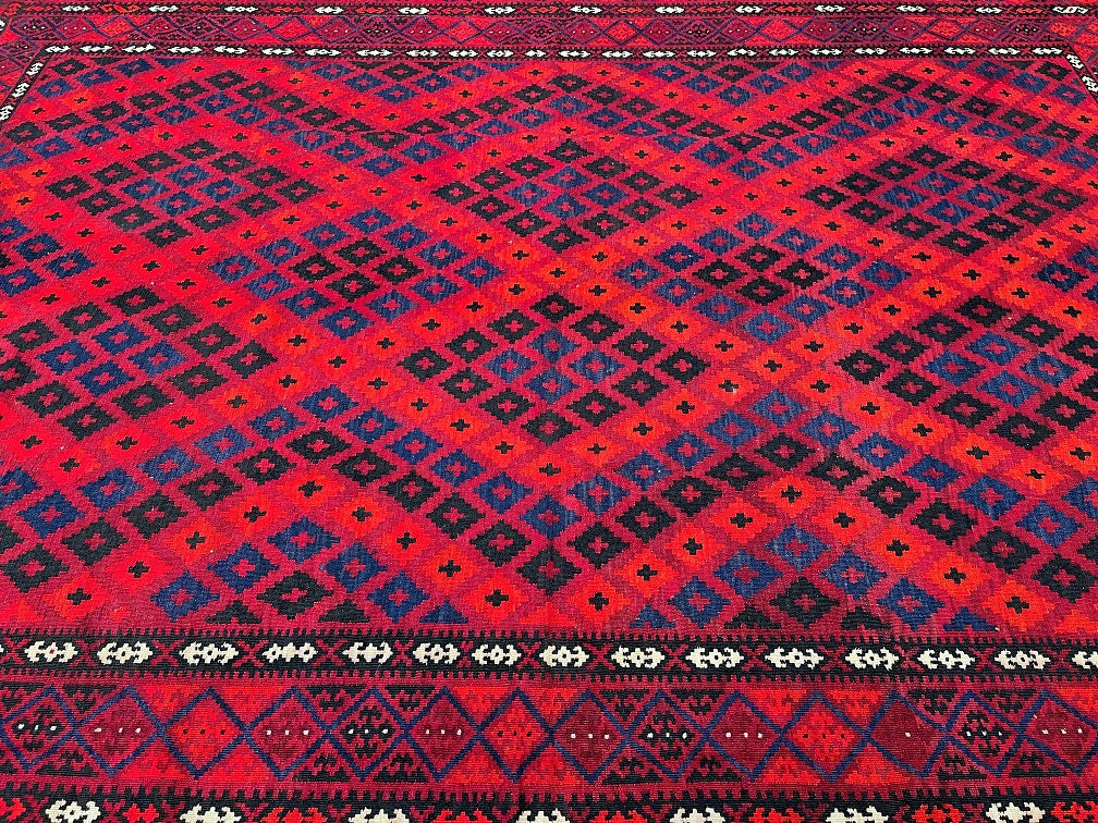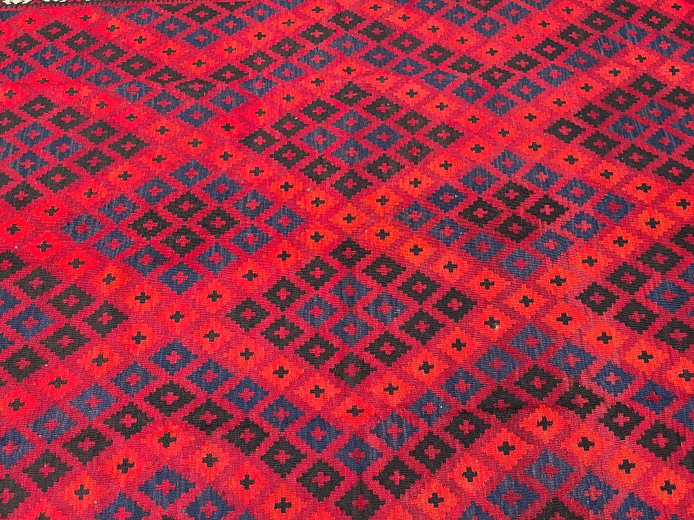 This beautiful vintage Afghan Meymaneh Kilim rug is perfect for larger rooms such as lounges or dining areas. It features a pure hand-spun wool pile on a wool base, providing a luxurious and durable texture. The rug showcases a stunning combination of red, black, beige, indigo blue, and orange tones, all dyed using traditional methods. Its design boasts geometric diamond medallions in a tribal style, adding a touch of cultural charm to any space.