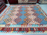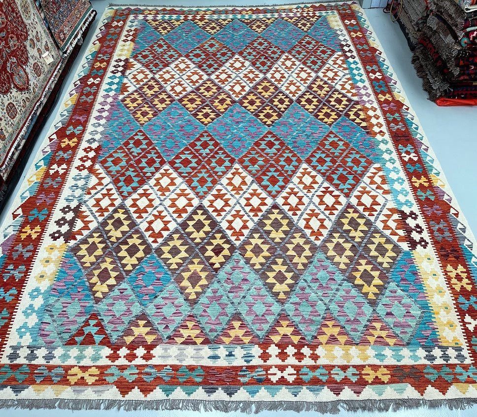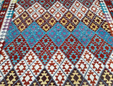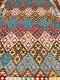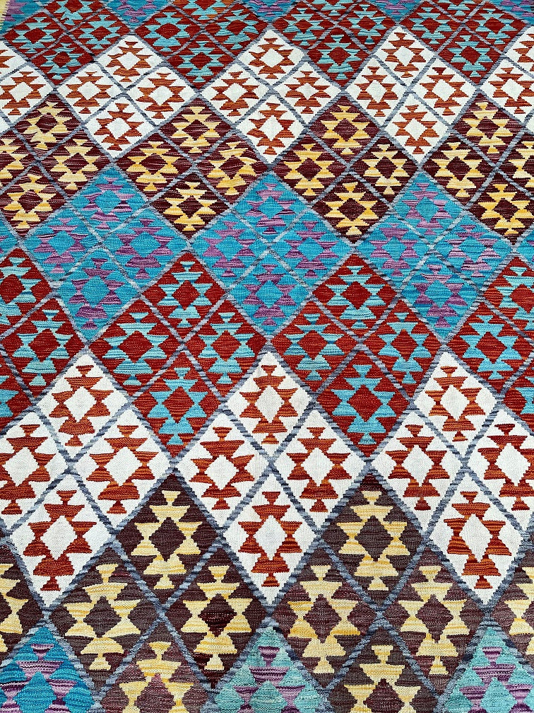 Massive Room Size Handmade Afghan Aryana Kilim Rug. Above All It Is Rare To Find These Boho Kilim Rugs In Such Large Size. It Also Has A Pure Hand Spun Wool Pile On Wool Base. Multi-Color Tone Dyed Using Vegetable Roots.