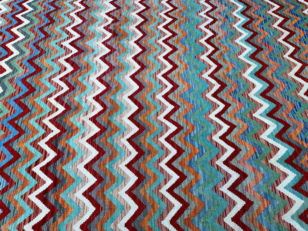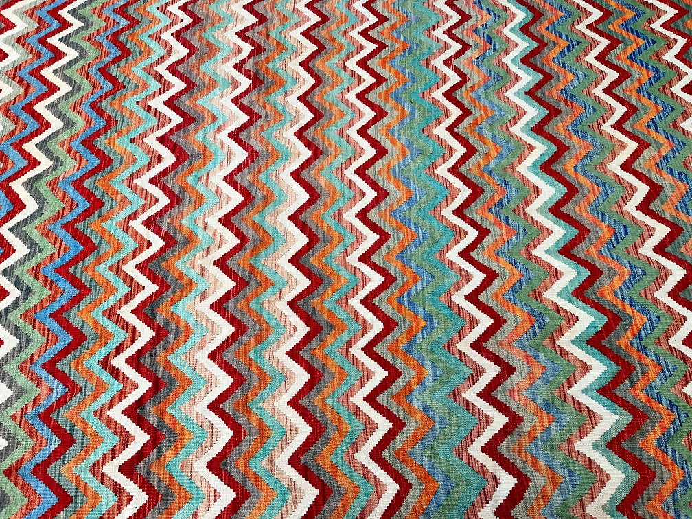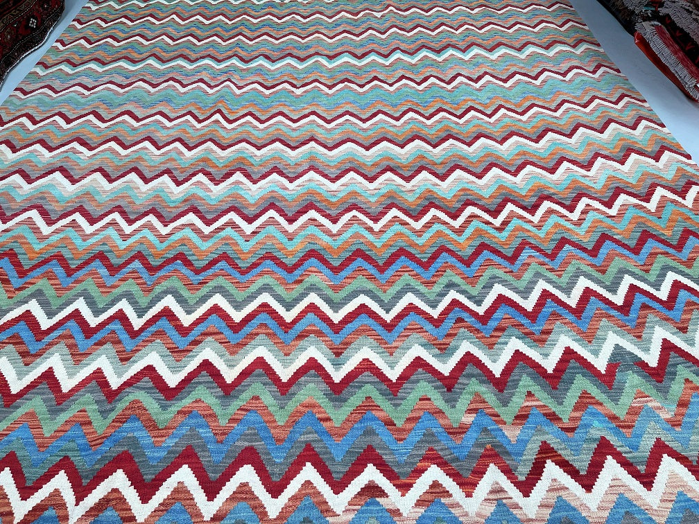 Massive Room Size Hand Woven Boho Design Afghan Kyber Kilim Rug. Above All It Is Rare To Find These Boho Kilim Rugs In Such Large Size. It Also Has A Pure Hand Spun Wool Pile On Wool Base. Multi-Color Tone Dyed Using Vegetable Roots.