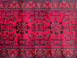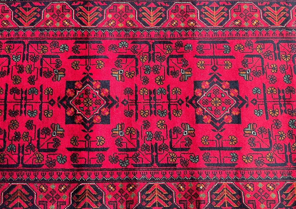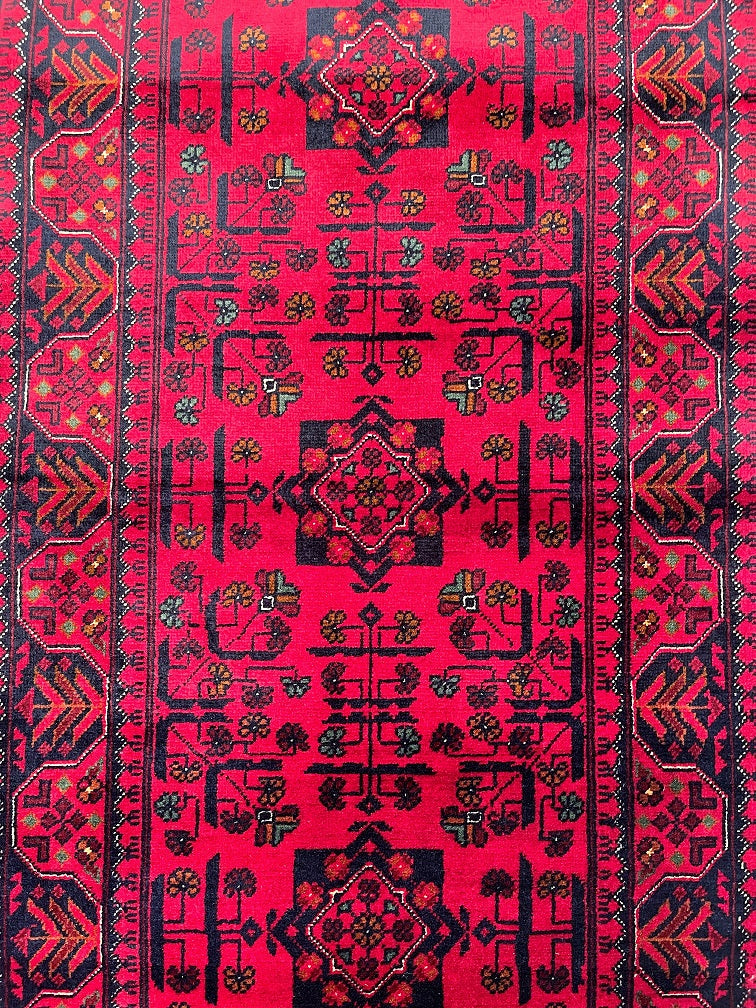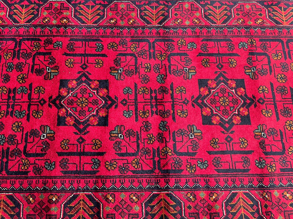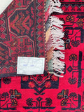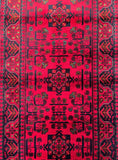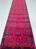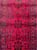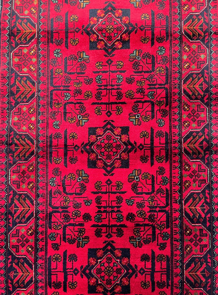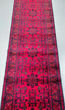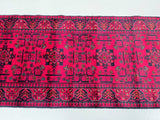Authentic handmade Tribal Afghan Khamyab Hall Runner. Notably, this tribal piece features a lamb's wool pile on a cotton base, ensuring both quality and comfort. The maroon/burgundy tone is achieved through traditional dyeing methods, adding to its allure. This runner is particularly suited for wooden floorboards, enhancing the overall aesthetic. With a semi-geometric, semi-floral design, it showcases a unique blend of patterns. It is worth mentioning that a skilled weaver dedicated approximately 3-4 months to complete. Hand Knotted in Afghanistan, this runner exemplifies the craftsmanship of the region. Its size measures 295 x 80 cm, making it suitable for hallways or narrow spaces. The gallery replacement value of this exceptional piece is estimated at $3,499.