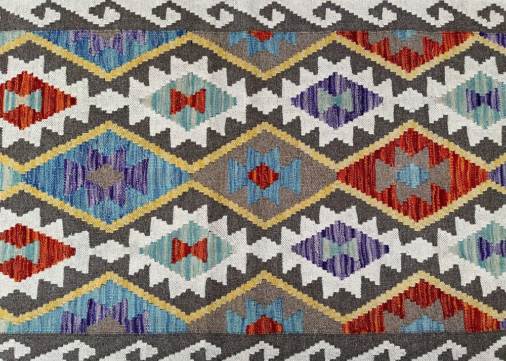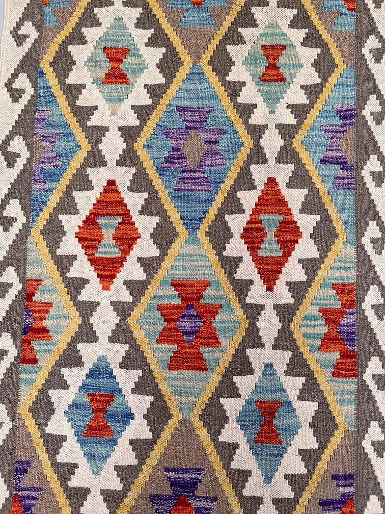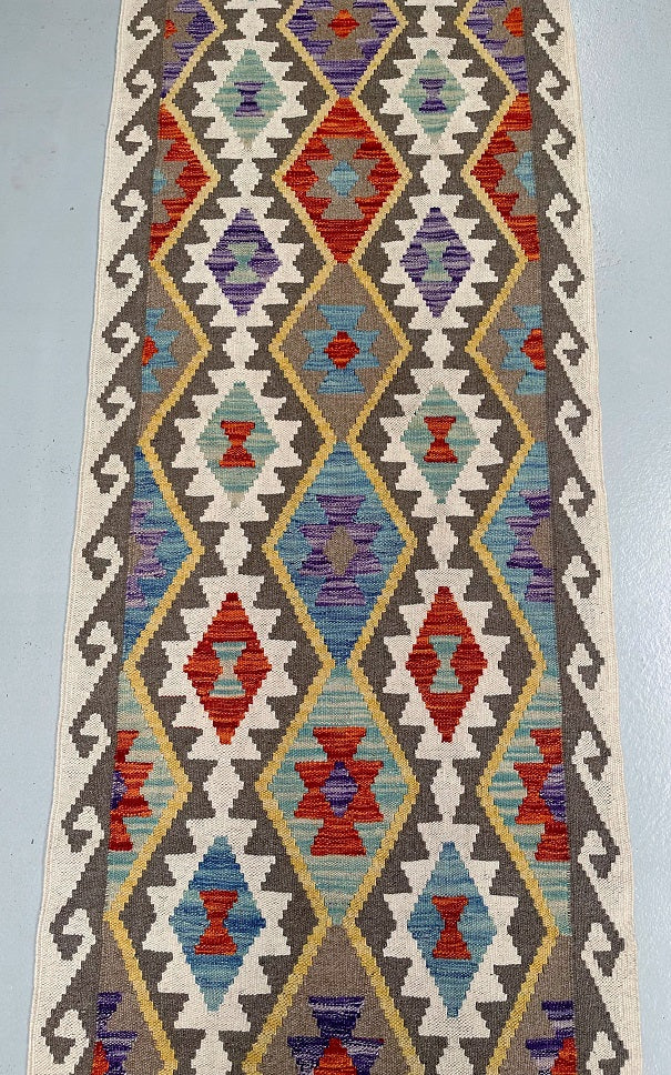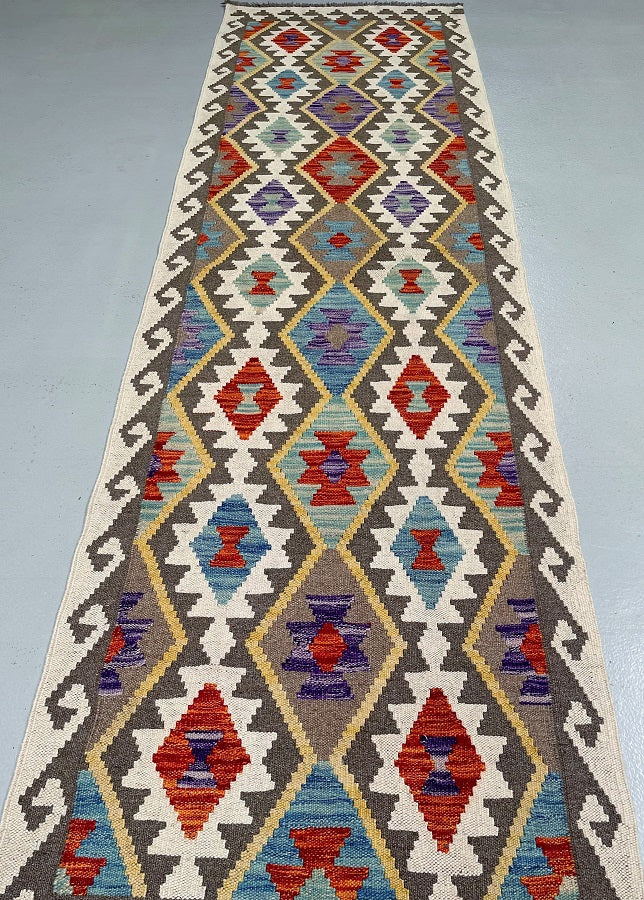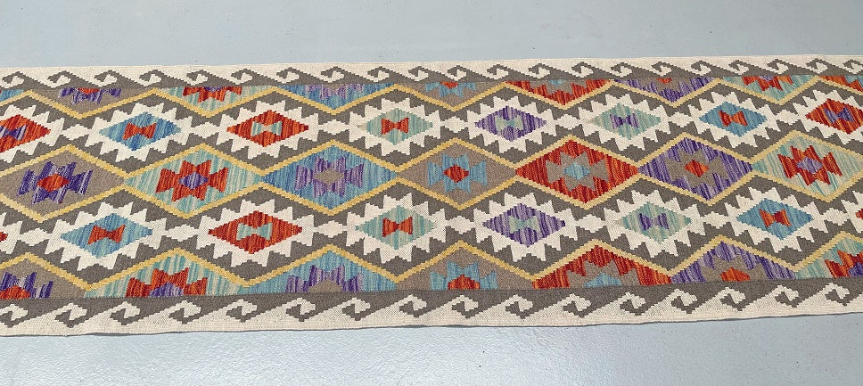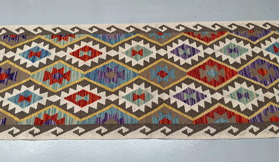 Authentic Hand Woven Afghan Aryana Kilim Hall Runner. Above All It Is Reversible. It Also Has A Pure Hand Spun Wool Pile On Wool Base. Beige, Brown, Blue, Red And Yellow Tone Dyed Using Vegetable Roots.