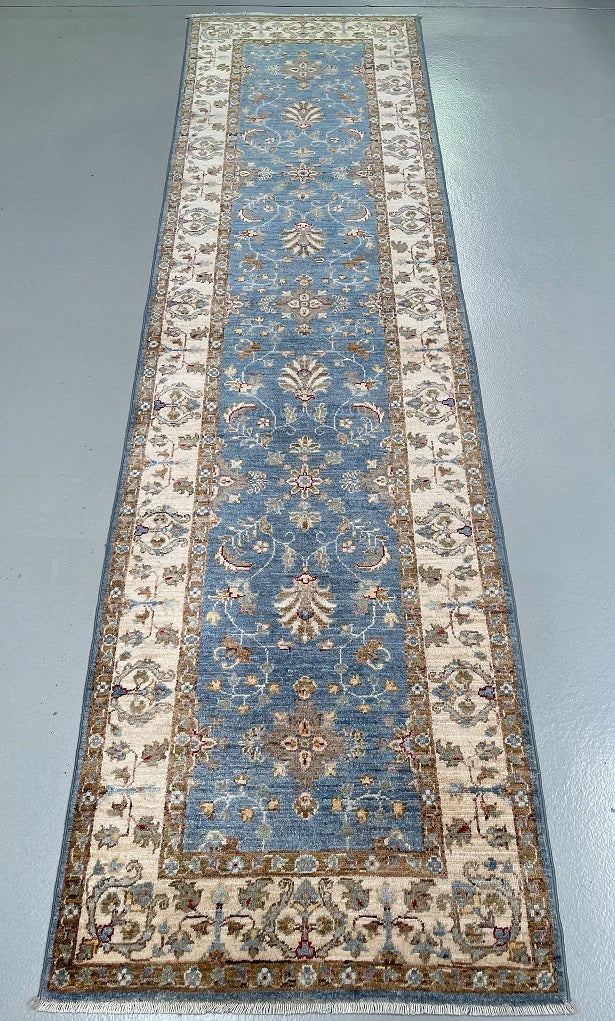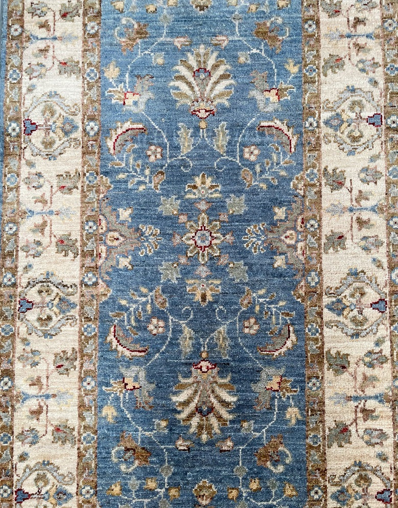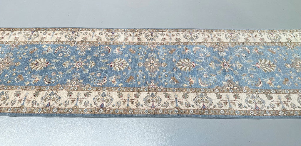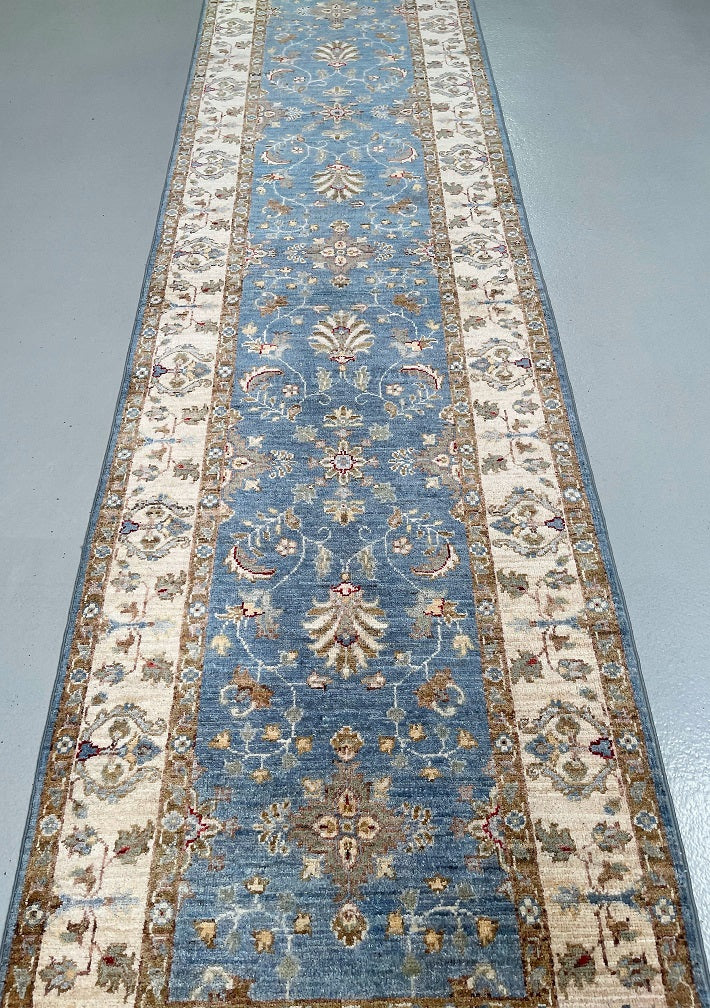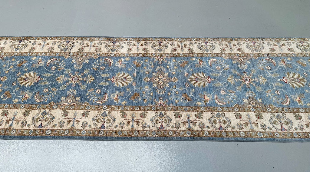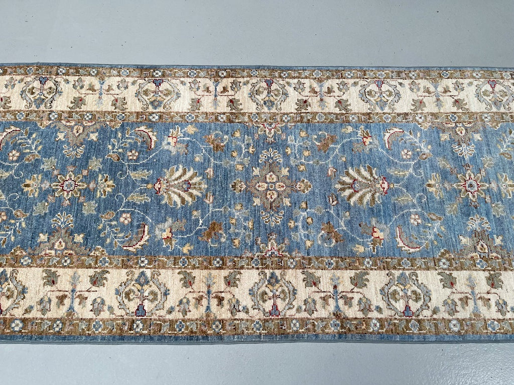 Superb Handmade Afghan Sultani Chobi Hall Runner. Above All It Has A Soft Hand Spun Wool Pile On Cotton Base. Light Blue, Beige, Grey, Maroon And Brown Tone Dyed Using Traditional Methods (Vegetable Dyes).