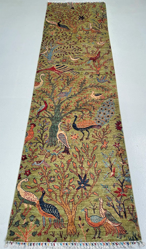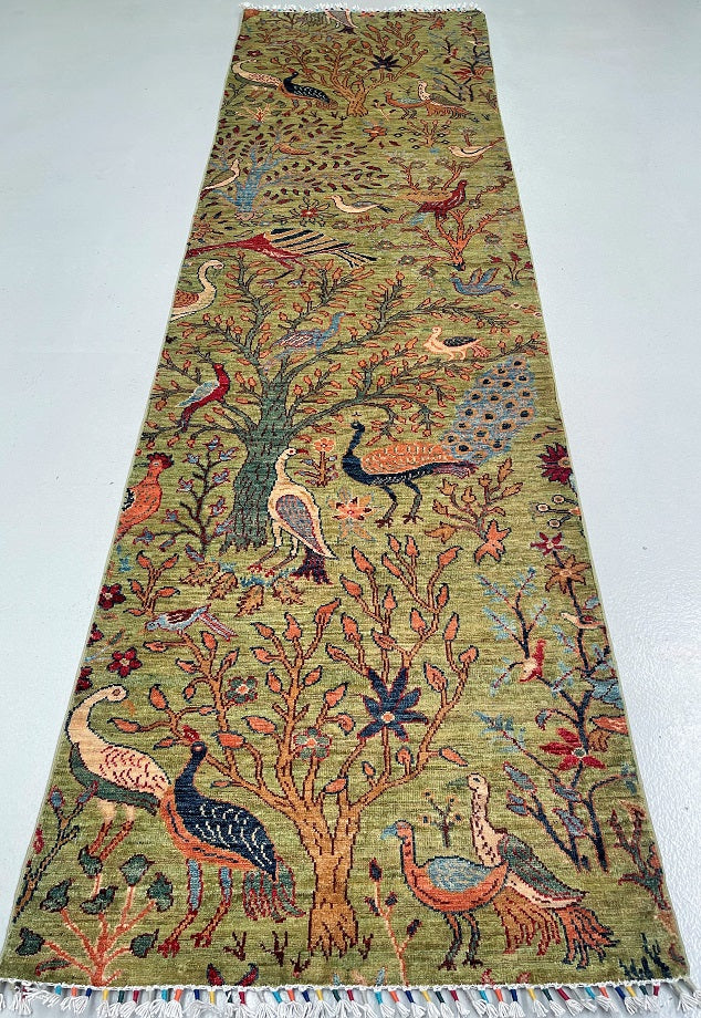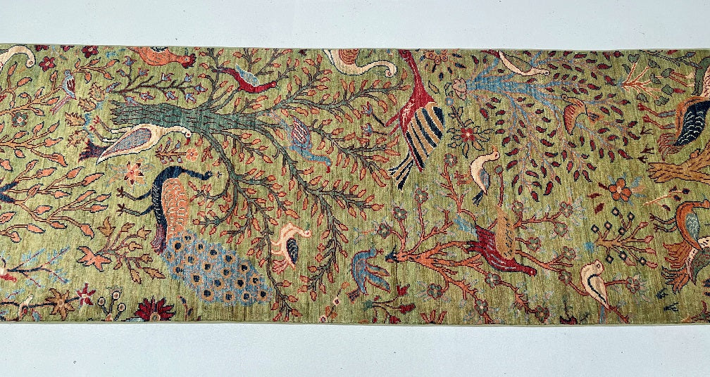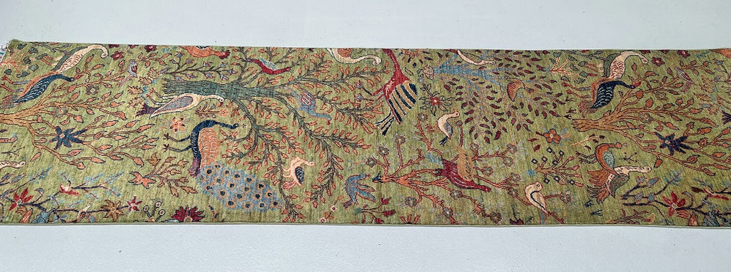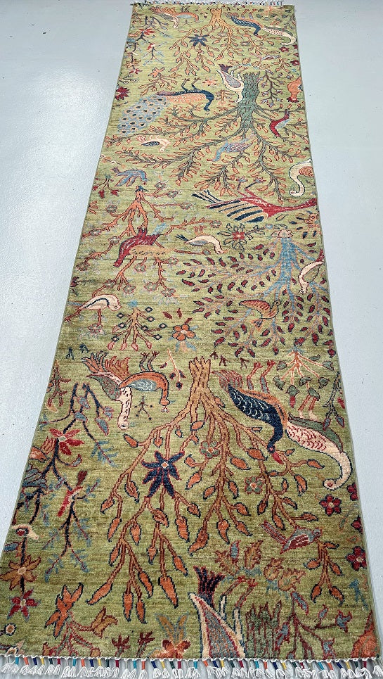 Unique Handmade Afghan Sultani Chobi Hall Runner. Above All It Has A Pure Wool Pile On Cotton Base. Green, Beige, Brown, Orange, Blue And Red Tones Dyed Using Traditional Methods (Vegetable Dyes).