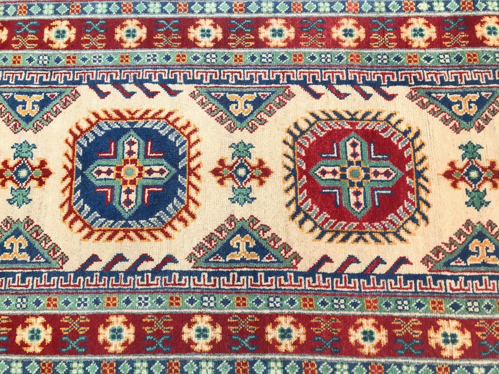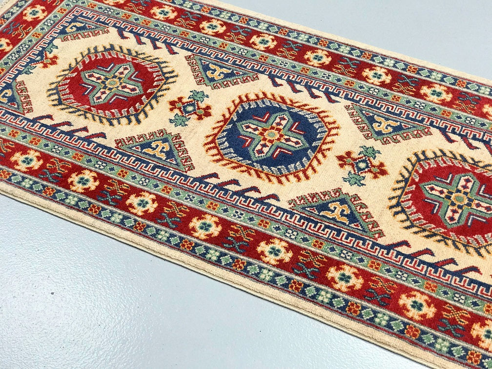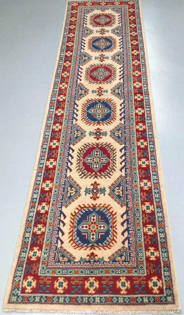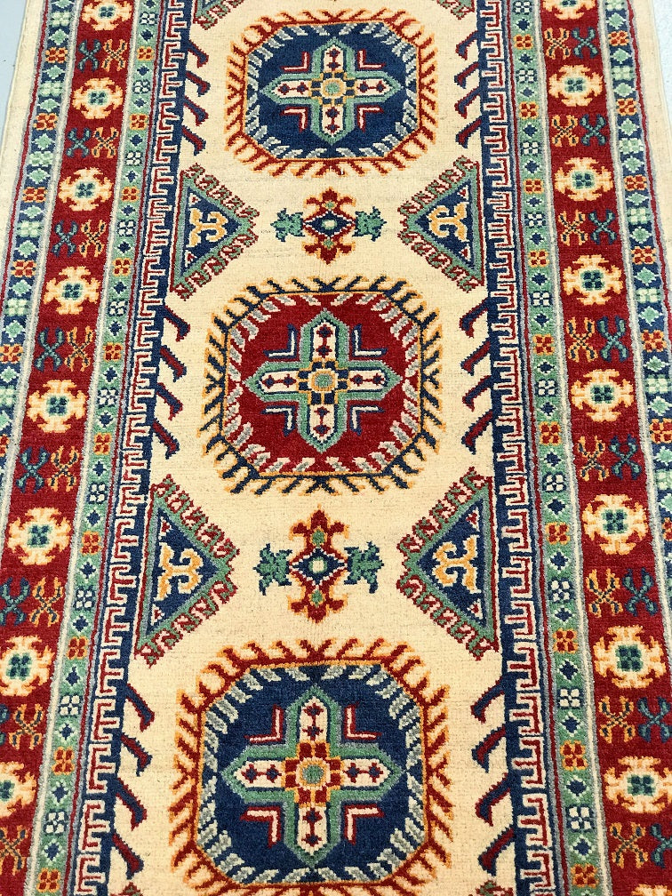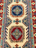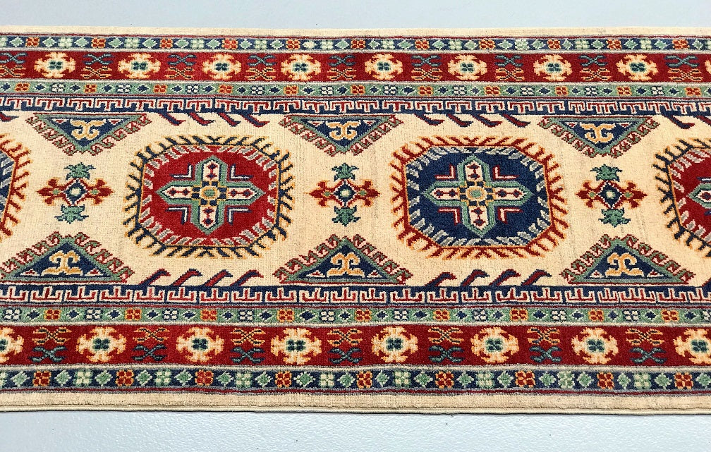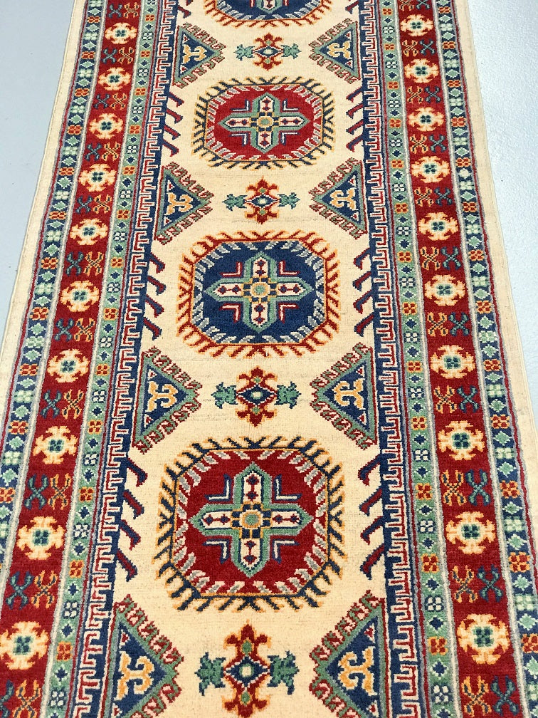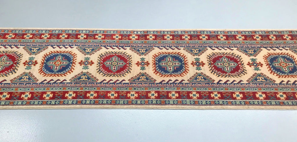 Authentic Nomadic Handmade Afghan Kazak Runner. Above All We Do Have This Runner In Matching Pair. It Has A Pure Hand Spun Wool Pile On Cotton Base. Beige, Blue and Red Tone Dyed Using Traditional Methods (Vegetable Dyes). Last of True Woven Tribal Art.