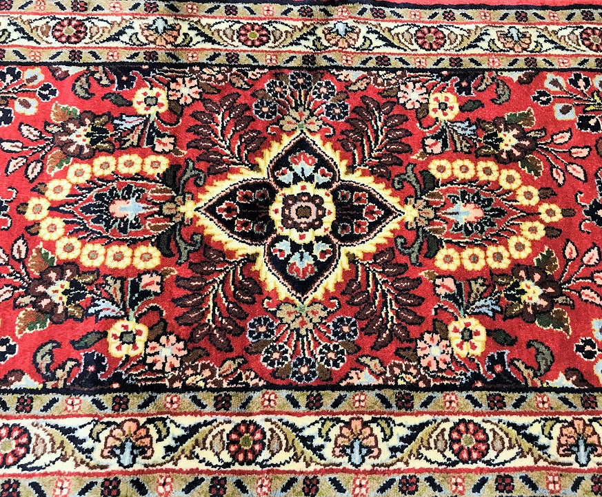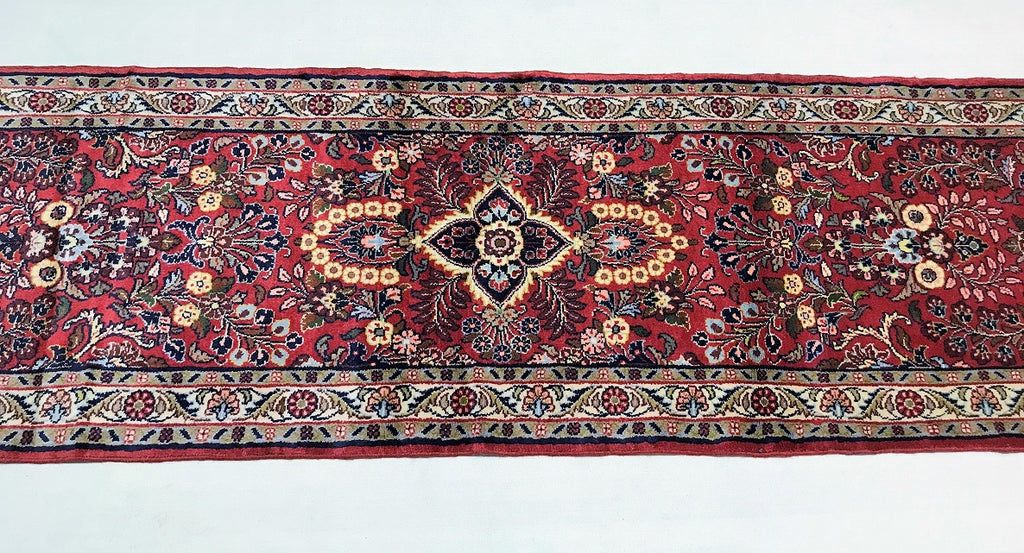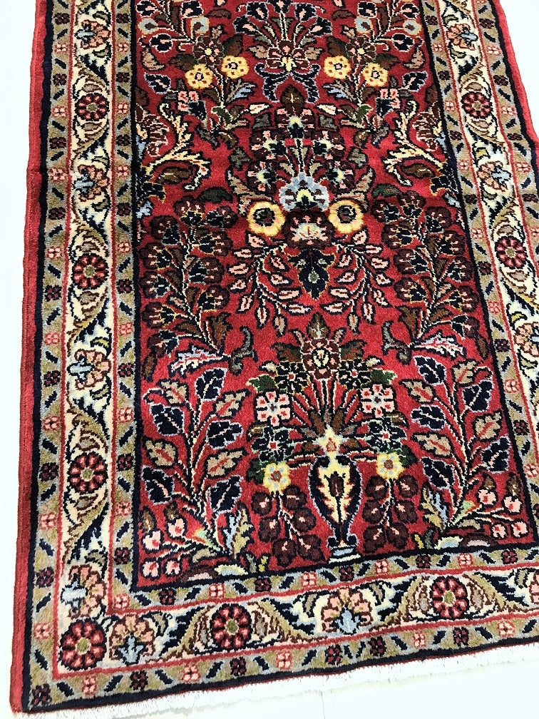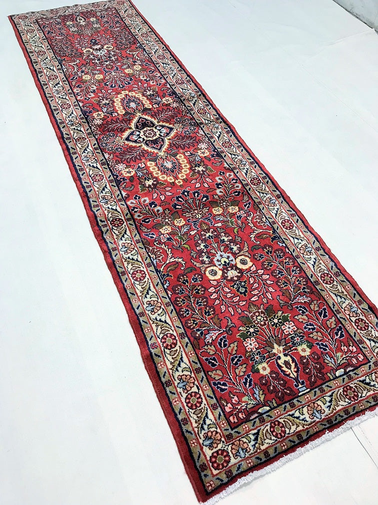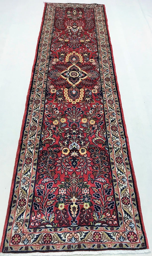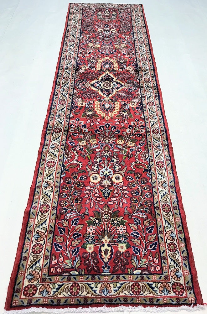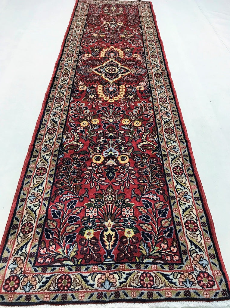 Pure Wool Authentic Hand Knotted Persian Lilian Hall Runner. Above All This Is a Collectable Item Made By An Armenian Weaver Settled In Central West Persia. It Also Has Pure Wool Pile On Cotton Base. Maroon, Blue, Beige, Black, Orange and Green Tone Dyed Using Traditional Methods.