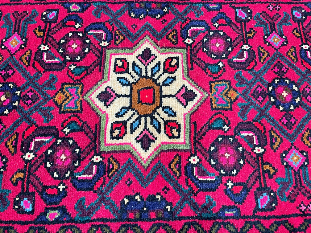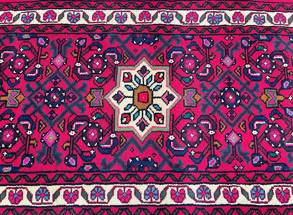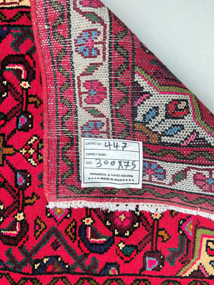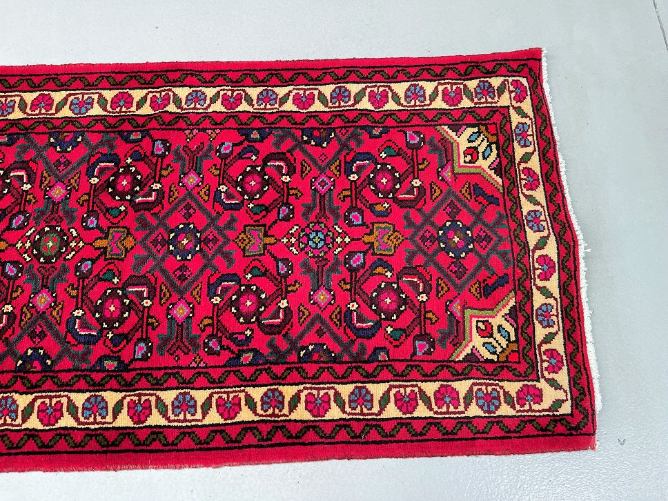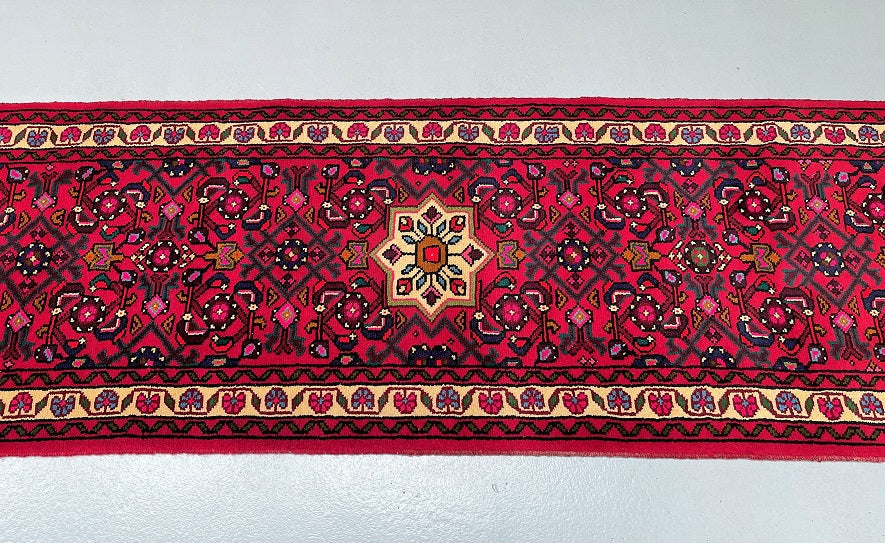 3m Long Handmade Persian Enjelas Hall Runner. Above All It Has A Slight Bend Which You See With Many Handmade Runners. It Also Has Pure Hand Spun Wool Pile On Cotton Base. Gorgeous Red, Beige, Green, Blue, Orange And Pink Tone Dyed Using Traditional Methods.