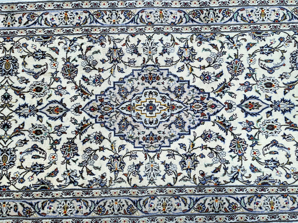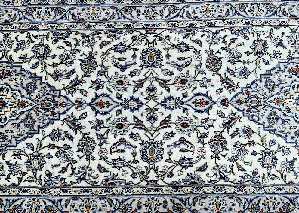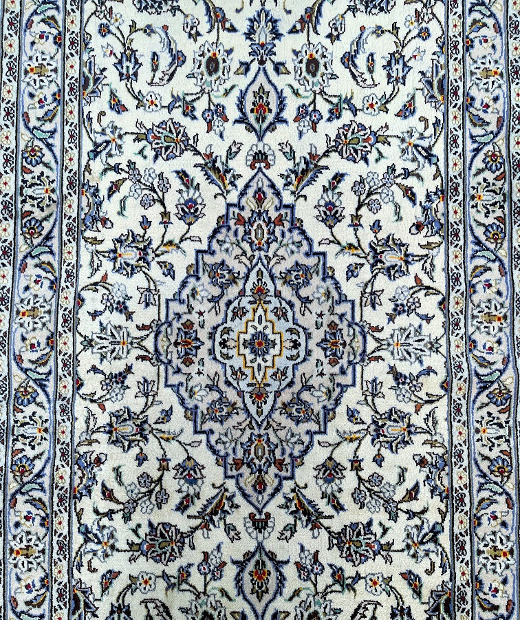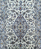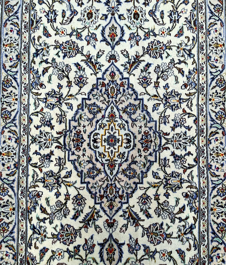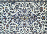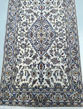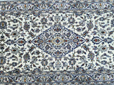 Rare Authentic Handmade Persian Kashan Hall Runner. Above All It Is Hard To Get This Quality Original Handmade Rug In Hall Runner. Pure Wool Pile on Cotton Base. Main Colors Are Beige, Indigo Blue, Light Blue, Green, Brown And Red Tones Dyed Using Traditional Methods.