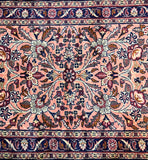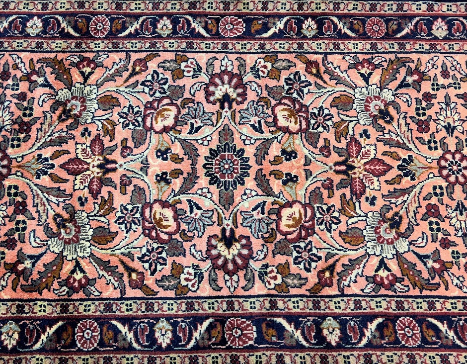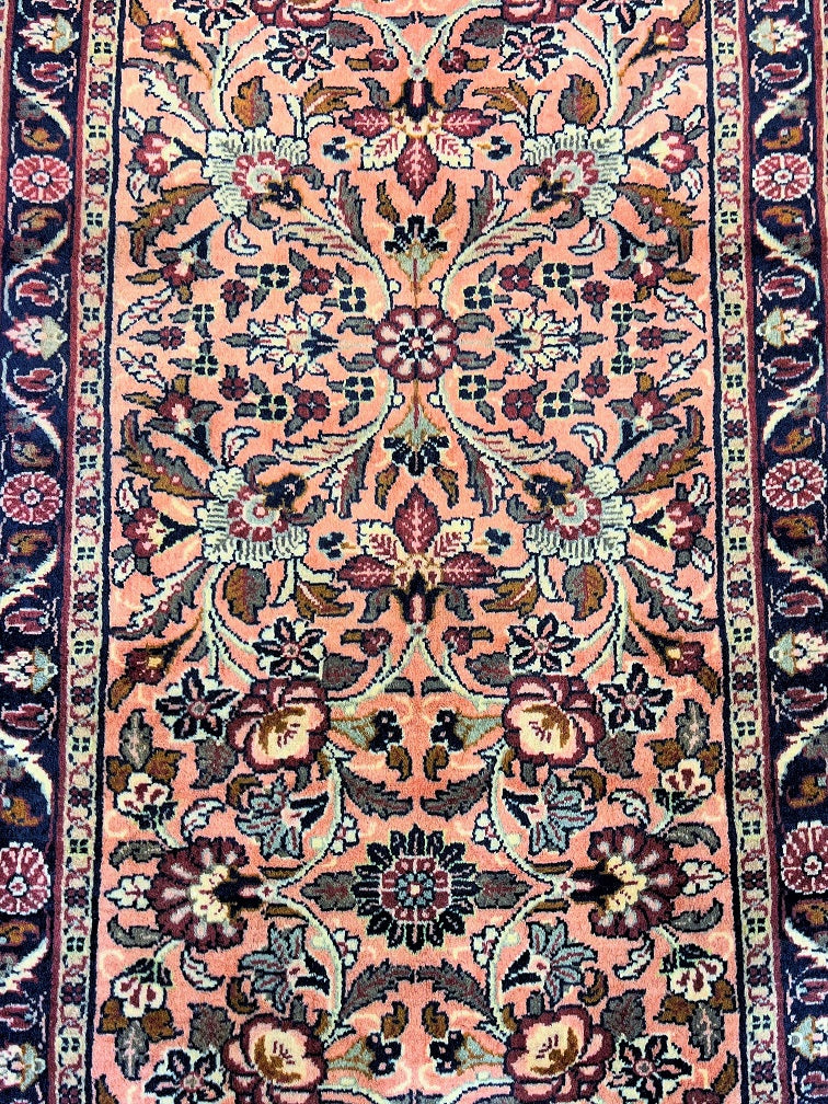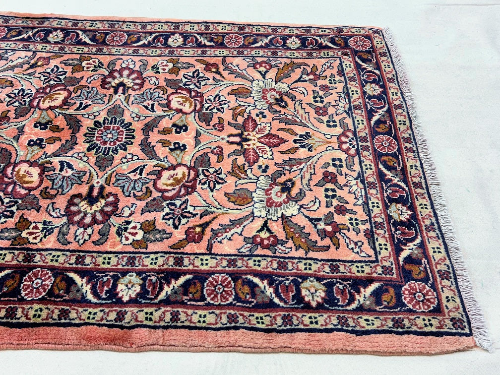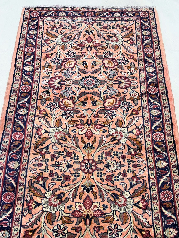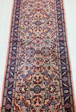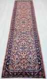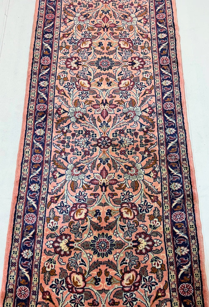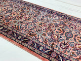 Rare Authentic Hand Knotted Persian Rudbar Hall Runner. Above All It Has A Unique Colour Combination and Design. Salmon Pink, Indigo Blue/Black, Burgundy, Green And Aqua Tone Dyed Using Traditional Methods.