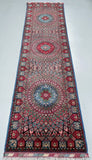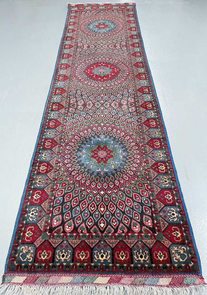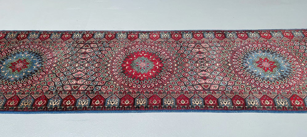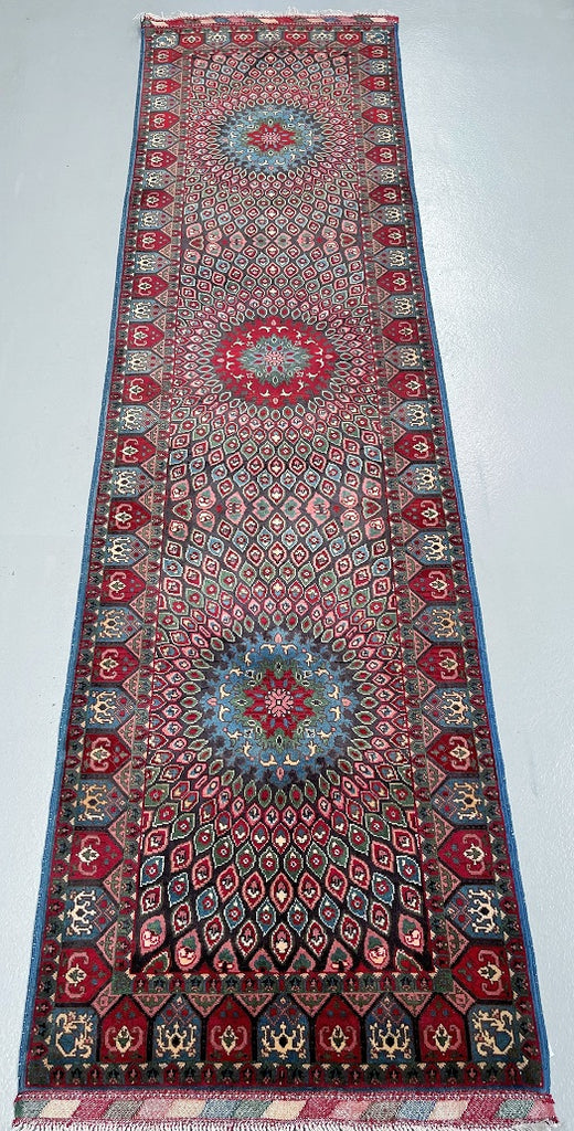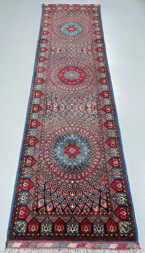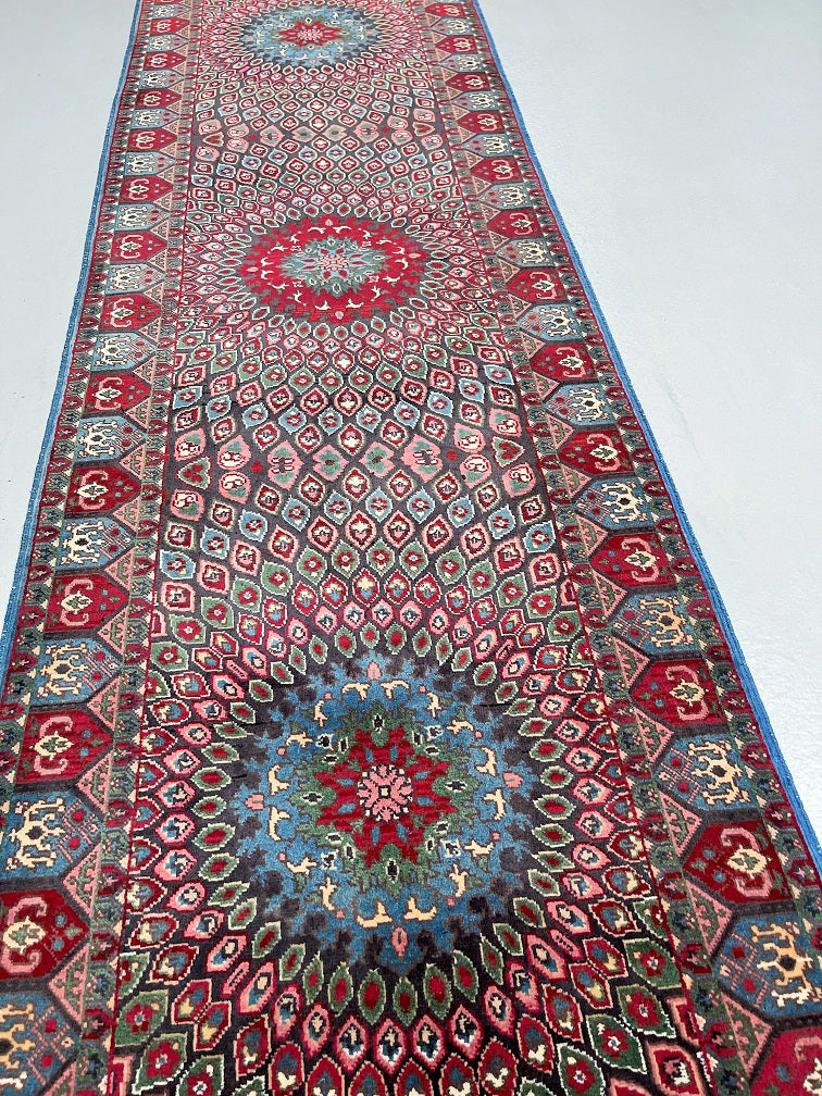 Gorgeous Dome Design Authentic Hand Knotted Afghan Roshnai Hall Runner. Looks like A Painting on The Floor. It Is Pure Hand Spun Wool Pile On Cotton Base. Blue, Beige, Maroon and Green Tone Dyed Using Traditional Methods (Vegetable Dyes). Last Of True Woven Nomadic Art.