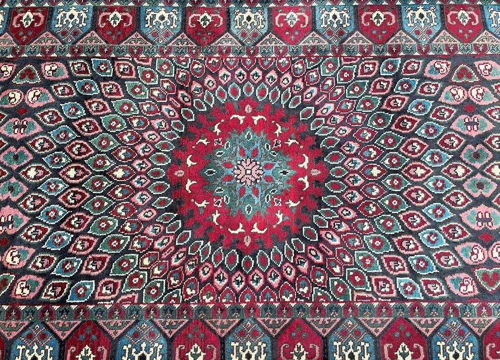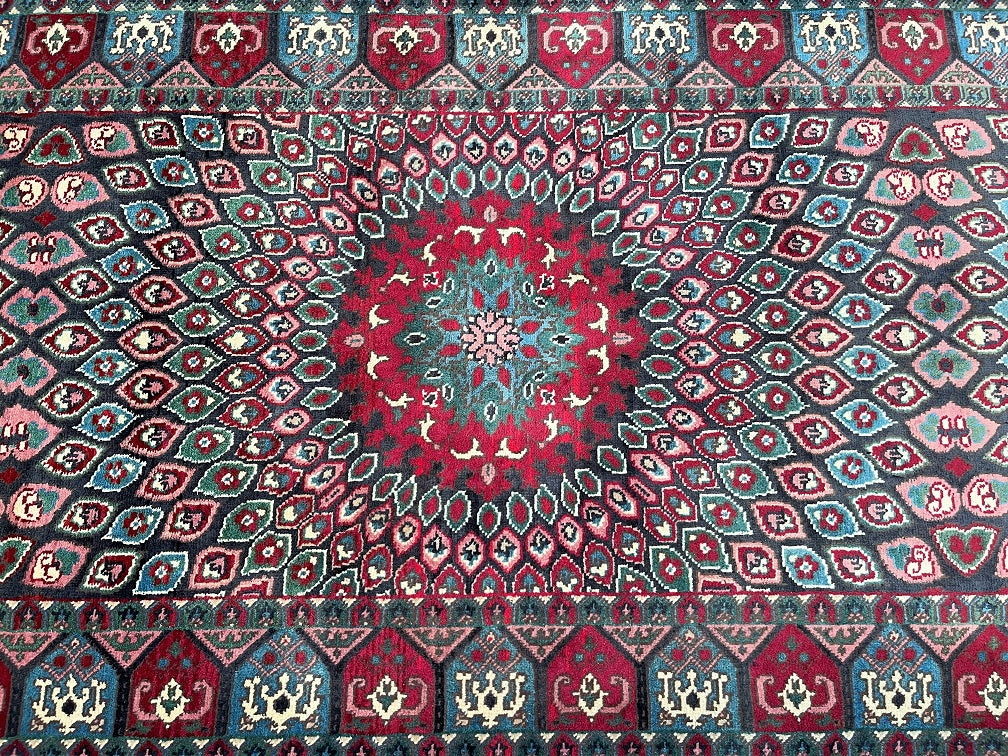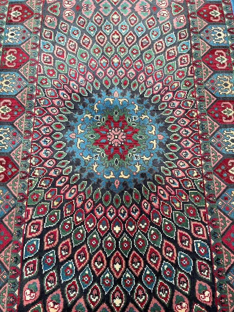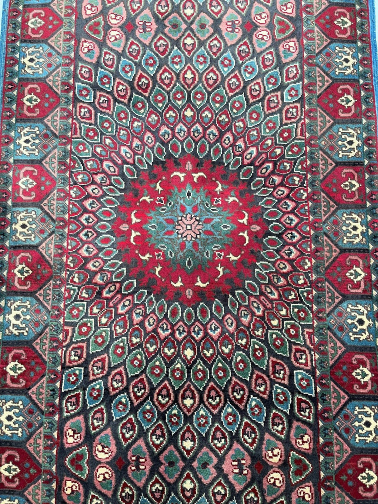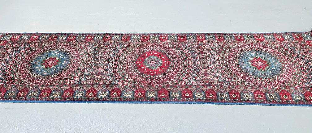 Gorgeous Dome Design Authentic Hand Knotted Afghan Roshnai Hall Runner. Looks like A Painting on The Floor. It Is Pure Hand Spun Wool Pile On Cotton Base. Blue, Beige, Maroon and Green Tone Dyed Using Traditional Methods (Vegetable Dyes). Last Of True Woven Nomadic Art.