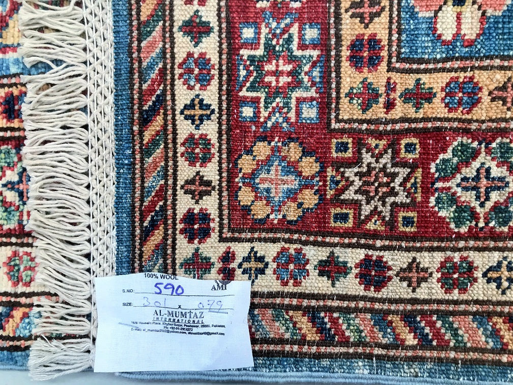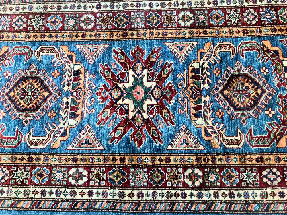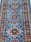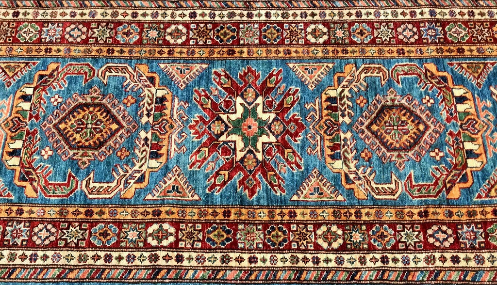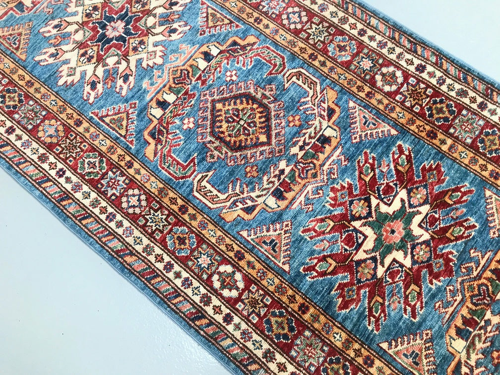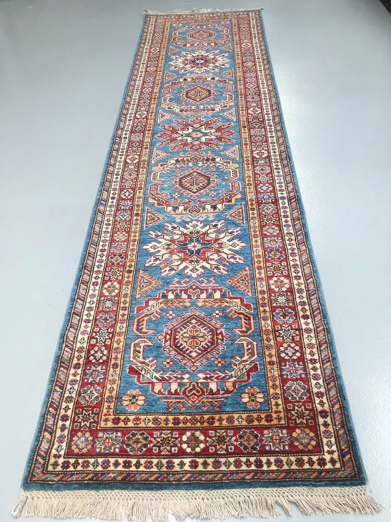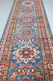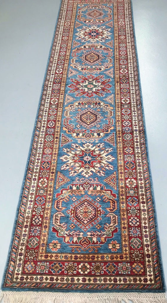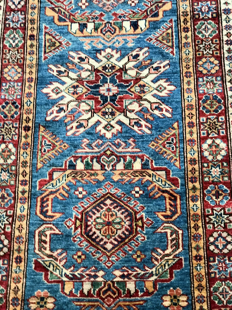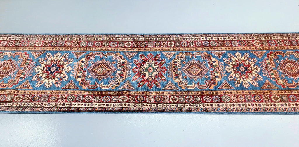 Amazing Handmade Afghan Super Kazak Hall Runner. Above All It Is Pure Hand Spun Wool Pile On Cotton Base. Stunning Light Blue, Gold, Beige and Maroon Tone Dyed Using Traditional Methods (Vegetable Dyes). Last Of True Woven Tribal Art.
