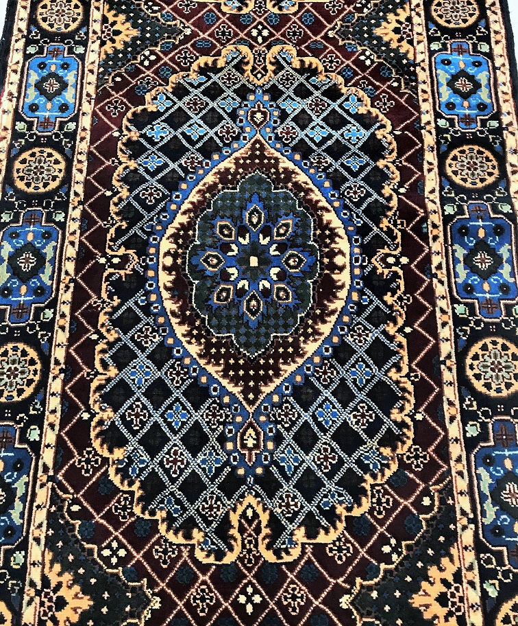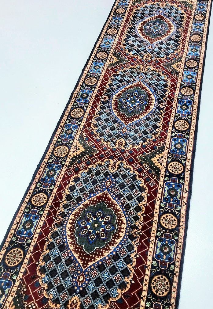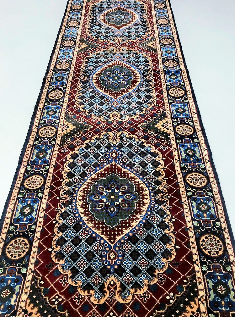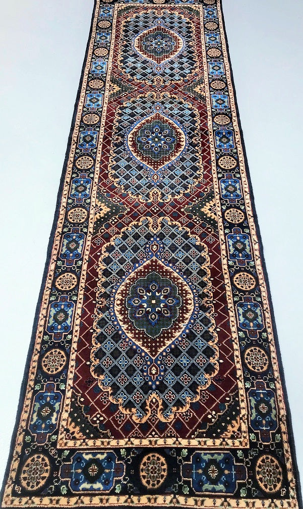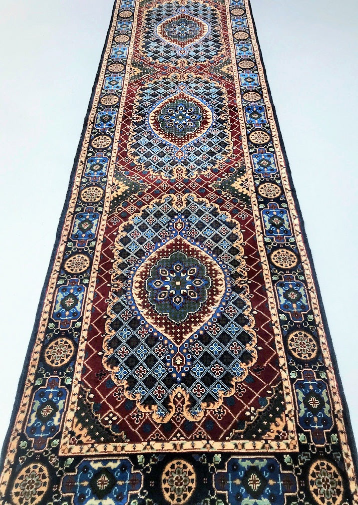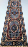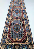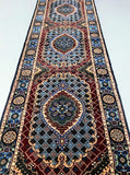 Traditional Design Afghan Khamyab Hall Runner. It Is Pure Hand Spun Wool Pile On Wool Base. Light Blue, Beige, Burgundy and Indigo Blue Tones Dyed Using Traditional Methods (Vegetable Dyes). Last Of True Woven Nomadic Art.