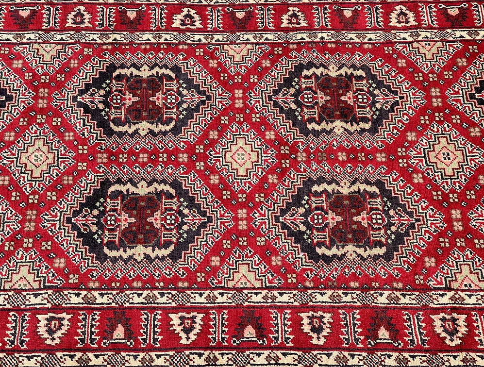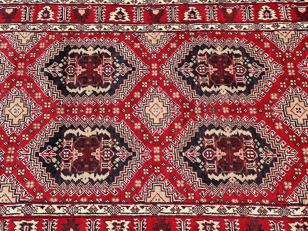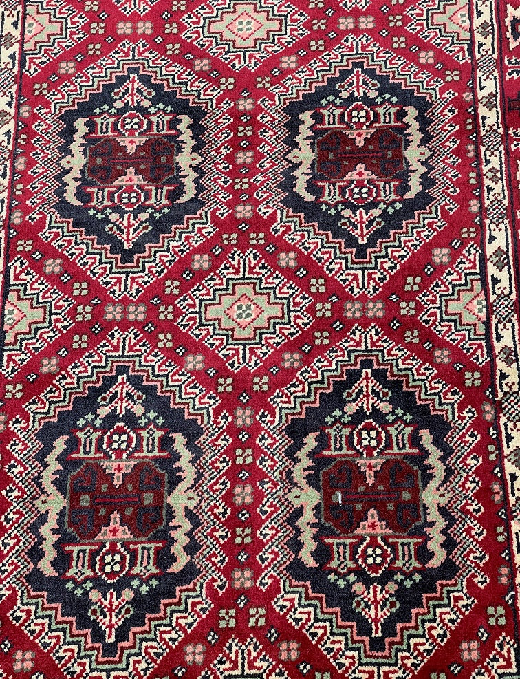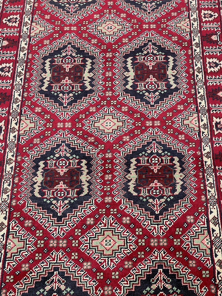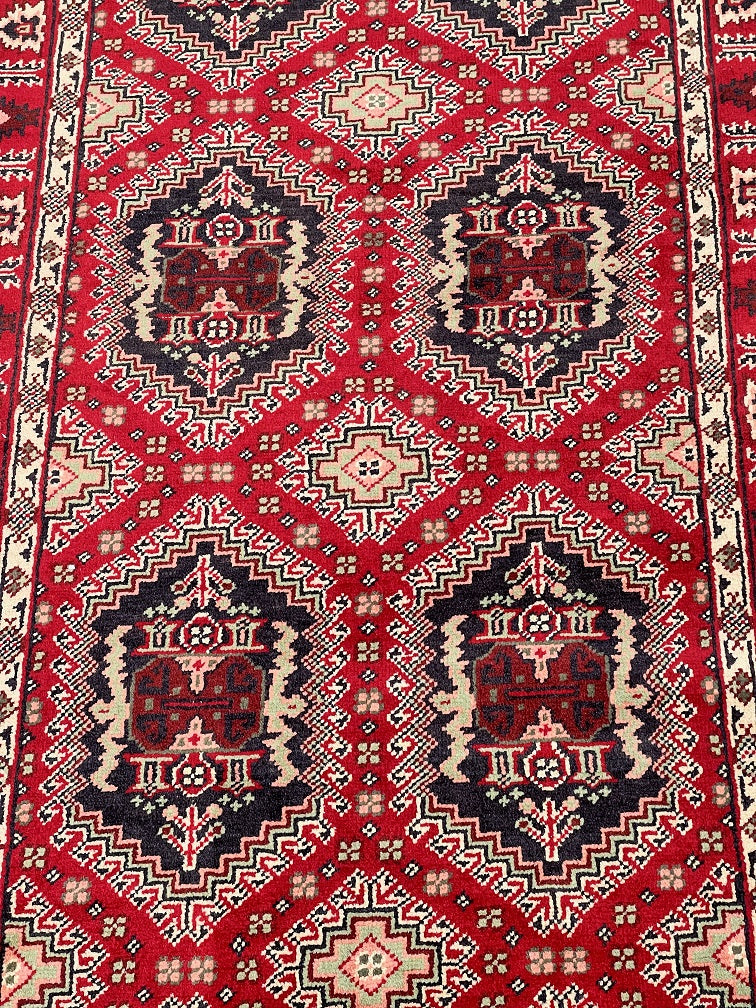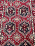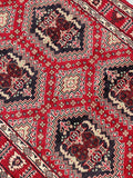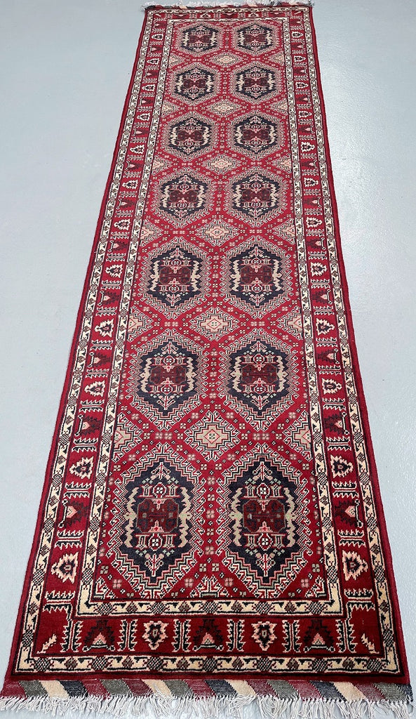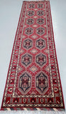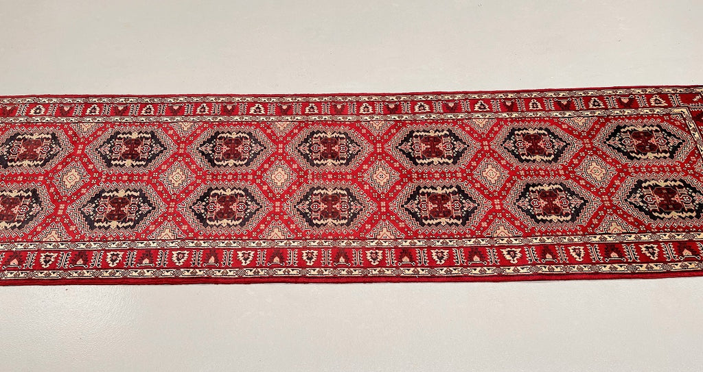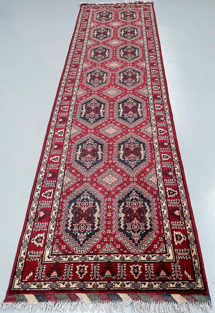 Fine Authentic Hand Knotted Tribal Afghan Roshnai Hall Runner. Above All It Has A Lamb’s Wool Pile On Cotton Base. It Also Has A Maroon/Burgundy Tone Dyed Using Traditional Methods. This Runner Would Look Fantastic On Wooden Floor Board.