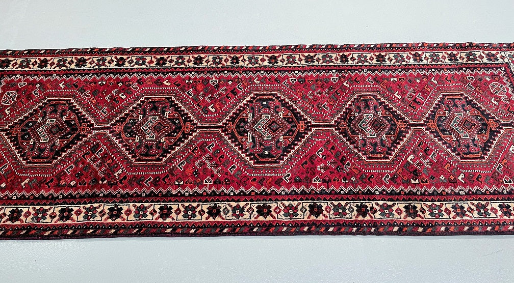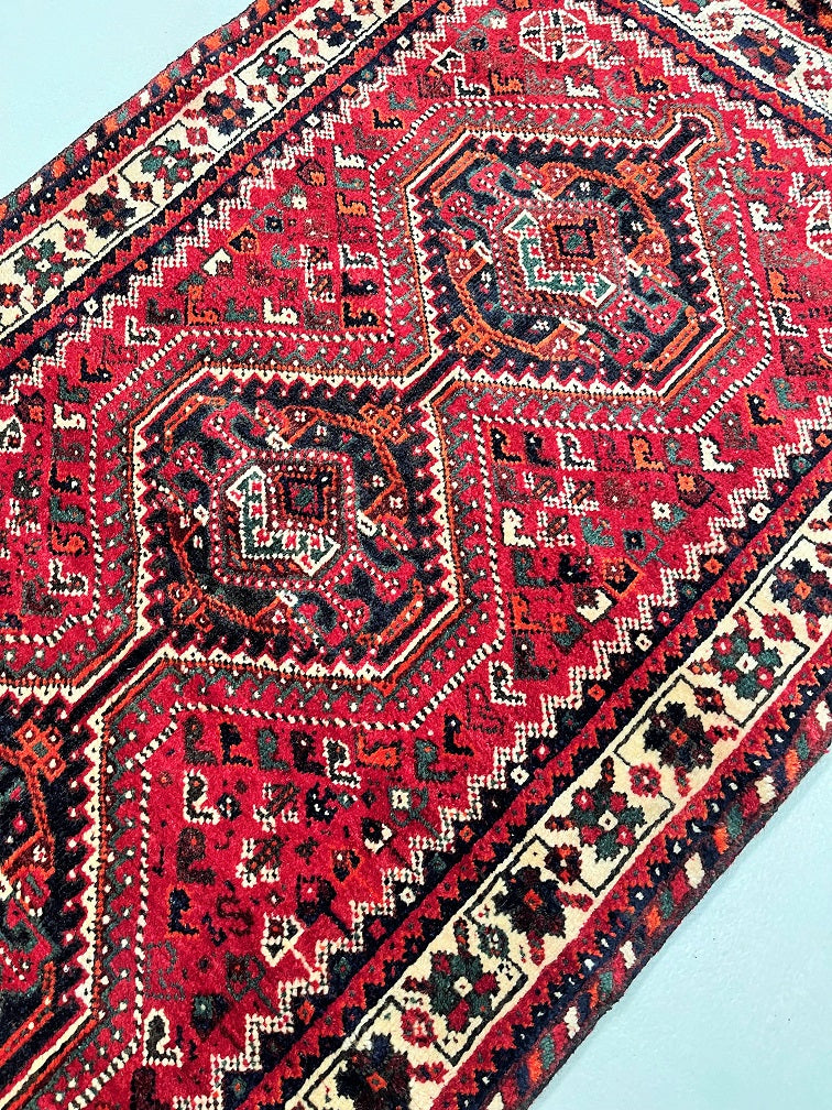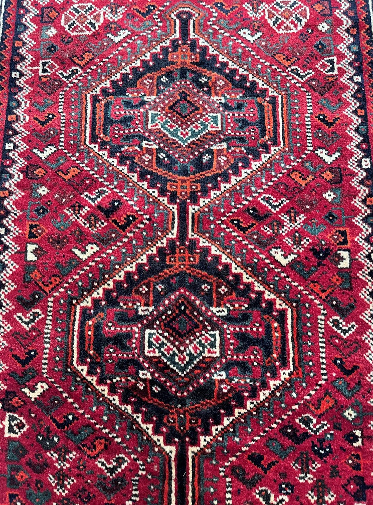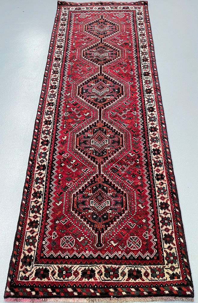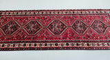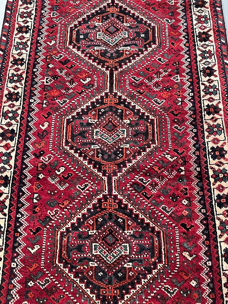 Collectable Authentic Handmade vintage Persian Shiraz Hall Runner. Above All It Has A Pure Hand Spun Wool Pile On Wool Base. Rustic Red, Black, Beige, Orange And Green Tone Dyed Using Traditional Methods.