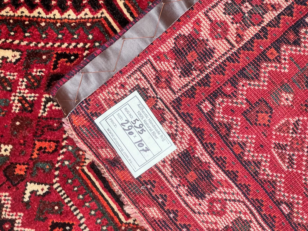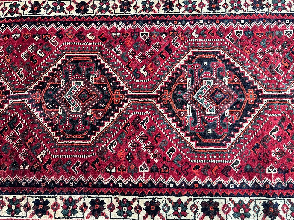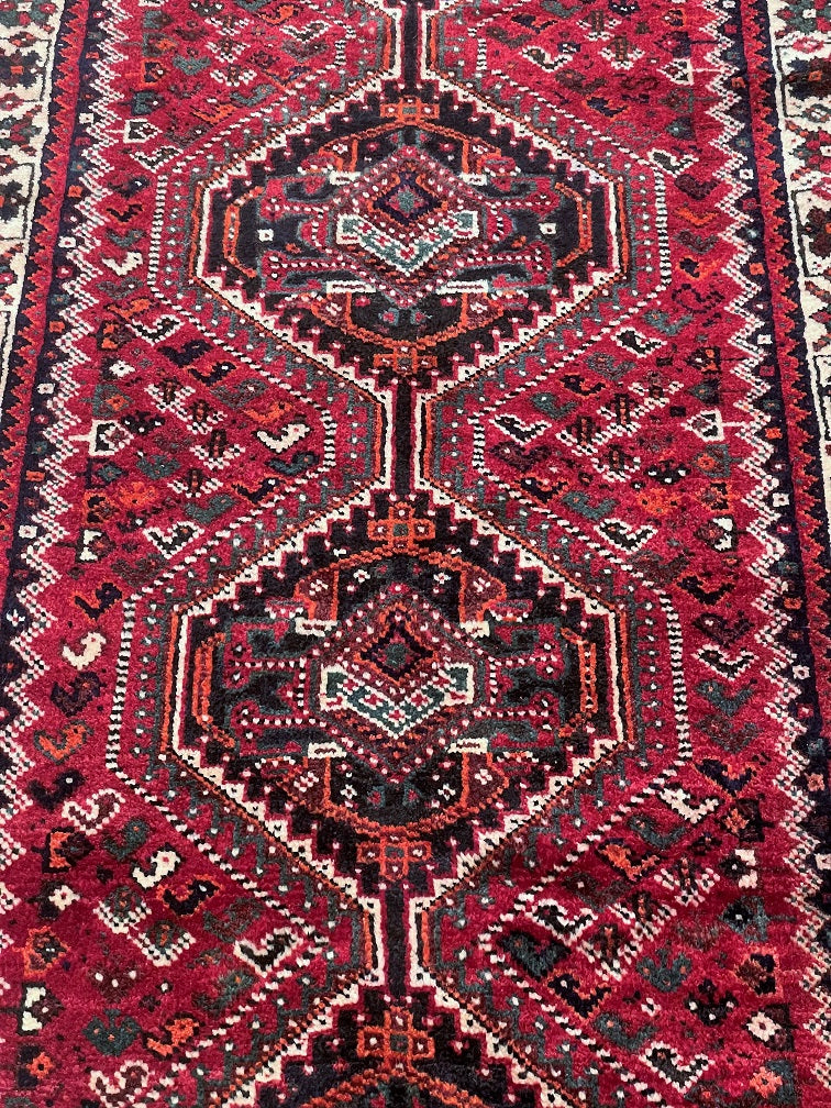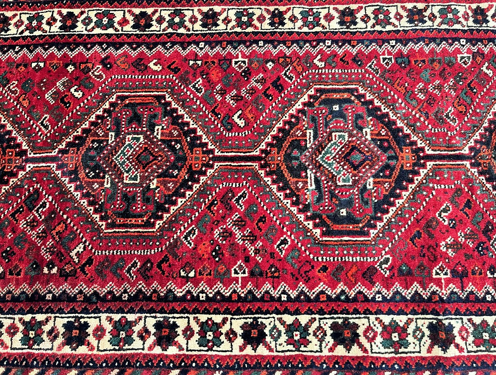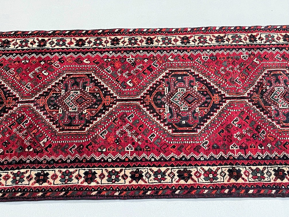 Collectable Authentic Handmade vintage Persian Shiraz Hall Runner. Above All It Has A Pure Hand Spun Wool Pile On Wool Base. Rustic Red, Black, Beige, Orange And Green Tone Dyed Using Traditional Methods.