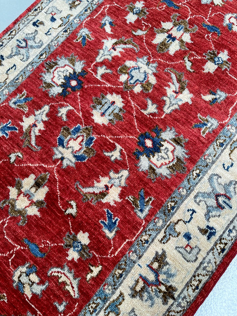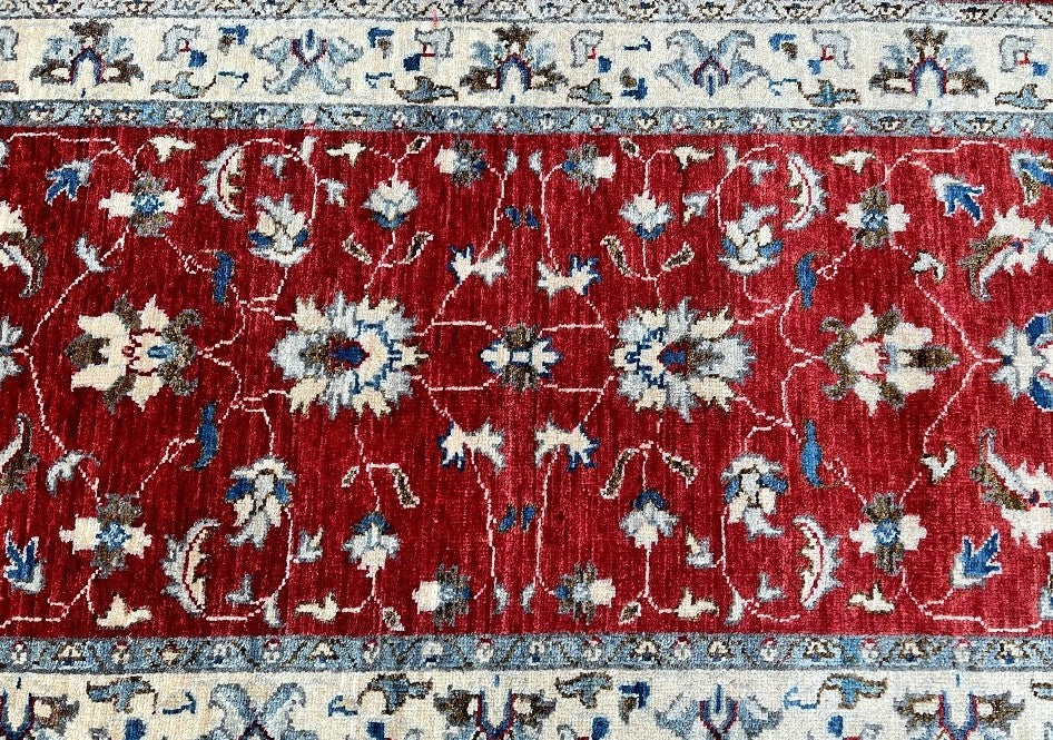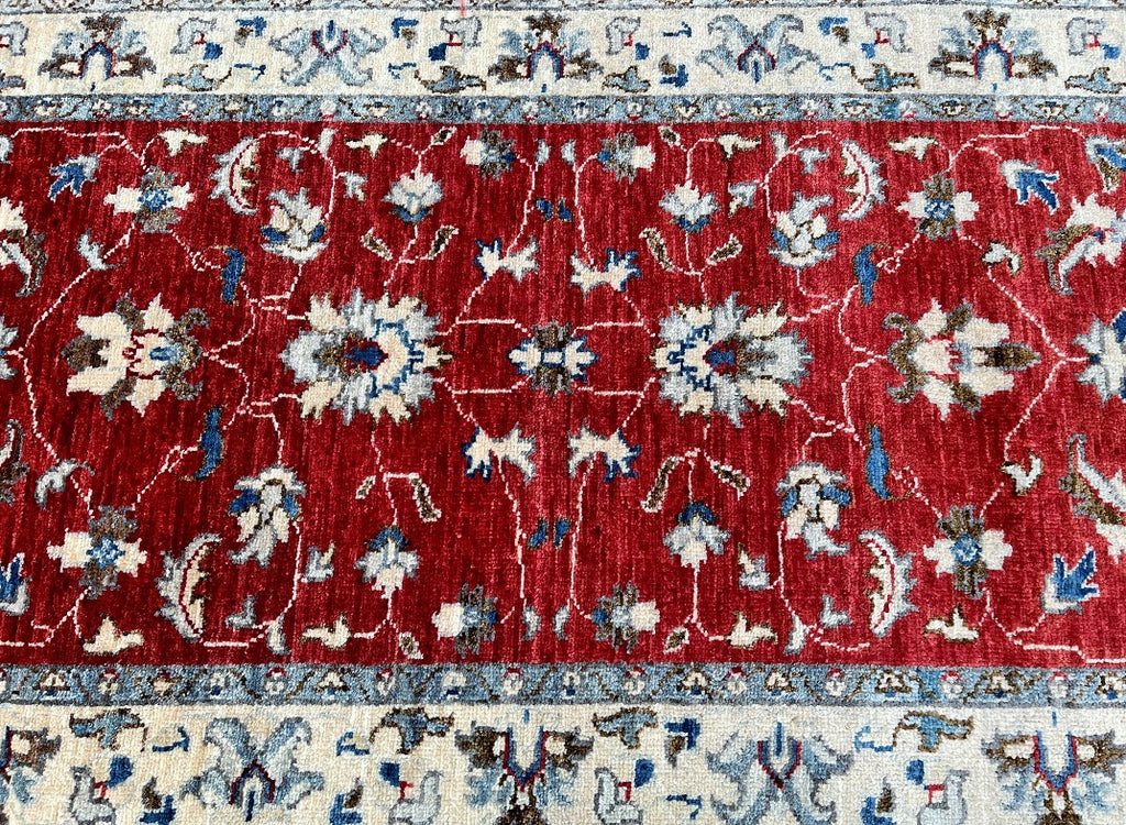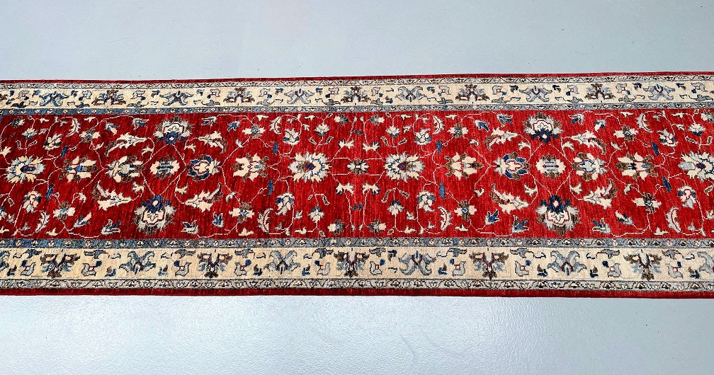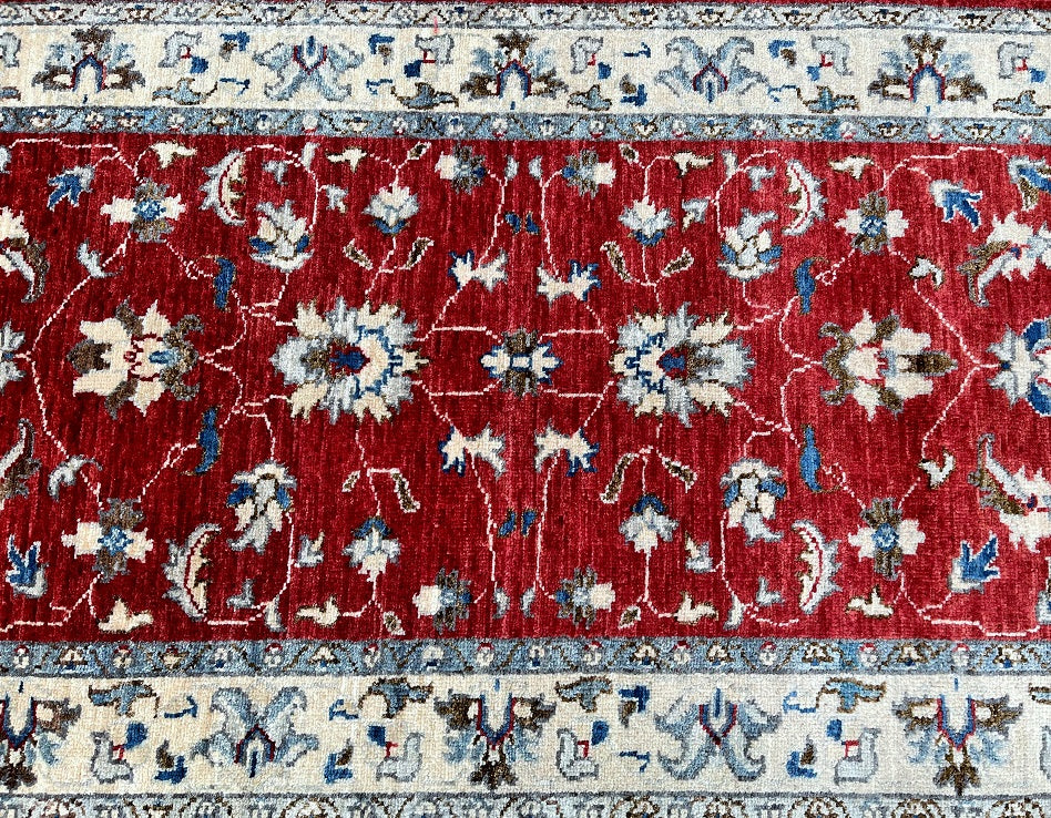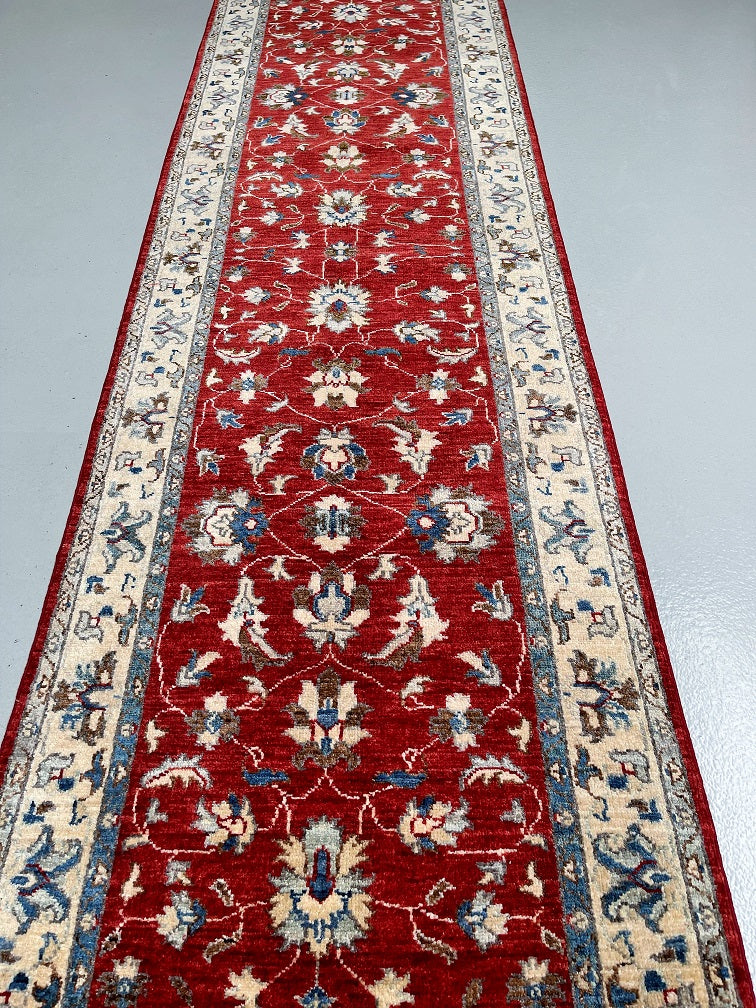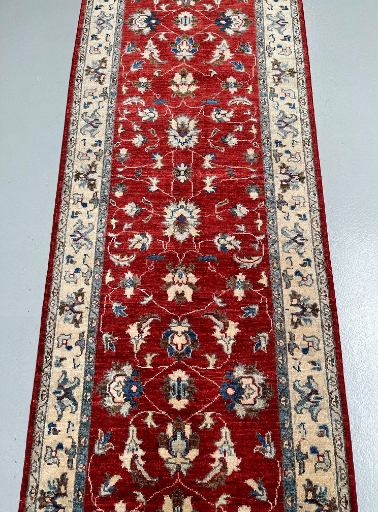 Decorative Ziegler Design Handmade Afghan Chobi Hall Runner. Above All It Is Pure Hand Spun Wool Pile On Cotton Base. Red, Beige, Olive Green And Blue Tone Dyed Using Traditional Methods (Vegetable Dyes). Last Of True Woven Nomadic Art.